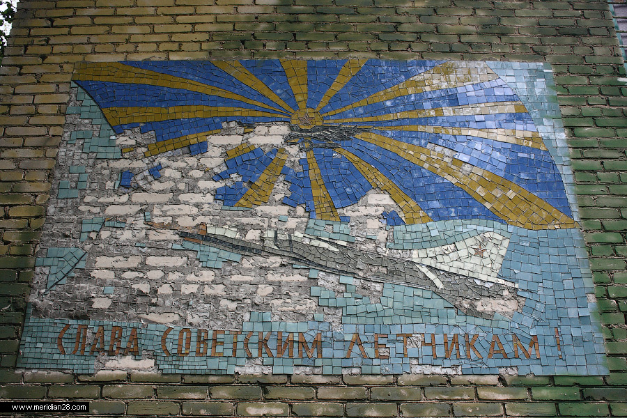 Мозаика, прославляющая советских летчиков. Во времена активной деятельности аэродрома, к сожалению, здесь часто случались аварии, в которых гибли летчики. Были случаи, когда экипаж ценой своей жизни отводил неисправную машину от деревень, которых достаточно много в том районе.