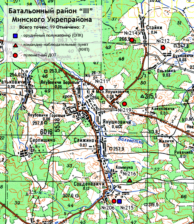 Следующим, заинтересовавшим нас районом МиУРа, стал батальонный район обороны «III». Находится он в пятнадцати километрах к западу от Логойска. По современному состоянию сооружений видно, что повоевать им пришлось — все ДОТы взорваны.