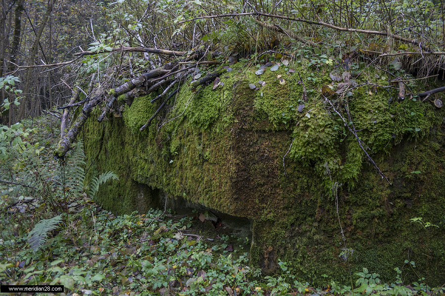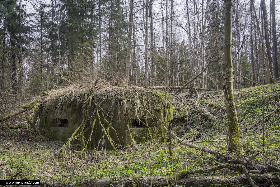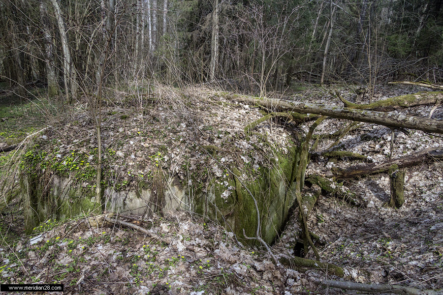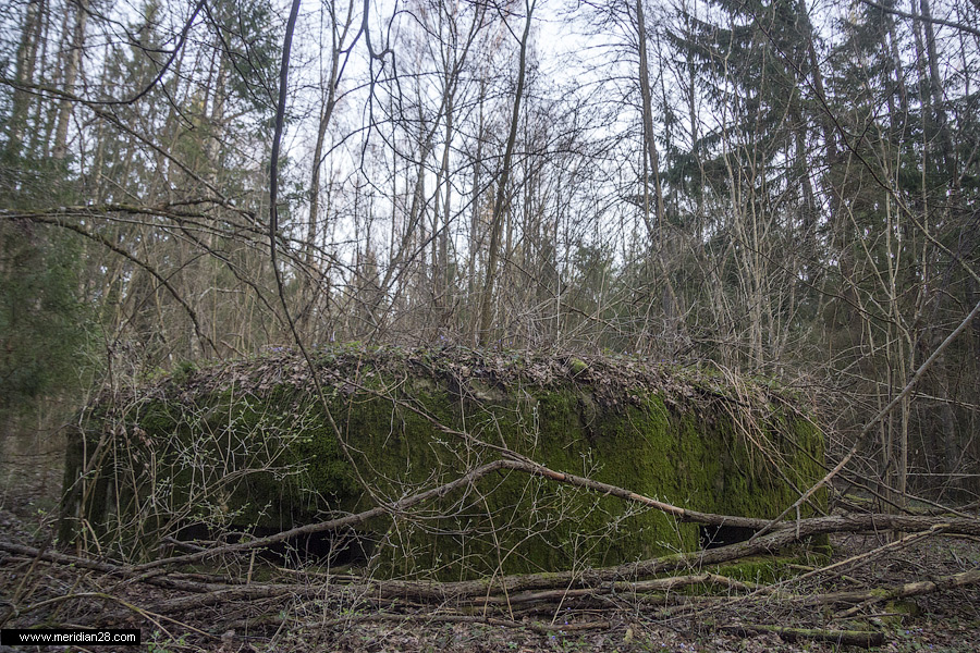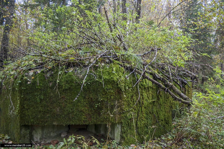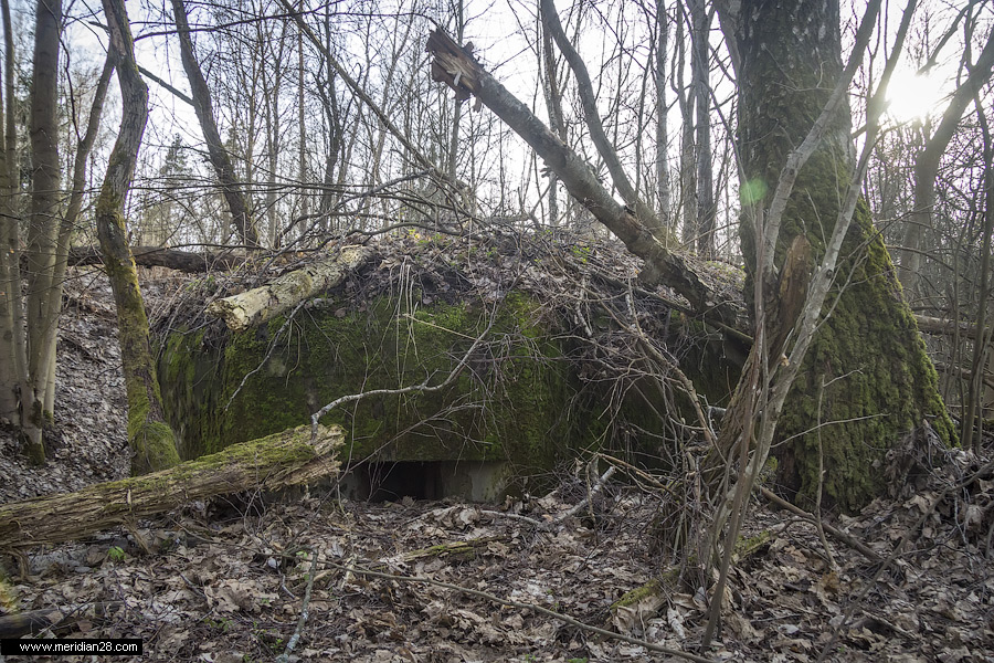 Далее мы отправились на север, за деревню Жуковка. Судя по всем картам, фортсооружение находилось глубоко в лесу. Поиски подобных огневых точек очень затруднительны, поскольку нет никаких точных привязок или ориентиров для локализации ДОТа. Полагаться приходится на логику и собственное чутье. В этот раз нам повезло. Огневая точка нашлась на склоне небольшого естественного холма. С ходом времени она сильно обросла мхом. Поваленные деревья создавали дополнительную маскировку. Прямо от входа в ДОТ ведет недлинная траншея, которая заканчивается ямой. Вероятно, раньше здесь был оборудован блиндаж.