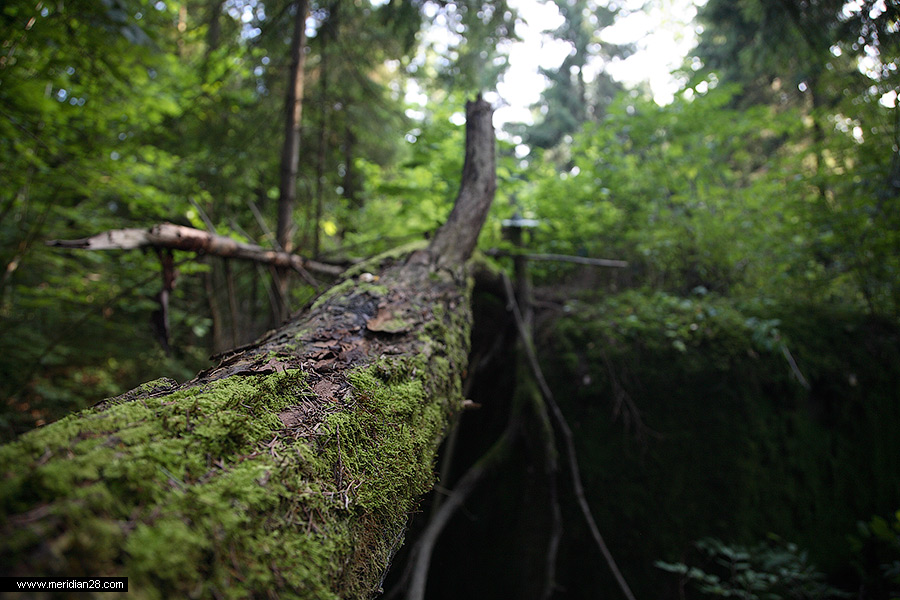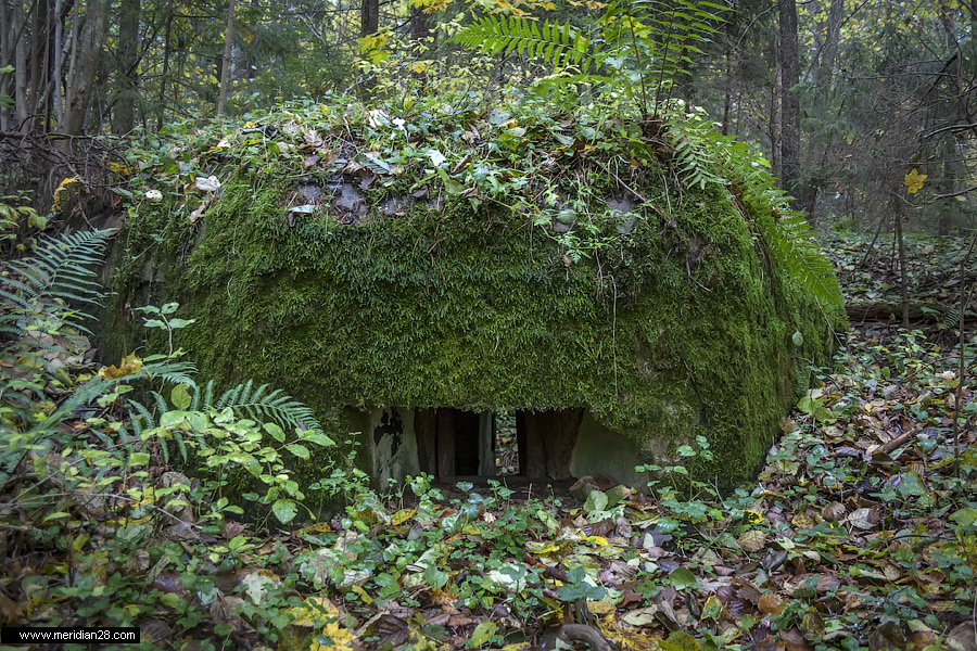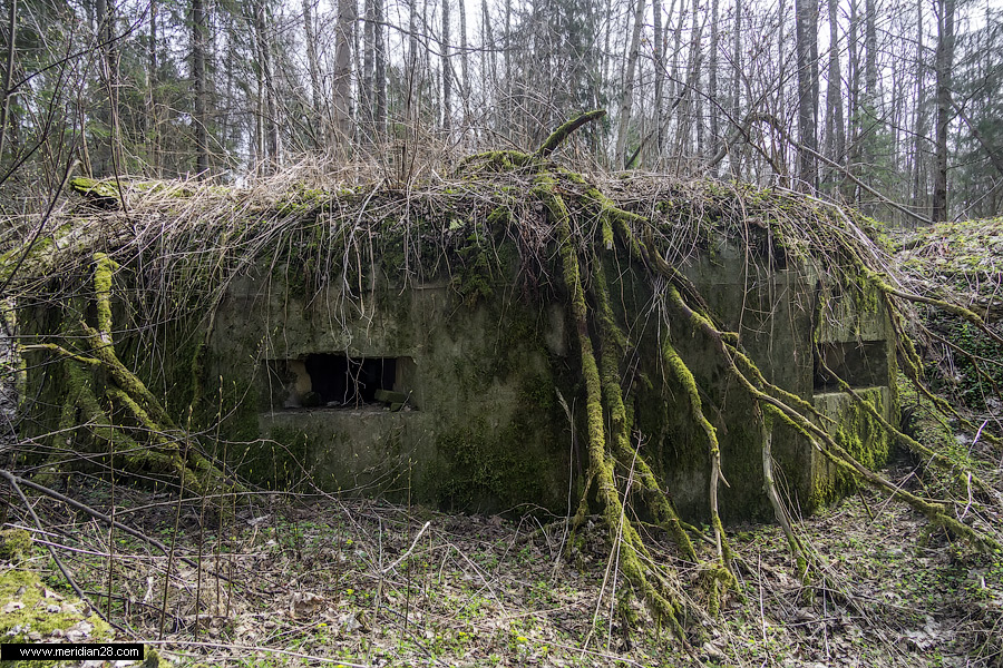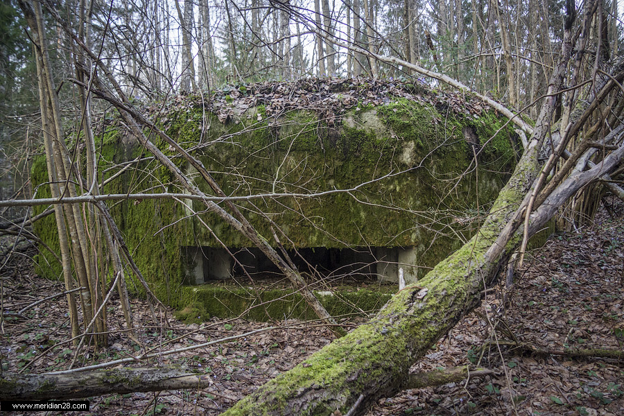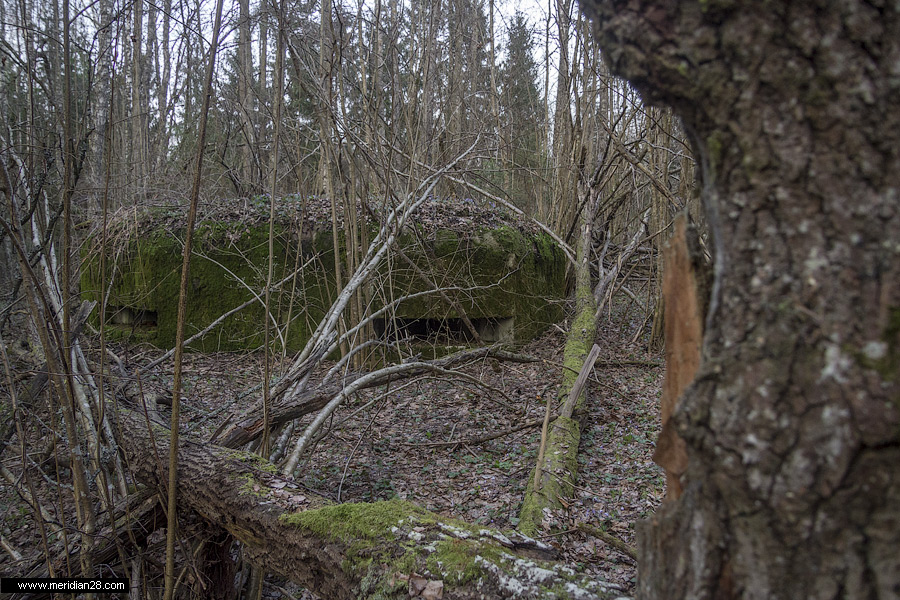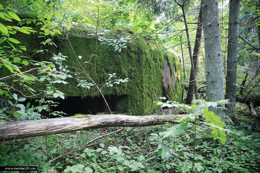 Далее мы отправились на север, за деревню Жуковка. Судя по всем картам, фортсооружение находилось глубоко в лесу. Поиски подобных огневых точек очень затруднительны, поскольку нет никаких точных привязок или ориентиров для локализации ДОТа. Полагаться приходится на логику и собственное чутье. В этот раз нам повезло. Огневая точка нашлась на склоне небольшого естественного холма. С ходом времени она сильно обросла мхом. Поваленные деревья создавали дополнительную маскировку. Прямо от входа в ДОТ ведет недлинная траншея, которая заканчивается ямой. Вероятно, раньше здесь был оборудован блиндаж.