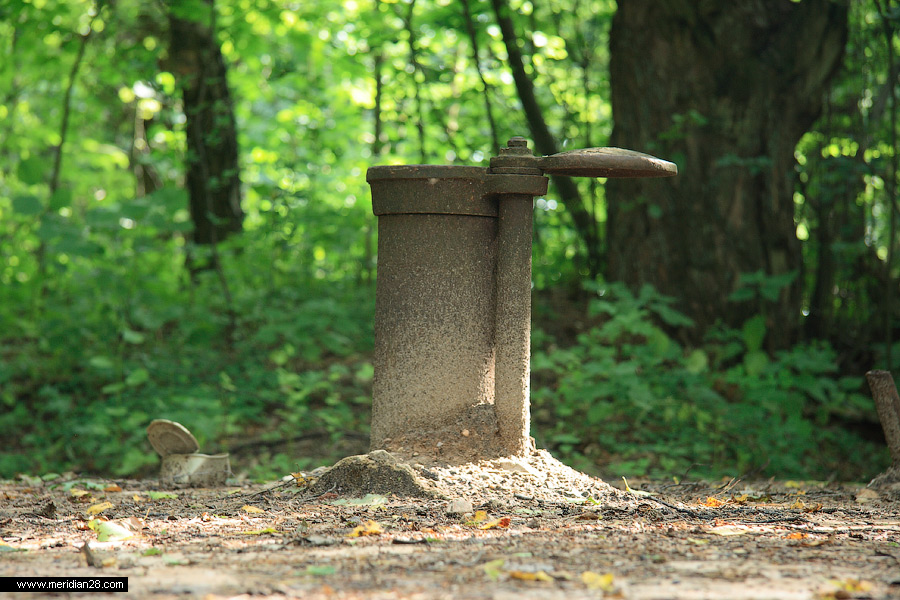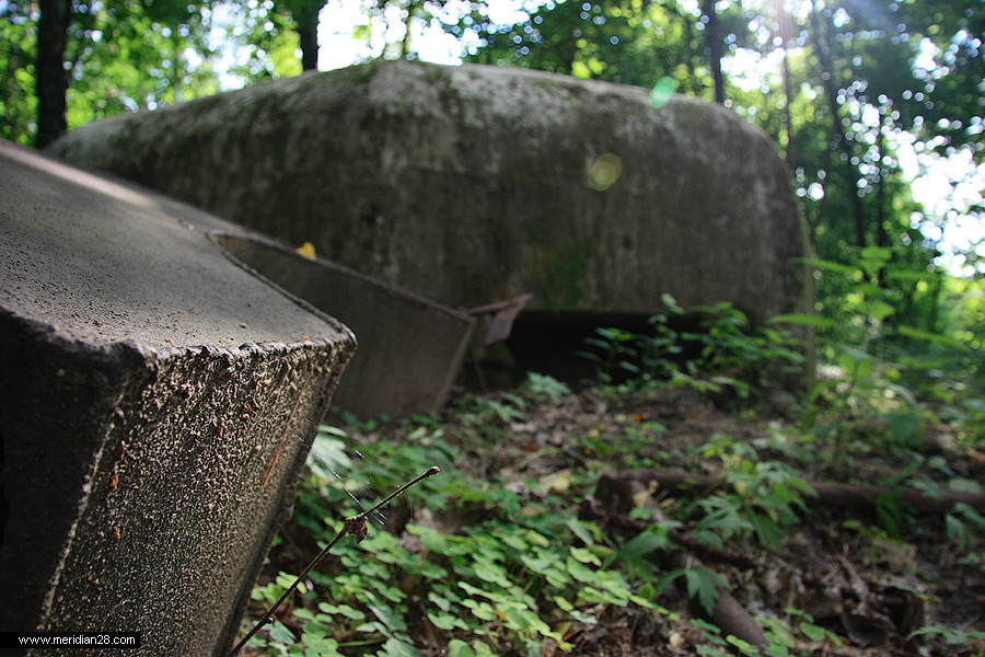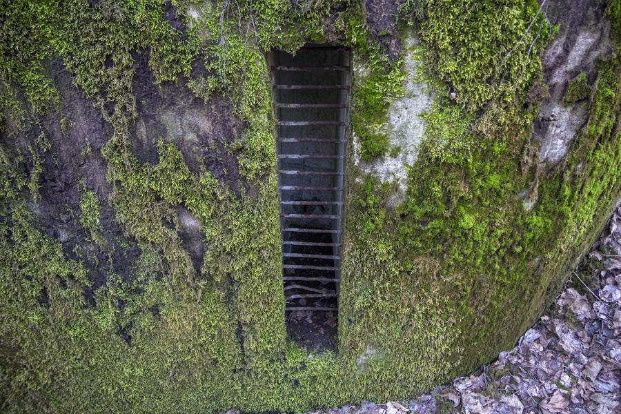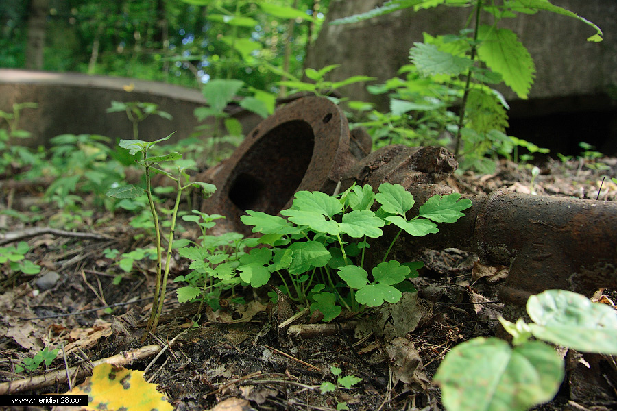Первый ДОТ мы нашли на холме за деревней Лысовичи — трехамбразурная огневая точка № 264 М-2. Стены сооружения обильно поросли мхом, заметить его очень непросто. С тыльной стороны точки различим котлован для монтажа бетонированного дворика — пристройка, служившая для размещения дополнительного боекомплекта, бытовых нужд и укрытия личного состава от пуль и осколков. Забегая вперед, стоит отметить, что ни в одном сооружении БРО «IV» дворики не были обнаружены: видимо, их просто не успели построить, поскольку котлованы с тыла все-таки были у каждого ДОТа. Найденное сооружение отлично сохранилось. Внутри обнаружены все станки, трубы системы охлаждения пулеметов, элементы различных систем жизнеобеспечения.