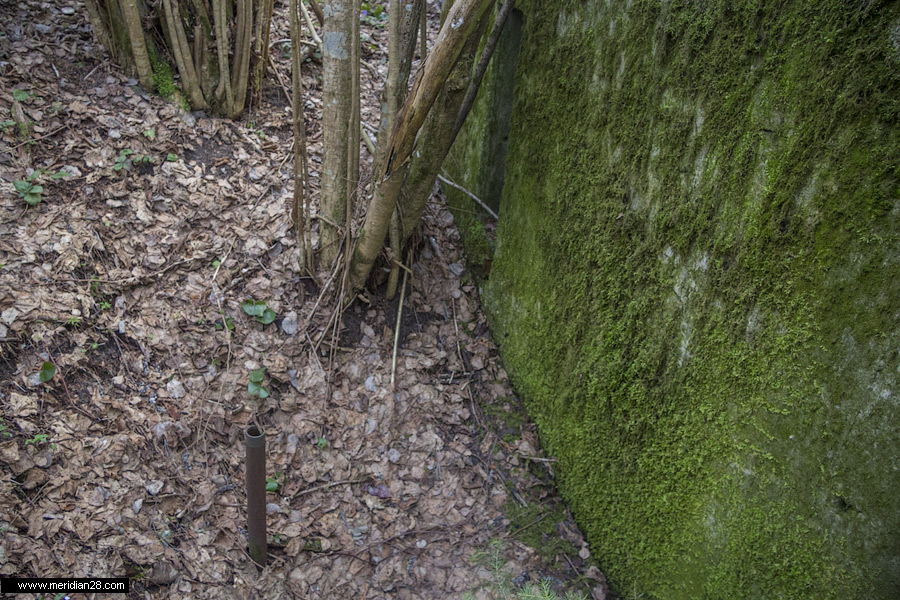 На этом простая часть закончилась, переходим к поиску «сложных» ДОТов. Сооружение было построено к востоку от деревни Лысцевичи (совр. Лысовичи). Класс защиты М-3 — сооружение стояло во второй линии обороны, на стыке батальонных районов обороны «IV» и «V». Найти сооружение оказалось не так-то просто: холм, отмеченный нами изначально, оказался чист. Дальше началось обследование соседних квадратов. В ходе чего была обнаружена траншея, а следом за ней и само сооружение. ДОТ неплохо сохранился. Внутри остались части пулеметных станков и обрывки бронекабелей, торчащих из стен.