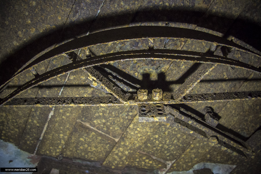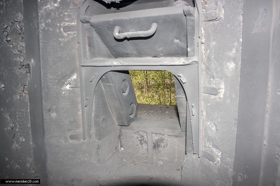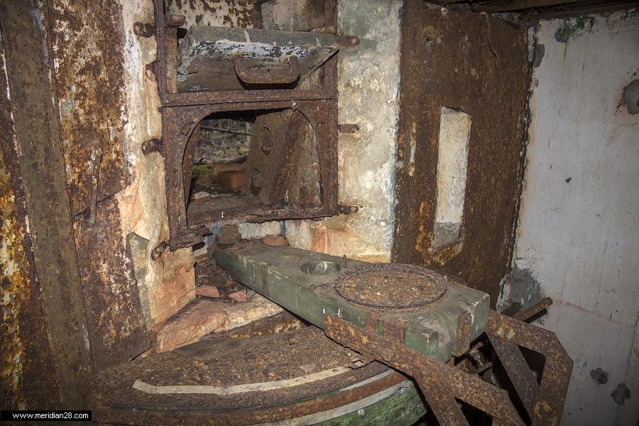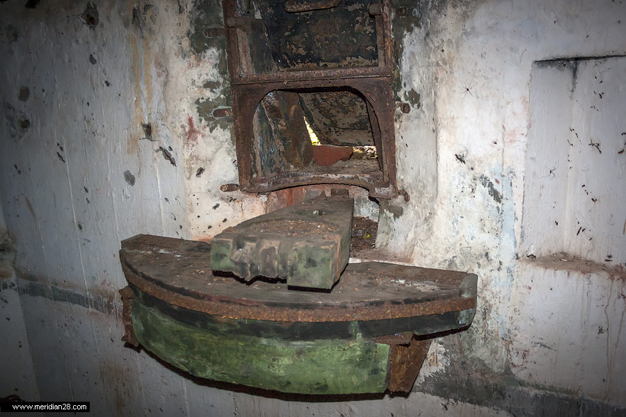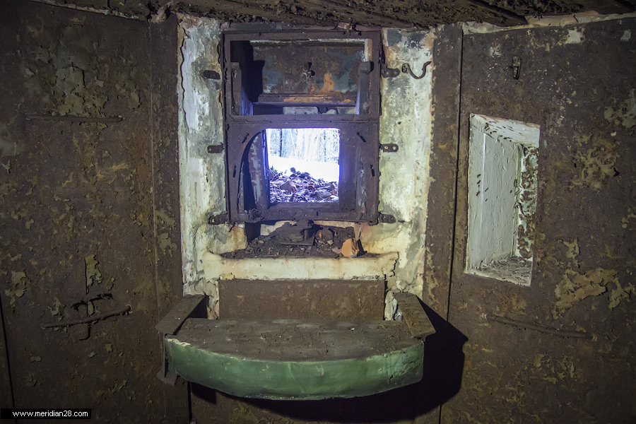Зайдем внутрь сооружения. ДОТ разделен на два каземата. Командирская выгородка отсутствует. Перископ размещен в большом каземате. Сохранились система охлаждения пулемета, пулеметные станки и столы, переговорные трубы. Великолепно сохранившееся сооружение.