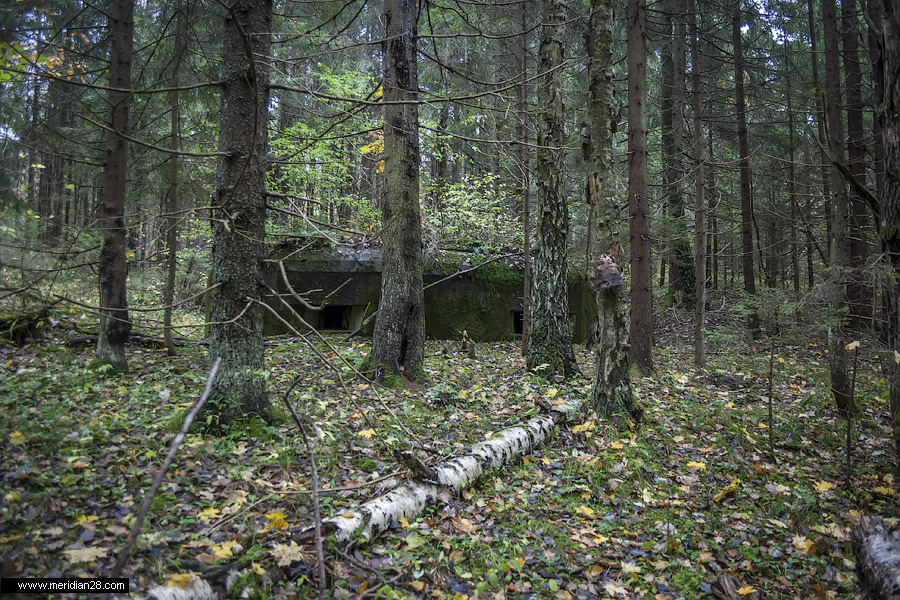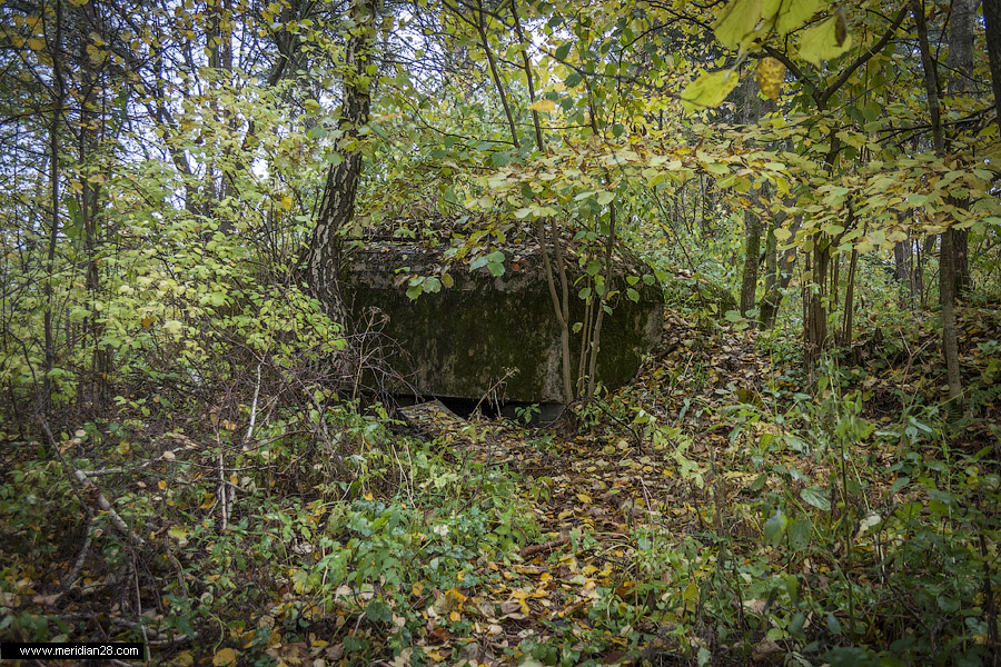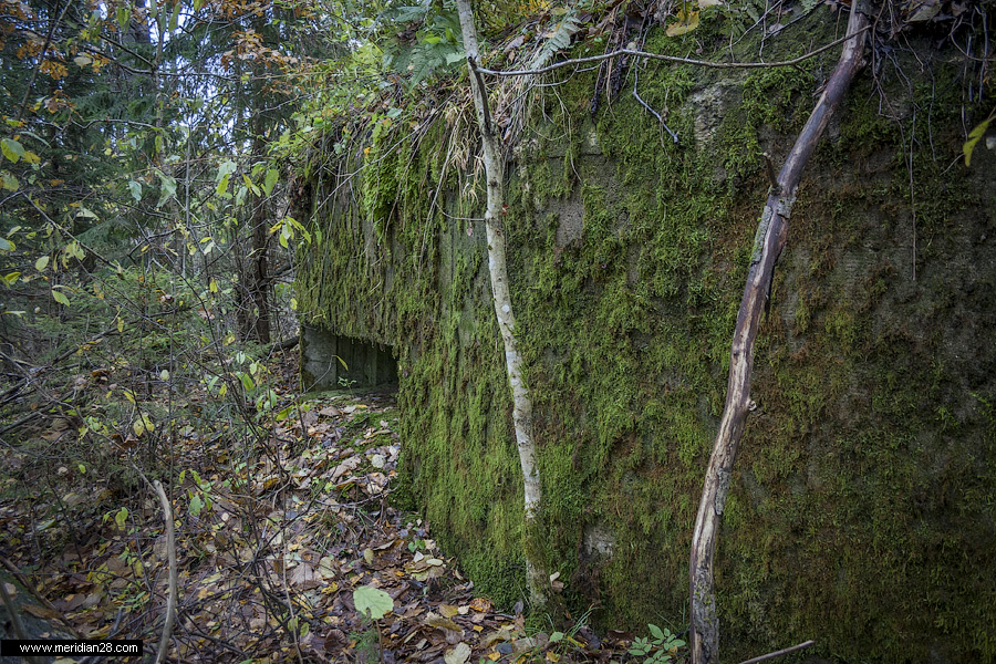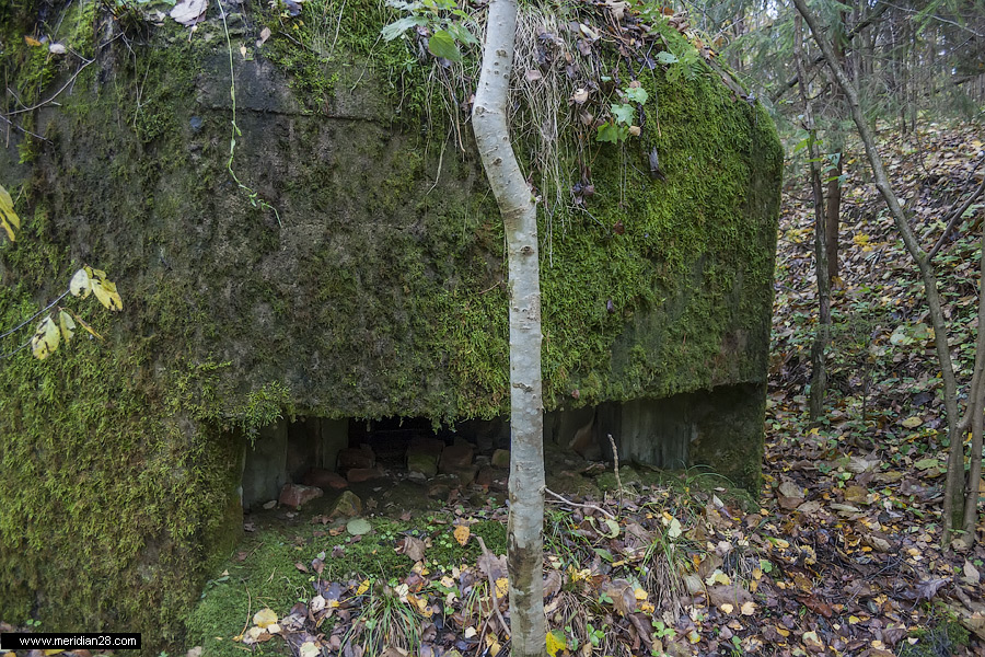ДОТ обнаружился после затянувшихся блужданий по осеннему лесу. Наткнулись на него совершенно случайно, когда уже возвращались к машине. Интересная точка: тип М-3, всего две амбразуры, нет П-образного сквозника, уменьшенная кубатура бетонной кладки. Внутри чисто, сохранилось некоторое оборудование. Имеется скол на напольной стене.