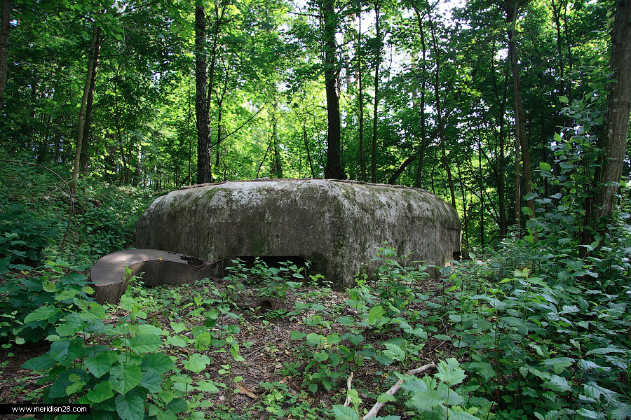Осмотрев спутниковые снимки местности, мы выдвигаемся на поиски двухэтажного ДОТа (КНП № 191). Вариантов было немного: в окрестностях был только один холм, который подходил под описание посадки точки. С него и начали. Искать долго не пришлось — сооружение оказалось именно в том месте, где мы и предполагали. Двухэтажные ДОТы постройки 1934-38 гг. относятся к классу «Б». Они имели дополнительный подземный уровень, в который было вынесено оборудование жизнеобеспечения, также там было оборудовано газоубежище для гарнизона сооружения. Верхний ярус сооружения имел один каземат на две амбразуры и перископную рубку.