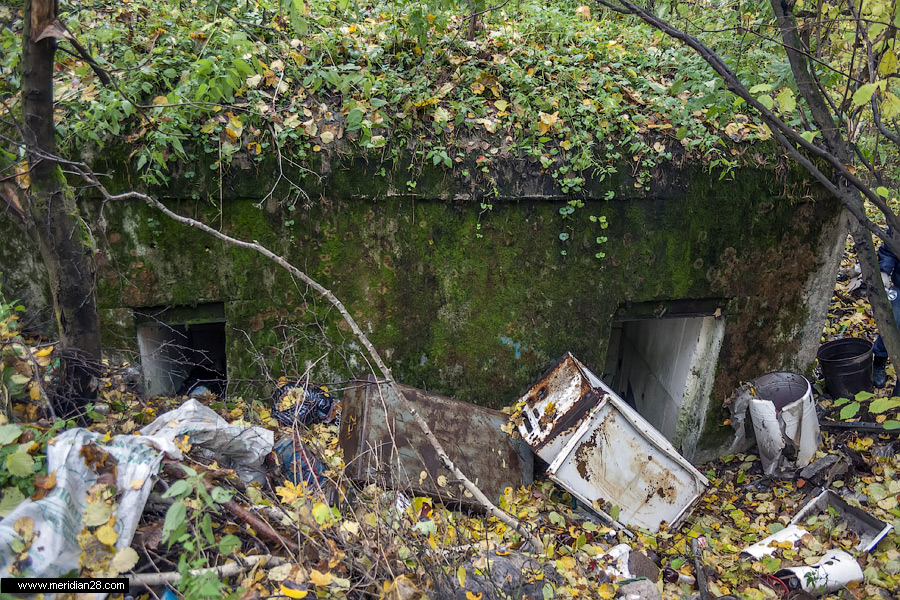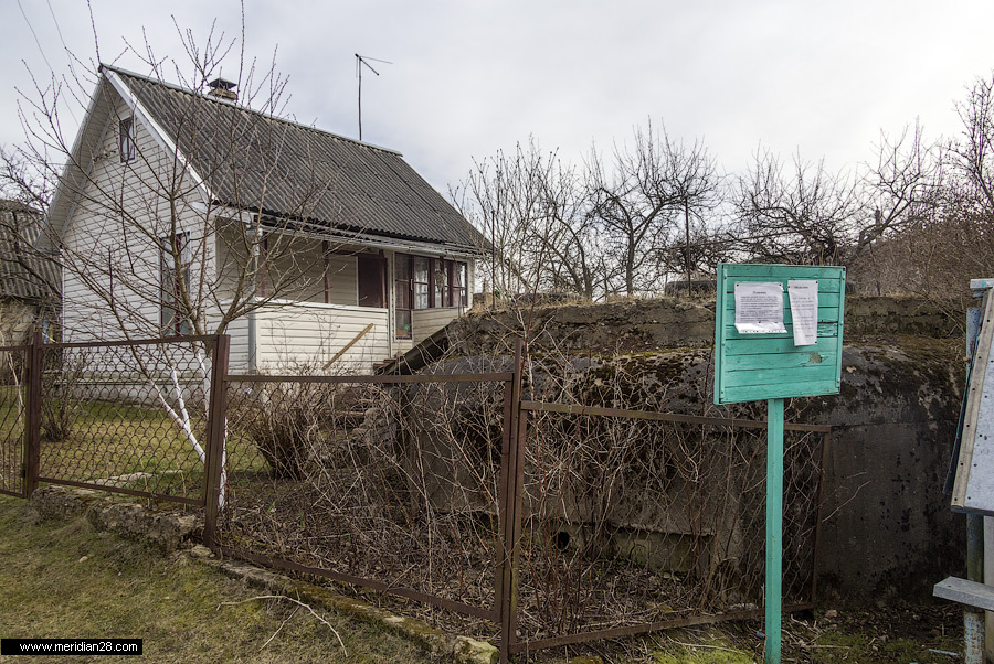 Далее мы следуем к дачным участкам. Здесь, согласно данным архивной карты, должен был быть ДОТ. Паренек, проезжавший мимо на велосипеде, согласился привести нас прямо к ДОТу — им оказался КНП № 187 (класс защиты М-2). Сооружение было превращено в свалку бытовых отходов. Посетить ДОТ мы не решились. Наружный осмотр не показал никаких следов боевых повреждений и других интересных артефактов.