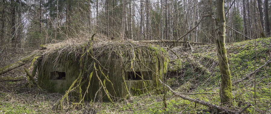 Линейное сооружение нашлось достаточно быстро. ДОТ оказался подтопленным внутри, а так — ничего интересного: стандартная планировка, части оборудования внутри сооружения. Боевых повреждений нет.