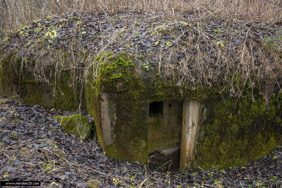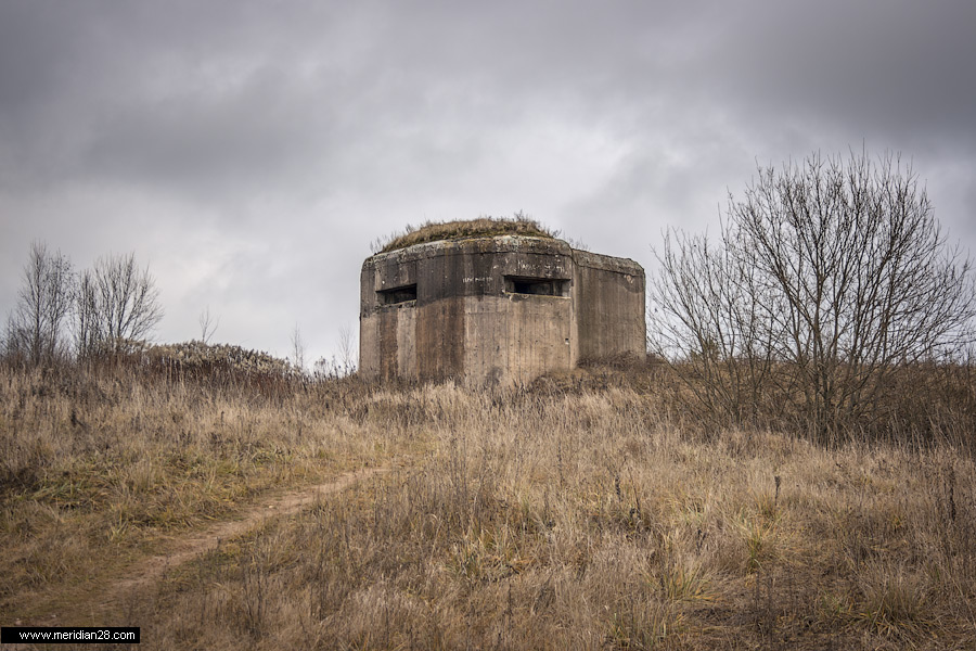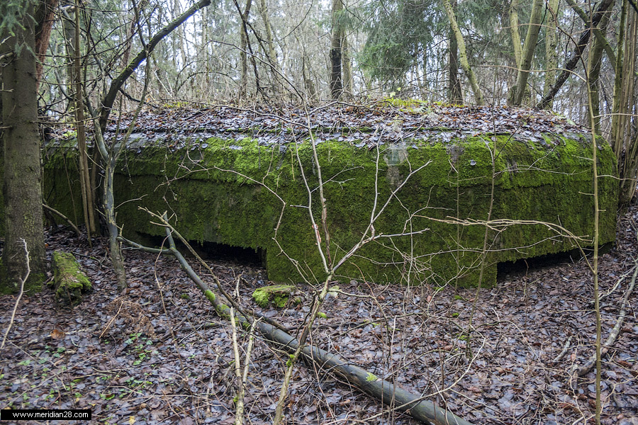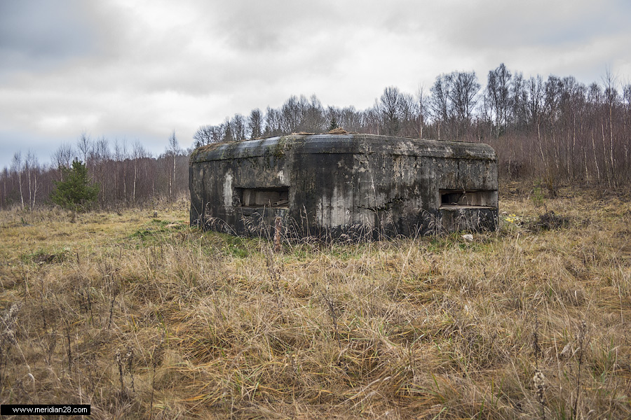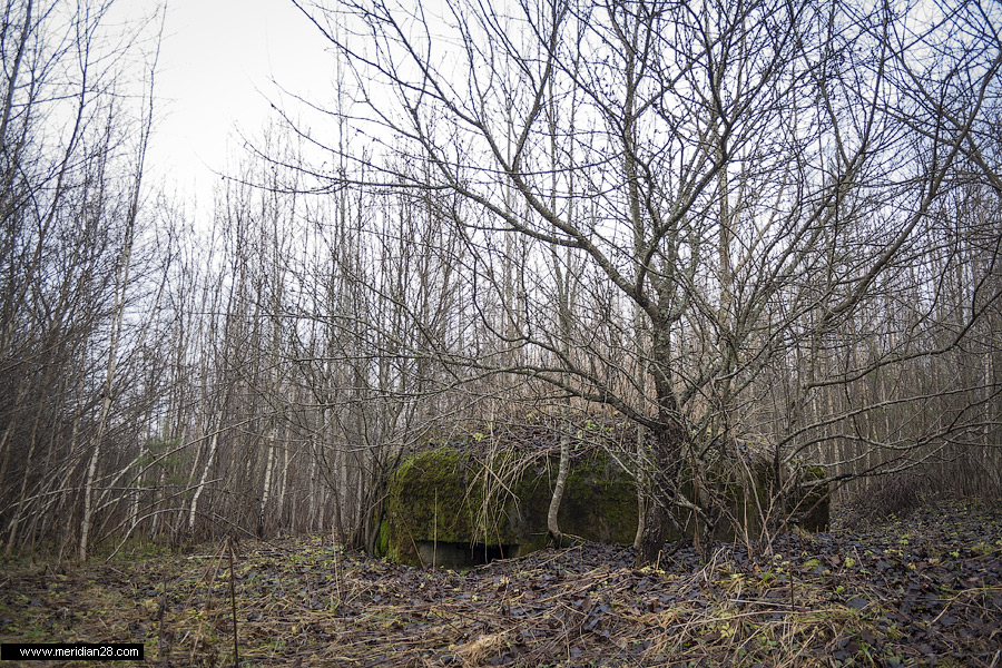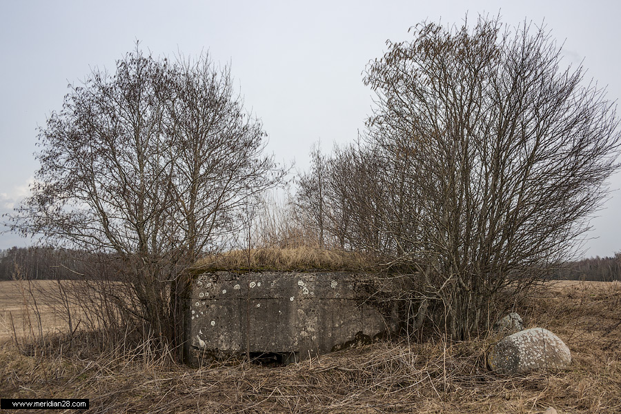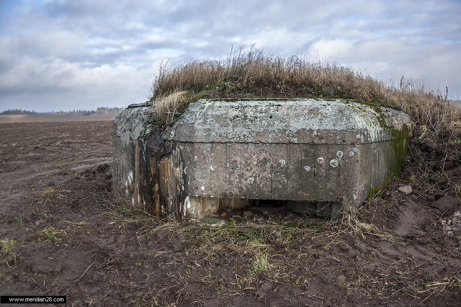 Оставив машину на обочине в деревне, выдвигаемся полевой дорогой, что петляет у бровки леса, на поиски, пожалуй, самого интересного сооружения. Поиски оказались продолжительными, поэтому нам пришлось разделиться и поодиночке рассекать по лесной чащобе. На поиски ушло около получаса. Найденный нами ОПК № 173 — это двухамбразурная огневая точка, вооруженная двумя