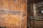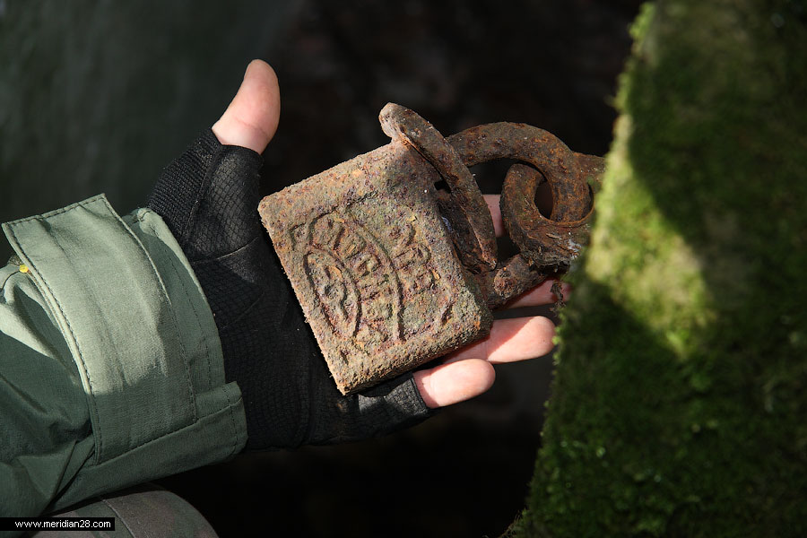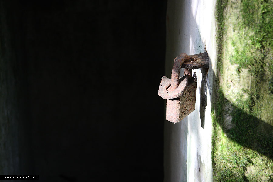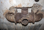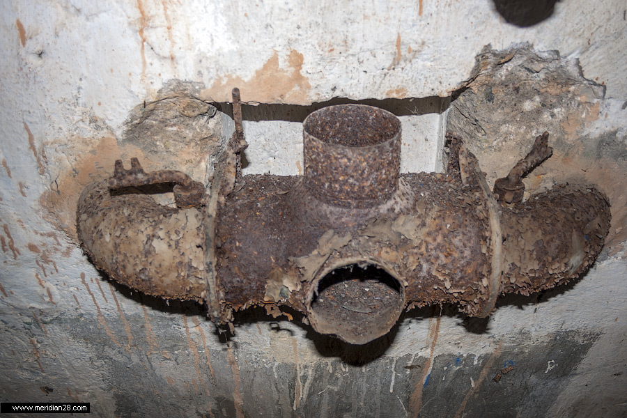 Через некоторое время одному из нас пришла в голову идея все-таки подняться на холм и, естественно, обнаружить там ДОТ. Наблюдательный пункт № 172 имеет высокий класс защиты М-1. Был построен для координации огня находящегося рядом орудийного капонира № 173. Из-за достаточной труднодоступности сооружение неплохо сохранилось: нетронутыми остались двери в противохимическом тамбуре, а также межказематные двери. Сохранились детали систем жизнеобеспечения ДОТа: трубы, клапана и вентели. На петлях противоштурмовой решетки был найден аутентичный замок — крайне редкая находка, аналогов которой мы до сих пор не встречали.