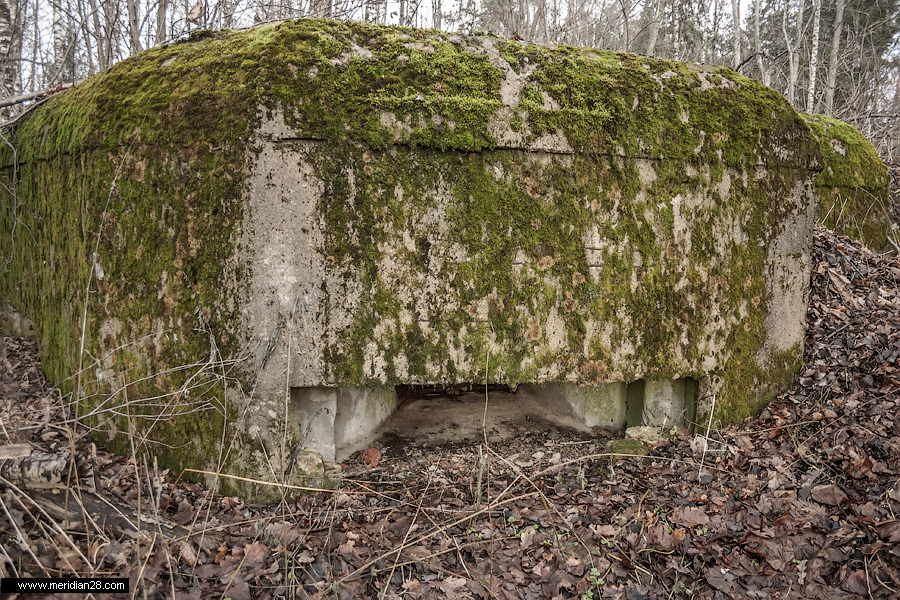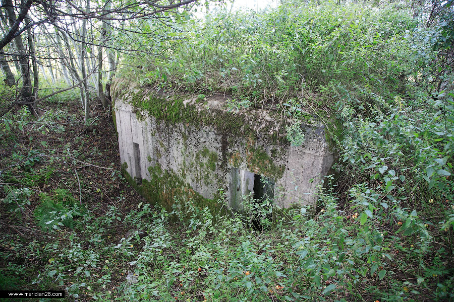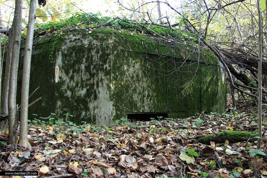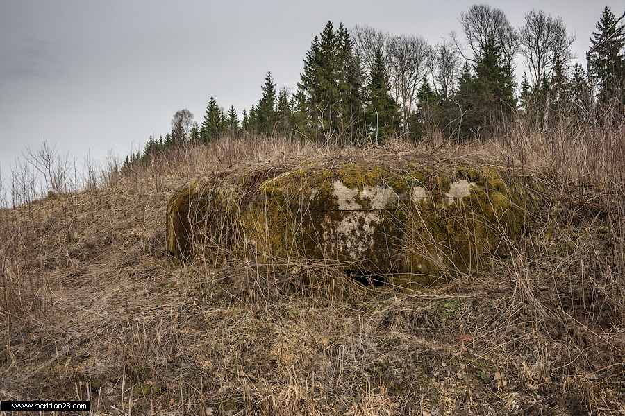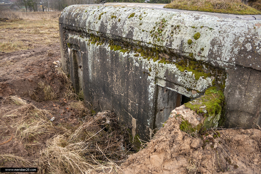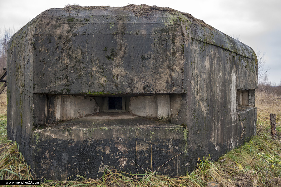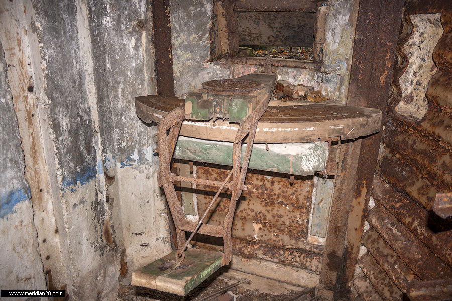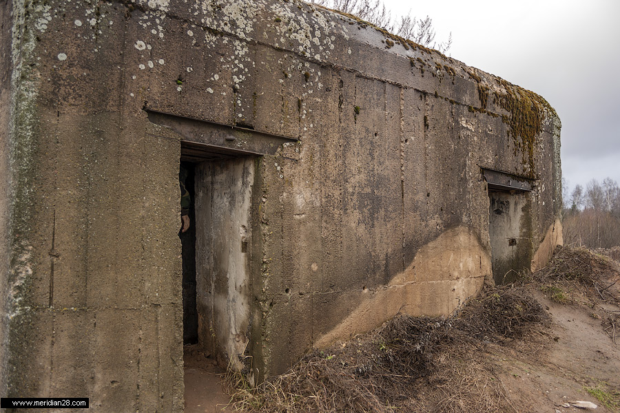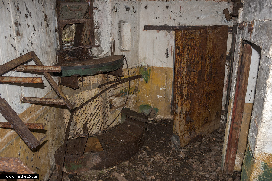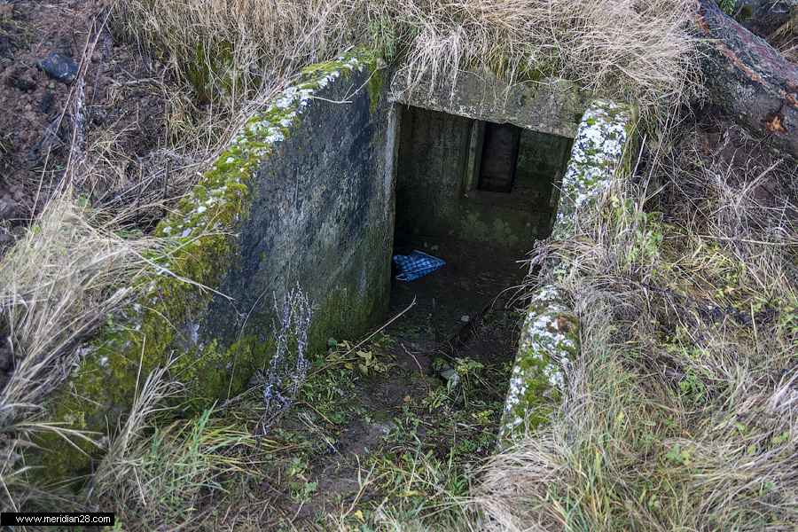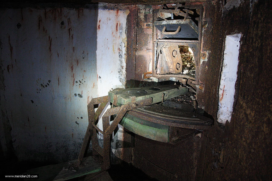 Прямо под одной из амбразур сооружения были замечены следы недавнего подкопа — видимо, кто-то искал здесь какие-то ценности. По сопротивляемости к попаданию снарядов это был легкозащищенный ДОТ класса М-3 на три амбразуры. Внутри мы обнаружили рабочие пулеметные станки с седушками для стрелка. На пулеметных столах сохранились градусные шкалы для наводчика. В сооружении были замечены уцелевшие кронштейны для раций, клапана фильтровентиляционной установки и двери. Забавная особенность: амбразура защиты входа в этом сооружении прорублена криво, что не позволяет эффективно прикрывать вход в сооружение. Факт вредительства на лицо.