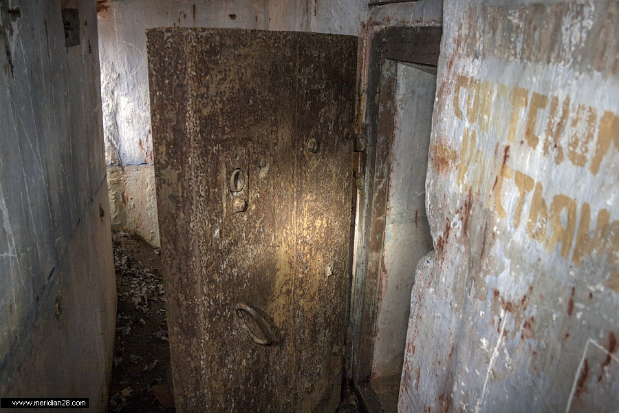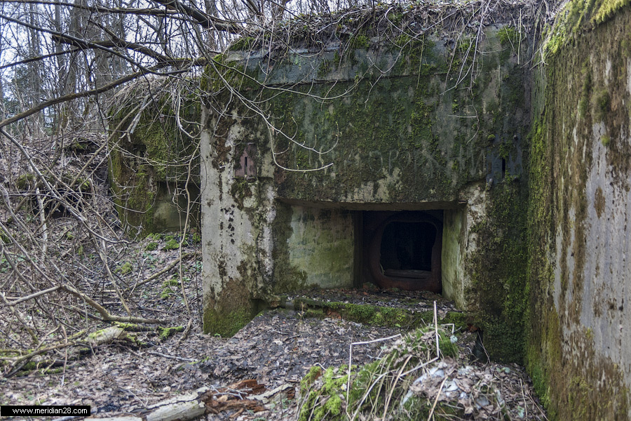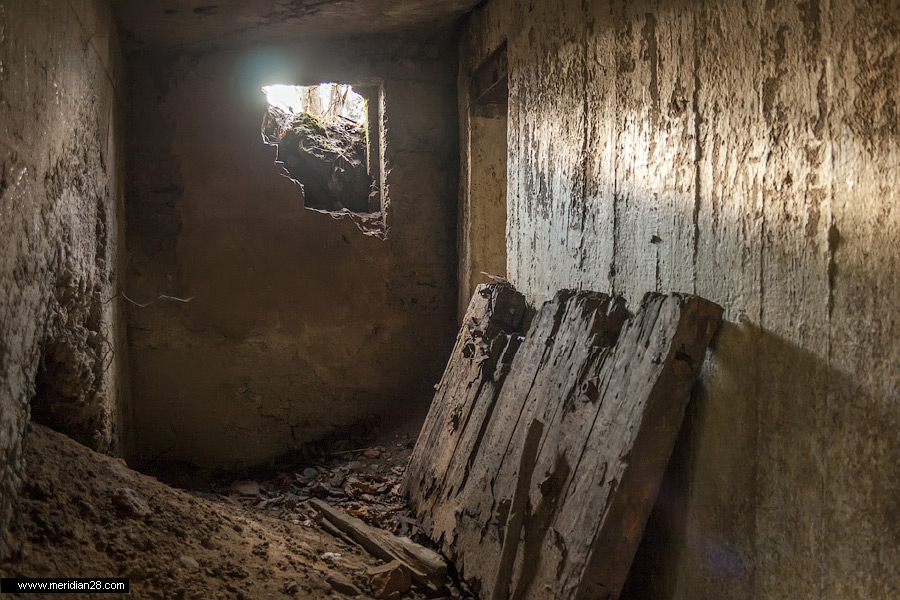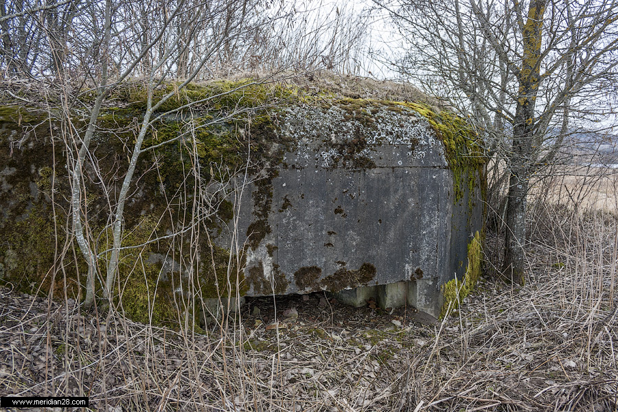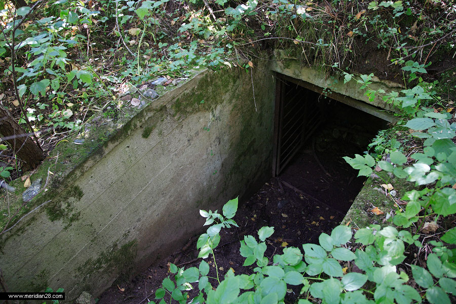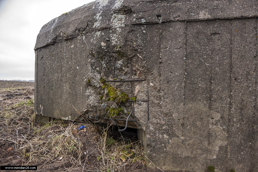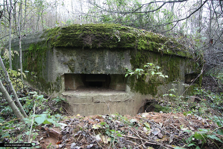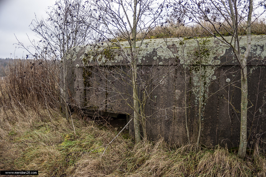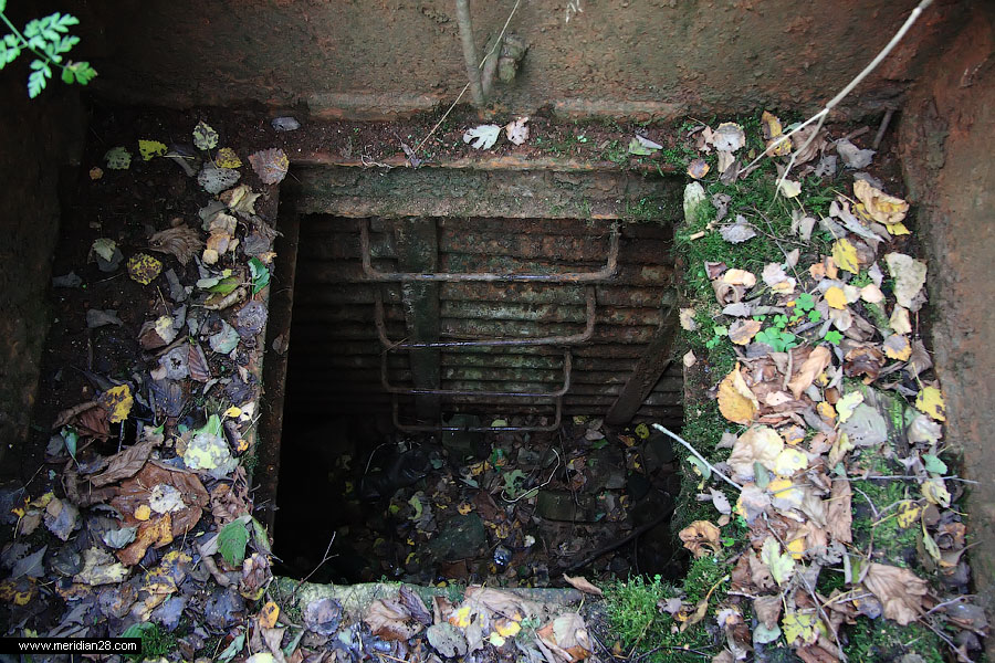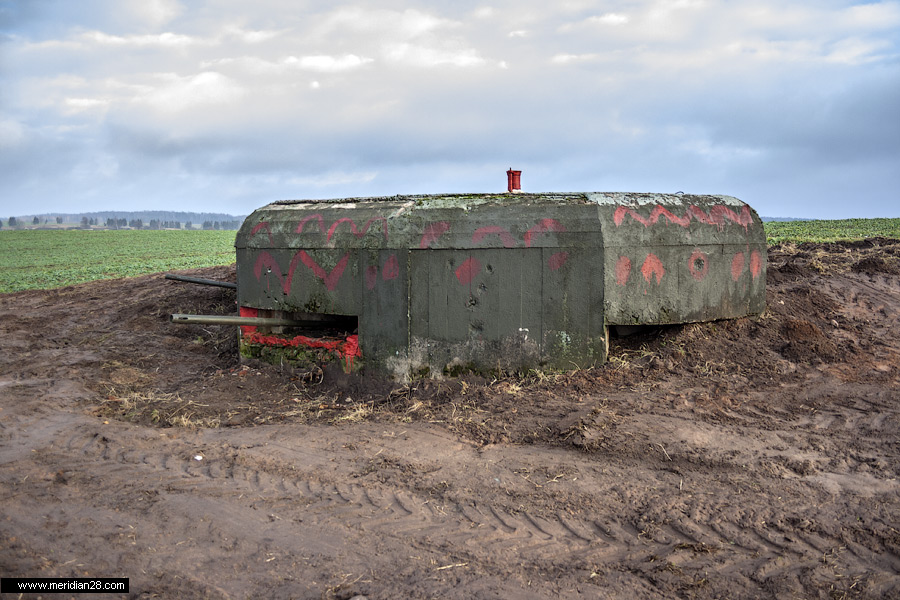 Прямо под одной из амбразур сооружения были замечены следы недавнего подкопа — видимо, кто-то искал здесь какие-то ценности. По сопротивляемости к попаданию снарядов это был легкозащищенный ДОТ класса М-3 на три амбразуры. Внутри мы обнаружили рабочие пулеметные станки с седушками для стрелка. На пулеметных столах сохранились градусные шкалы для наводчика. В сооружении были замечены уцелевшие кронштейны для раций, клапана фильтровентиляционной установки и двери. Забавная особенность: амбразура защиты входа в этом сооружении прорублена криво, что не позволяет эффективно прикрывать вход в сооружение. Факт вредительства на лицо.