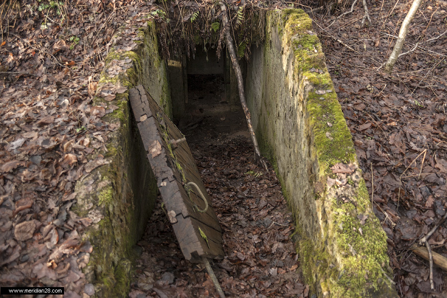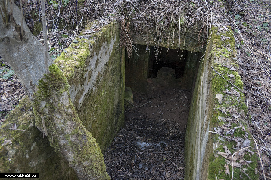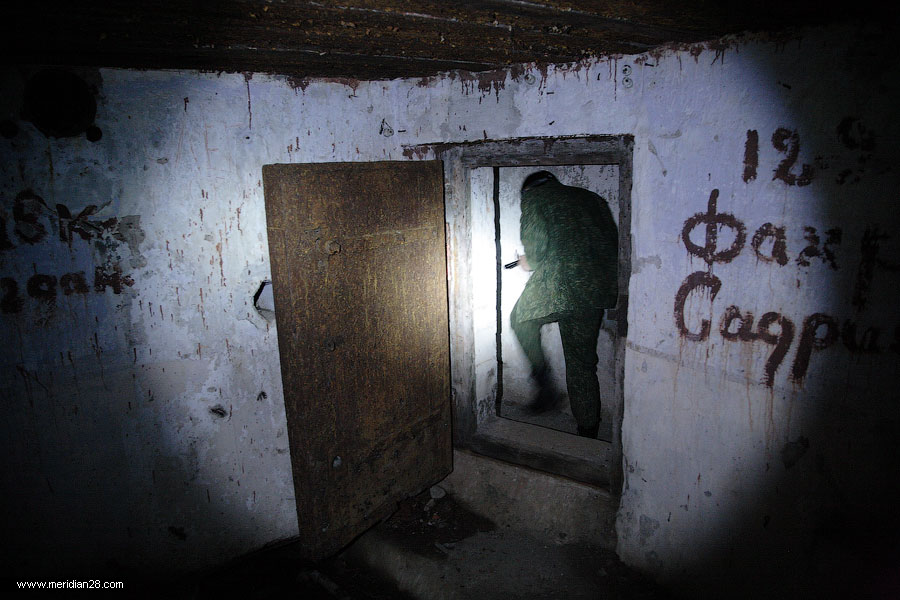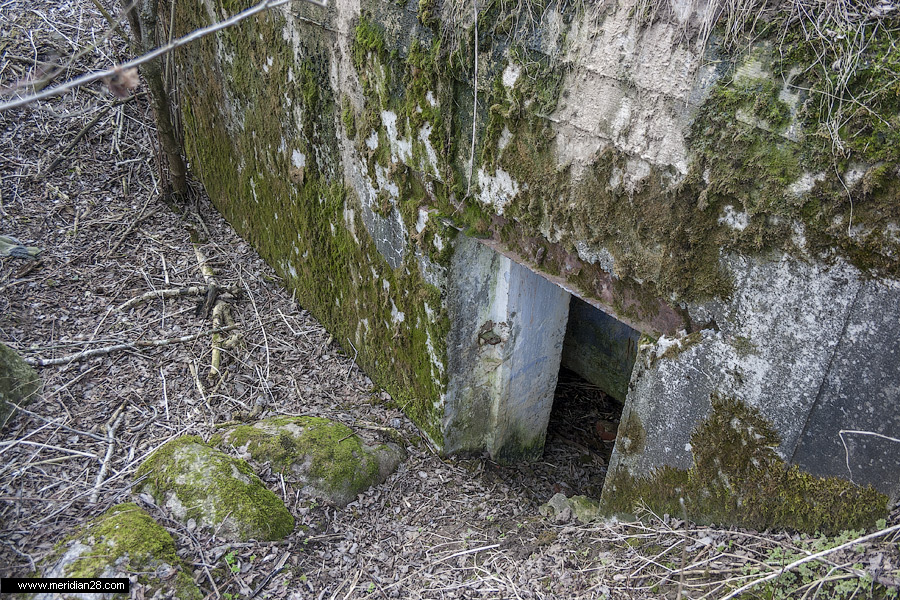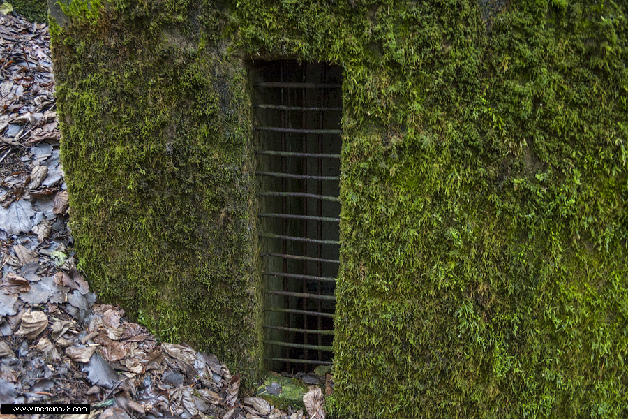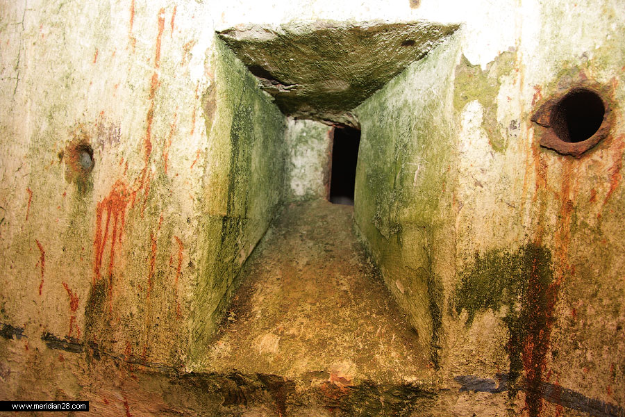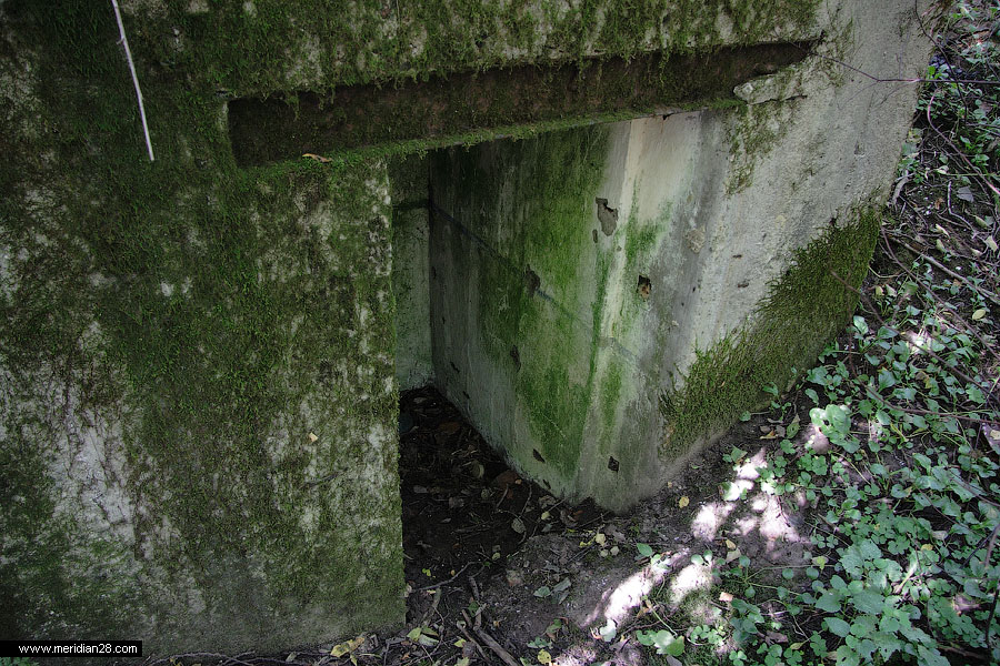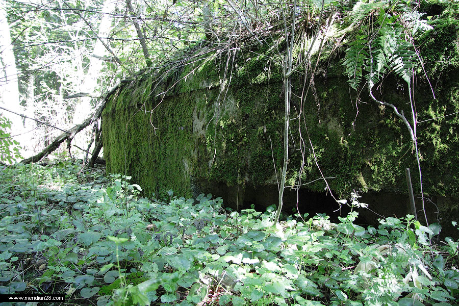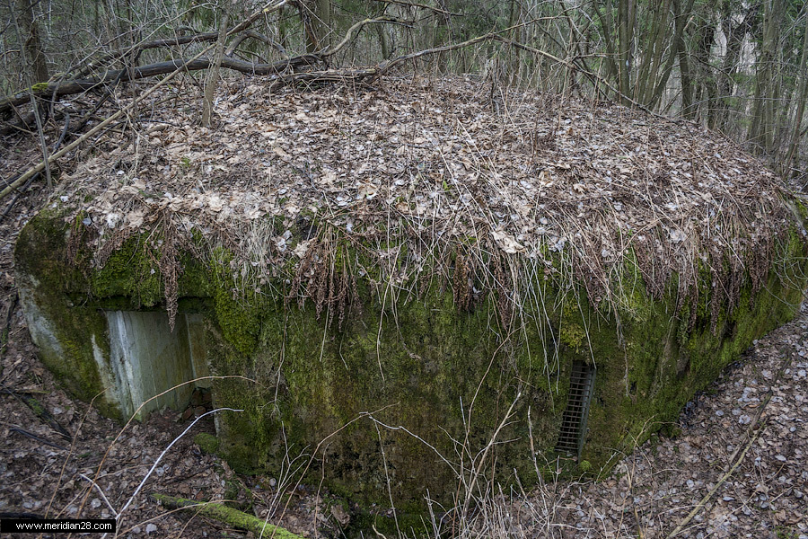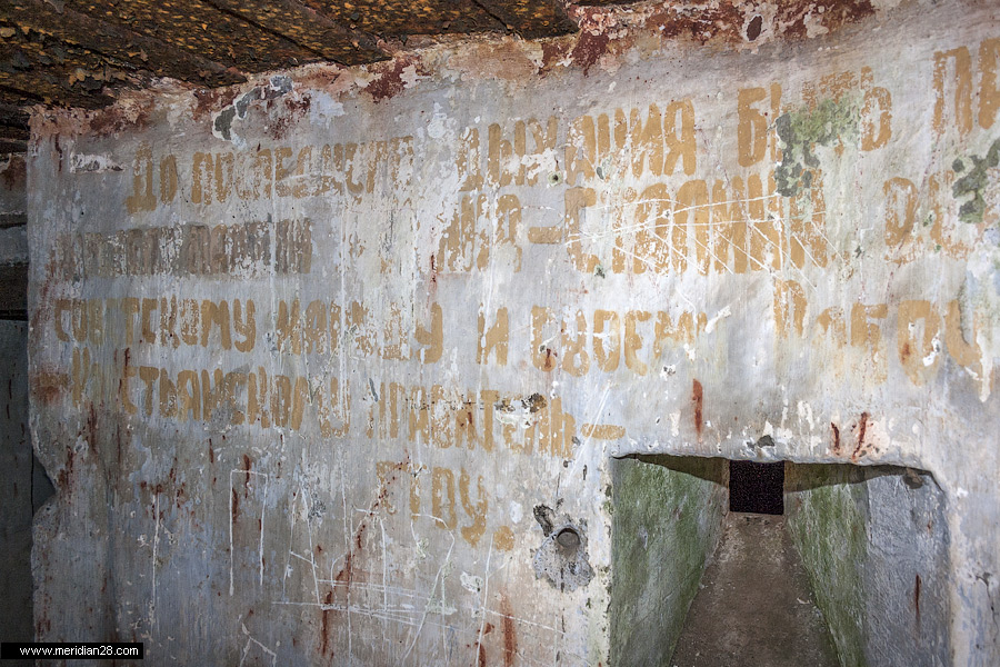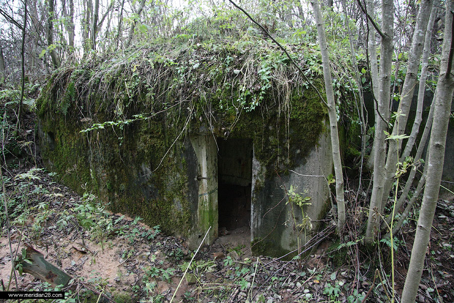 Прямо под одной из амбразур сооружения были замечены следы недавнего подкопа — видимо, кто-то искал здесь какие-то ценности. По сопротивляемости к попаданию снарядов это был легкозащищенный ДОТ класса М-3 на три амбразуры. Внутри мы обнаружили рабочие пулеметные станки с седушками для стрелка. На пулеметных столах сохранились градусные шкалы для наводчика. В сооружении были замечены уцелевшие кронштейны для раций, клапана фильтровентиляционной установки и двери. Забавная особенность: амбразура защиты входа в этом сооружении прорублена криво, что не позволяет эффективно прикрывать вход в сооружение. Факт вредительства на лицо.