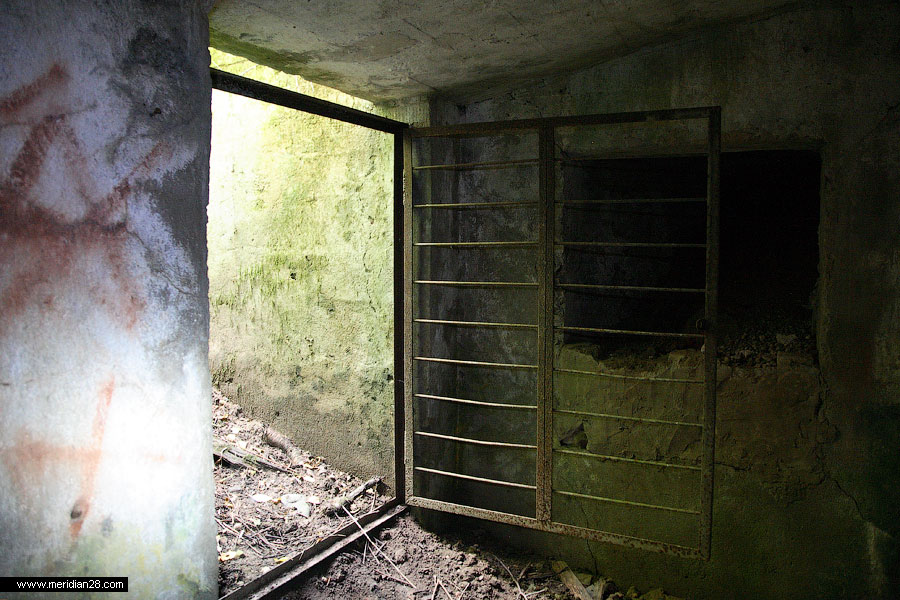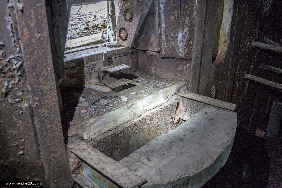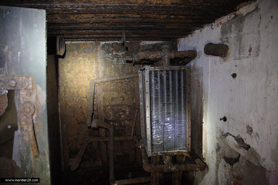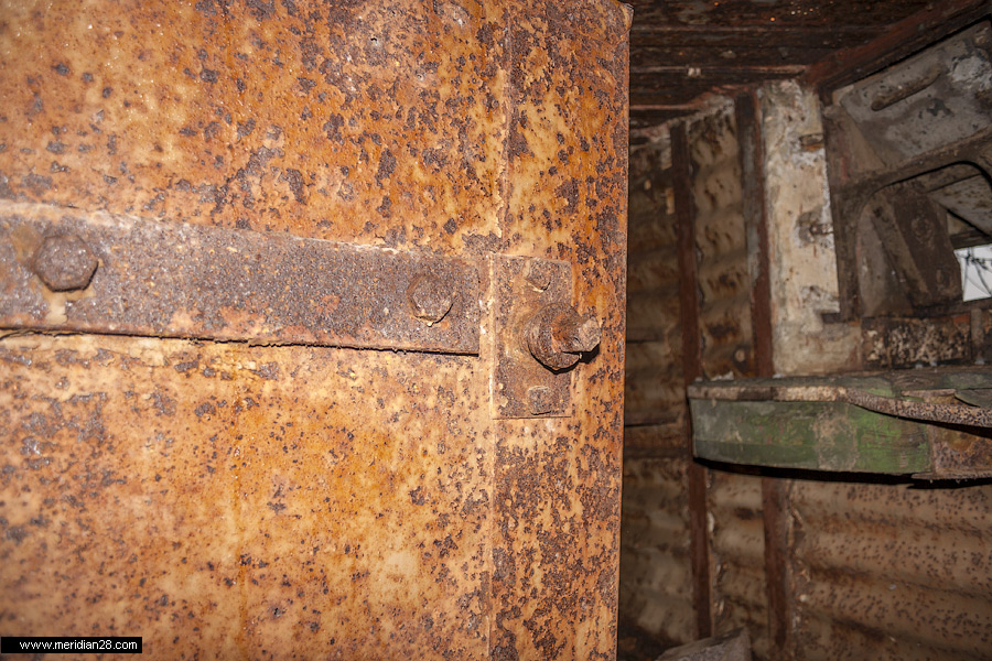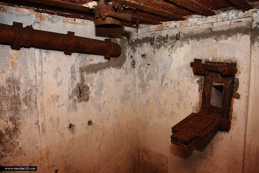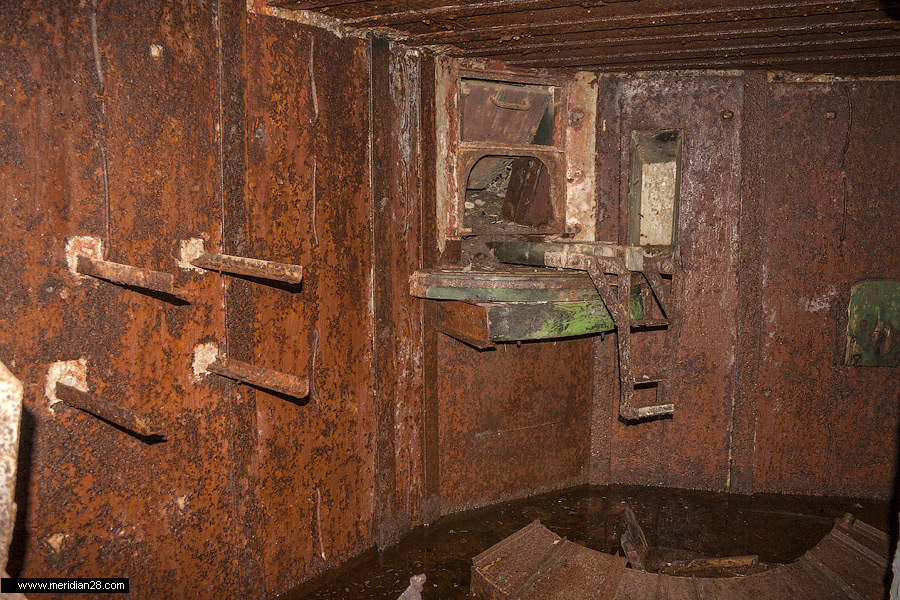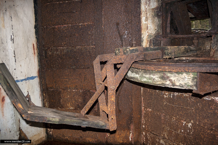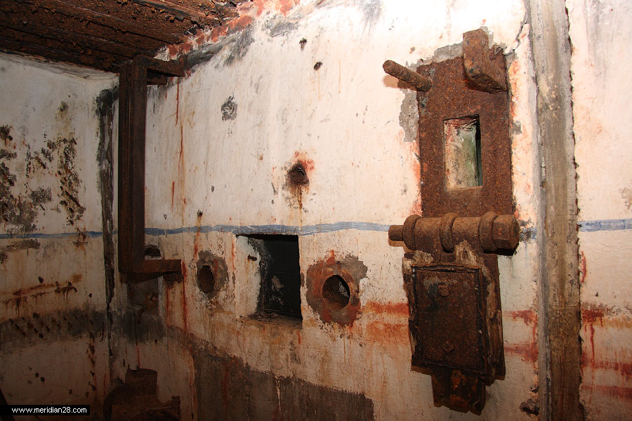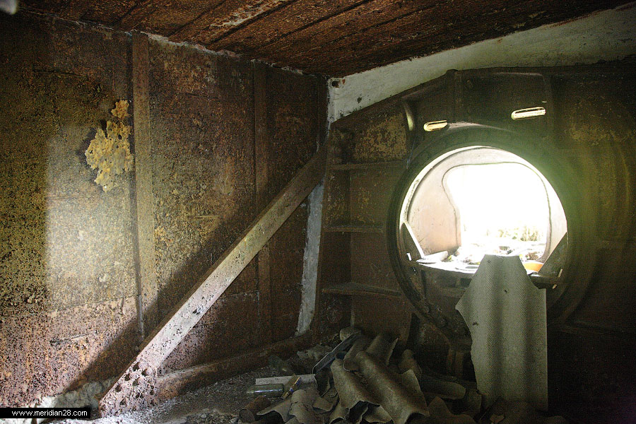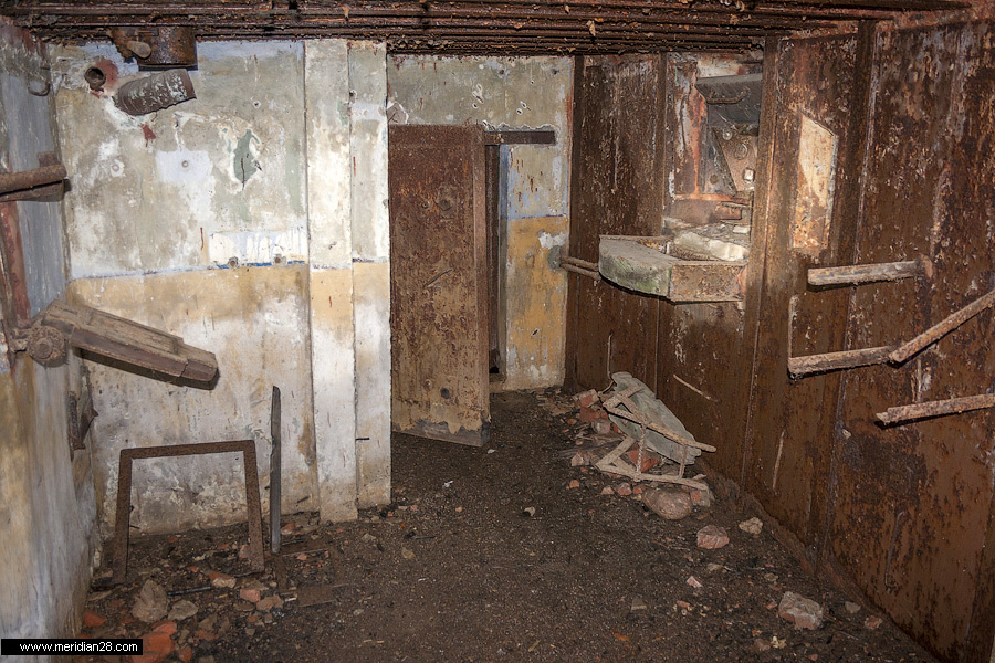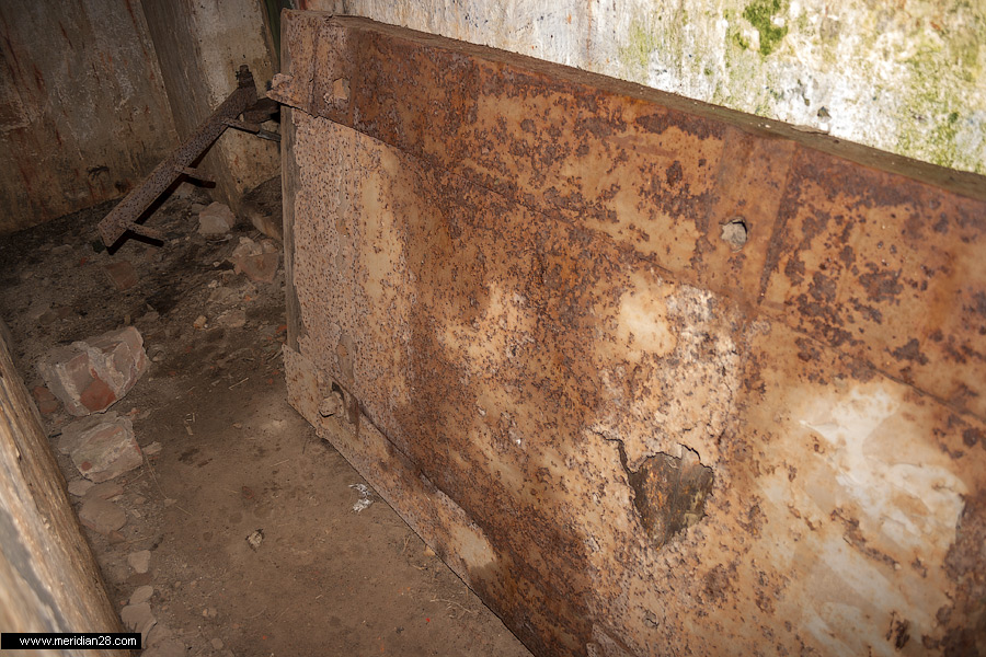 Сооружение не пытались превратить в погреб или сарай, но хотели предотвратить его посещение нерасторопными гражданами. На амбразурах и сквозниках теперь стоят решетки. Но попасть внутрь все же не составляет большого труда. Благодаря именно этим мерам по «самостоятельной консервации» сооружения внутри сохранились части силового агрегата, капонирные лафеты и бронированные двери. За исключением груды шифера в правом каземате, внутри ОПК чисто. Это хорошо.