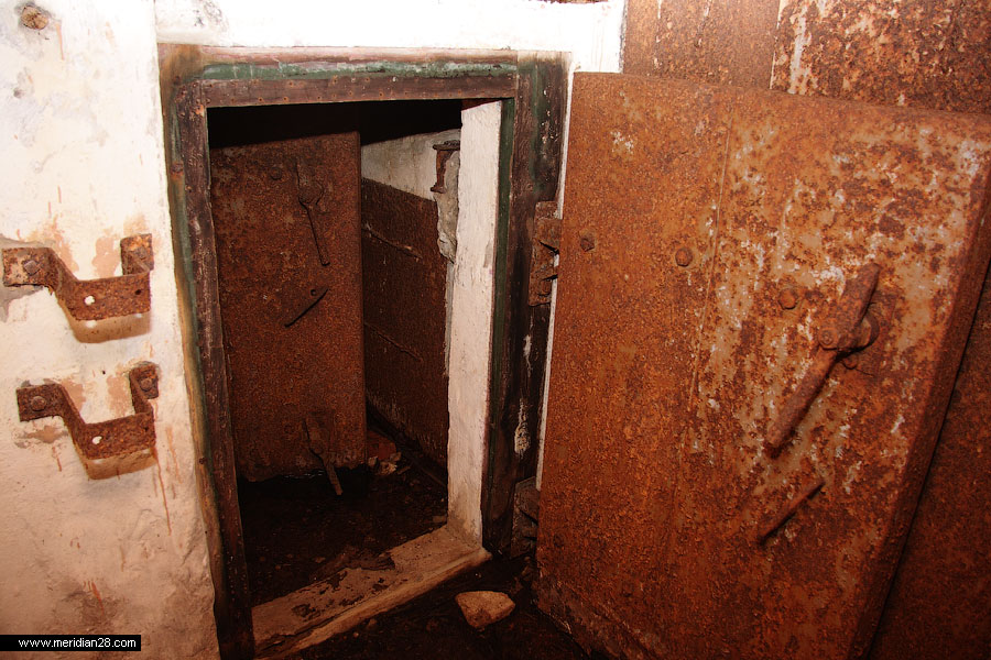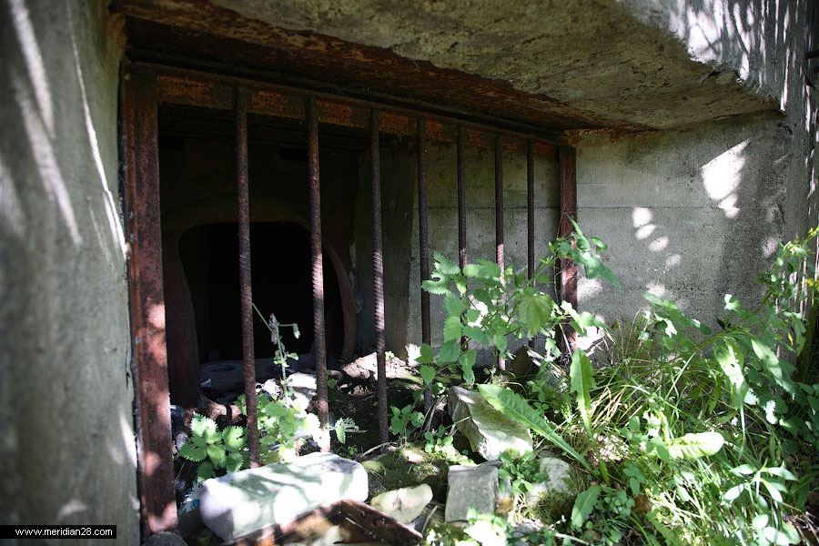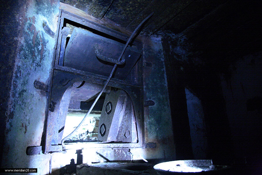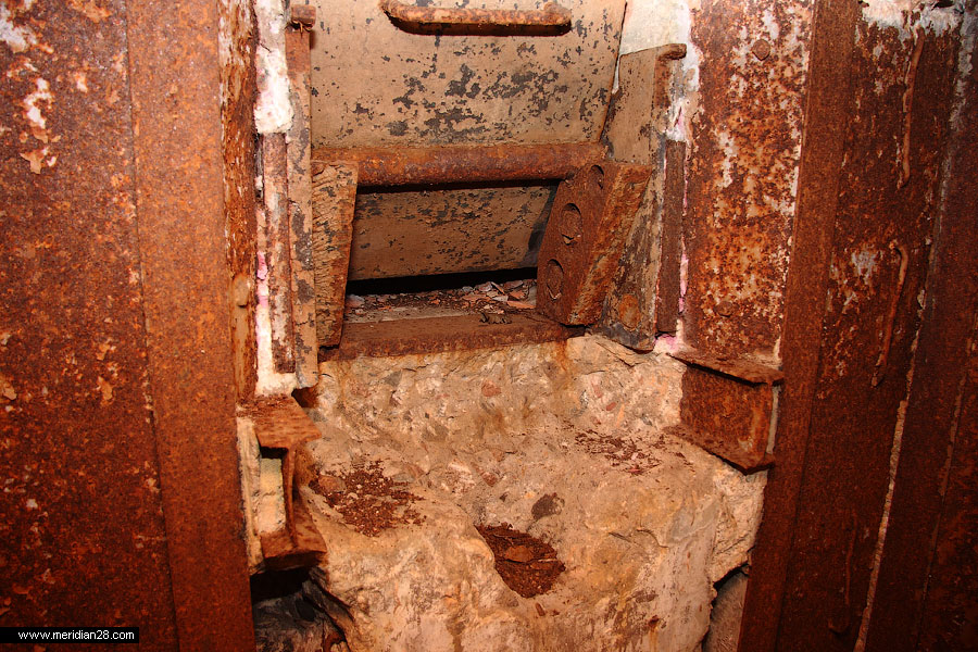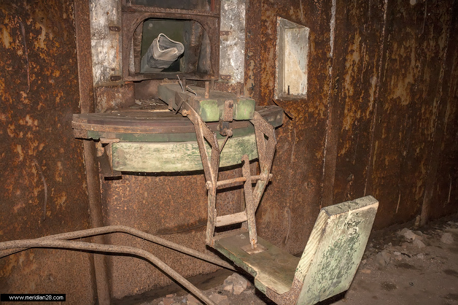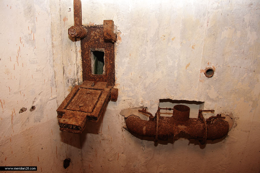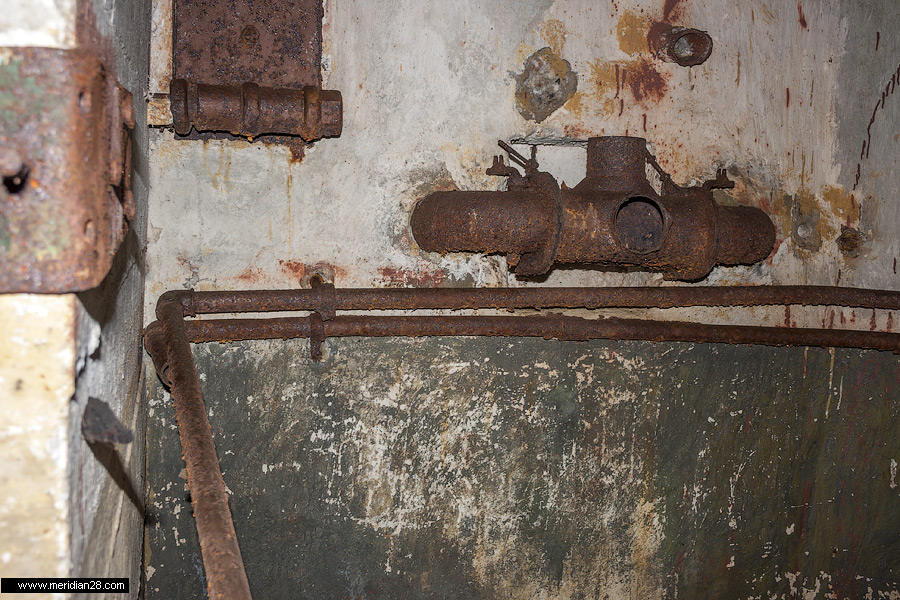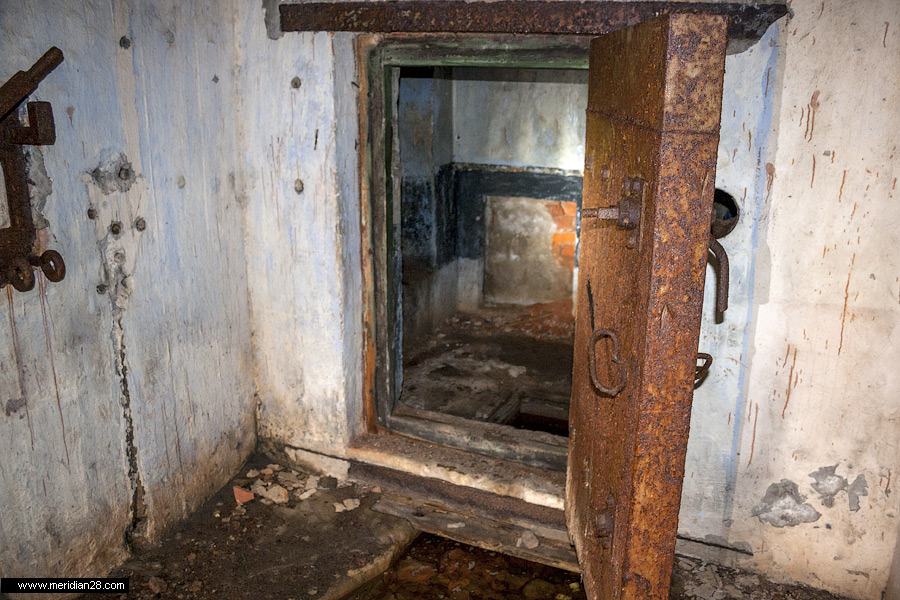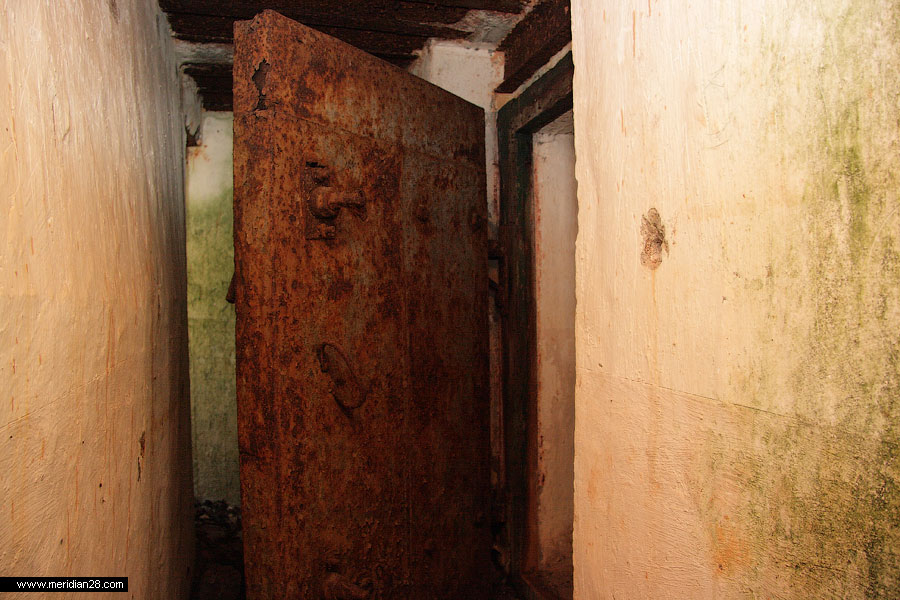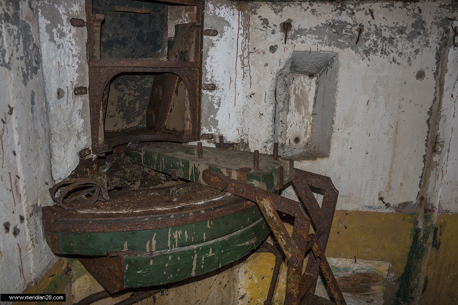 Сооружение не пытались превратить в погреб или сарай, но хотели предотвратить его посещение нерасторопными гражданами. На амбразурах и сквозниках теперь стоят решетки. Но попасть внутрь все же не составляет большого труда. Благодаря именно этим мерам по «самостоятельной консервации» сооружения внутри сохранились части силового агрегата, капонирные лафеты и бронированные двери. За исключением груды шифера в правом каземате, внутри ОПК чисто. Это хорошо.