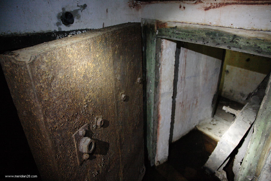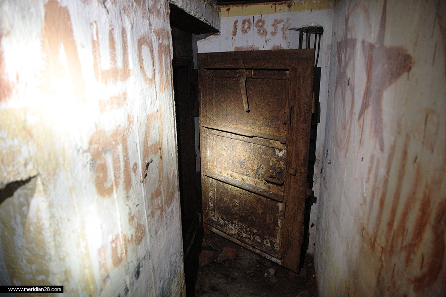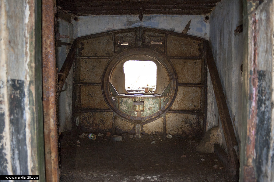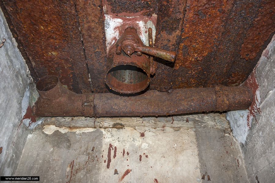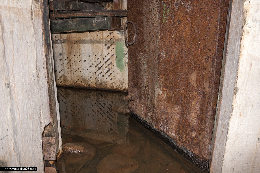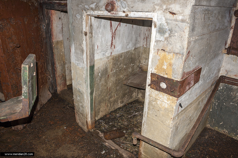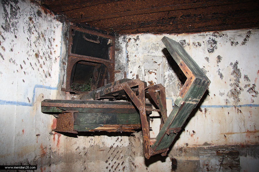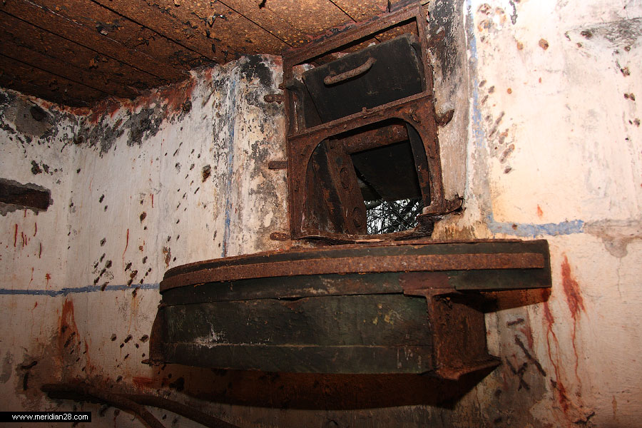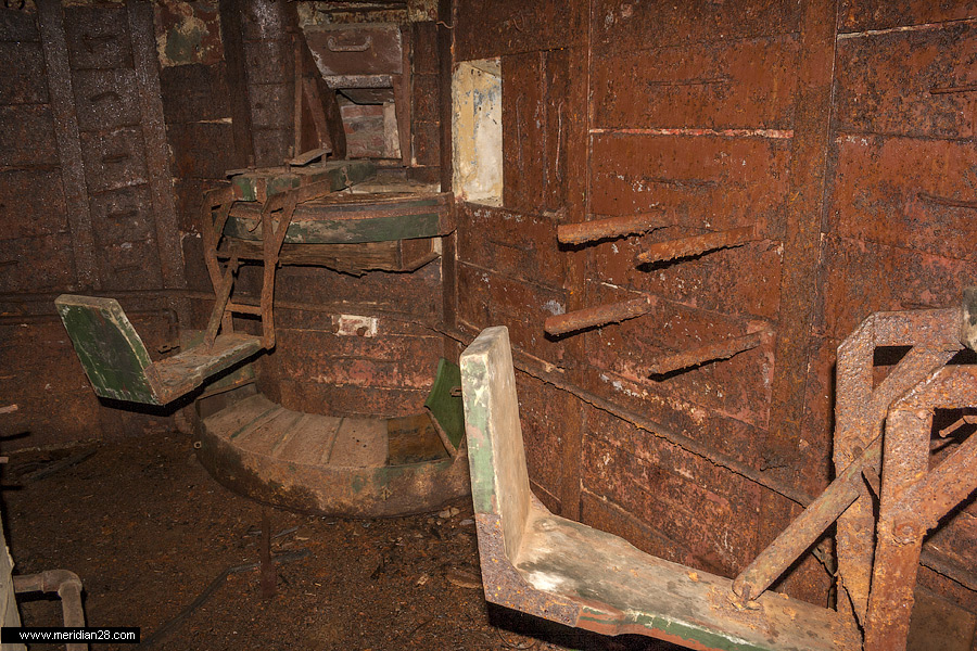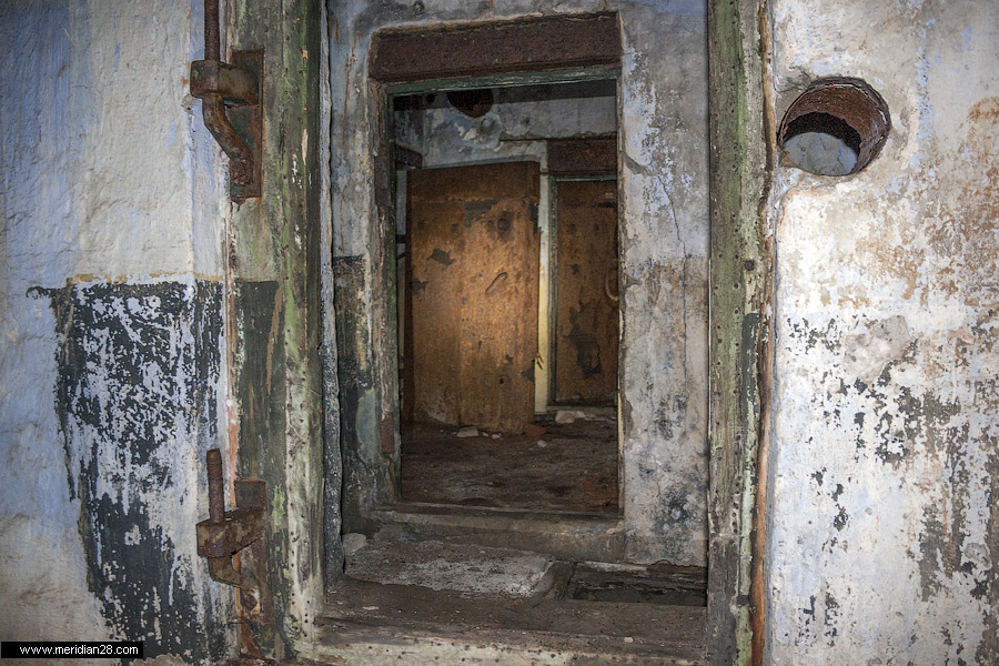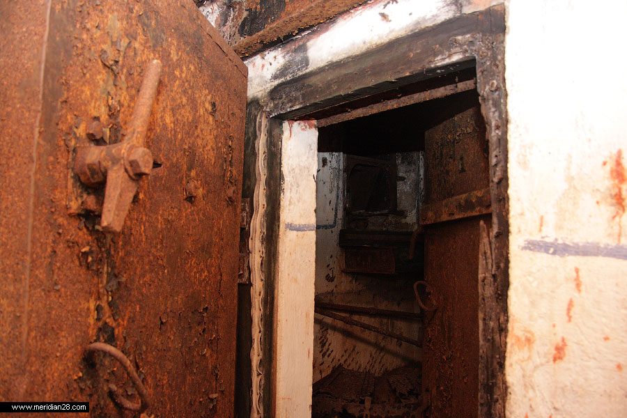 Сооружение не пытались превратить в погреб или сарай, но хотели предотвратить его посещение нерасторопными гражданами. На амбразурах и сквозниках теперь стоят решетки. Но попасть внутрь все же не составляет большого труда. Благодаря именно этим мерам по «самостоятельной консервации» сооружения внутри сохранились части силового агрегата, капонирные лафеты и бронированные двери. За исключением груды шифера в правом каземате, внутри ОПК чисто. Это хорошо.