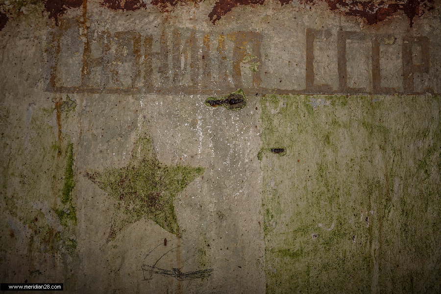 Далее мы направились к сооружению № 166 (М-2). Поиск облегчила вырубка, ДОТ было видно прямо с дороги. Сооружение очень хорошо сохранилось. Внутри были обнаружены трубы, вентили, работающие станки и другое оборудование. Интересной находкой стали «фрески» в сквознике: цветок, пятиконечная звезда и надпись: