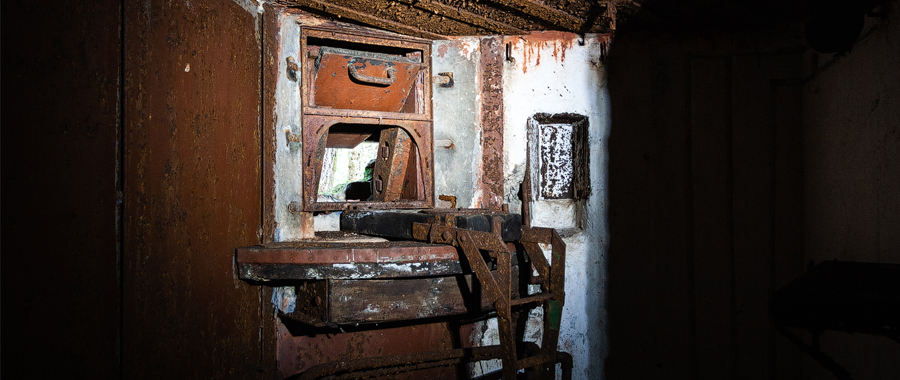 Внутрь попали через амбразуру. Нам это удалось только потому что отсутствовали амбразурные узлы — только в правом каземате нашлись остатки капонирного лафета. В казематах было достаточно грязно, несмотря на удаленность сооружения от людей. Один из колодцев для сбора гильз затоплен водой, другой — абсолютно сухой. В коридоре следы внутреннего взрыва. Дубовая дверь в одно из помещений вогнута внутрь. Очень интересной находкой стало помещение с фильтрационным агрегатом, которое неплохо уцелело почти за 80 лет. У входа в сквозник обнаружена аутентичная надпись «20.» — метка при консервации.