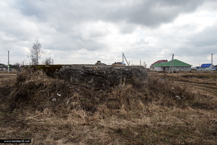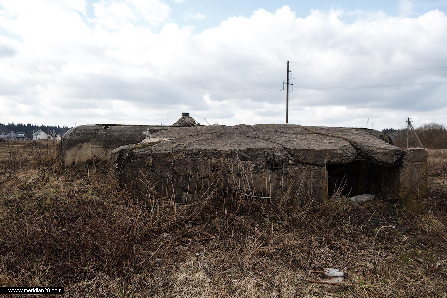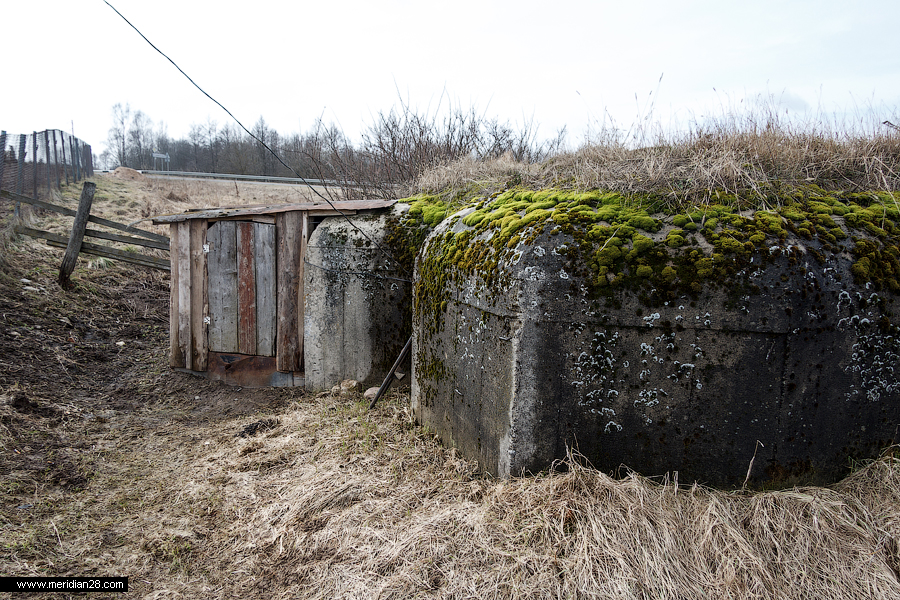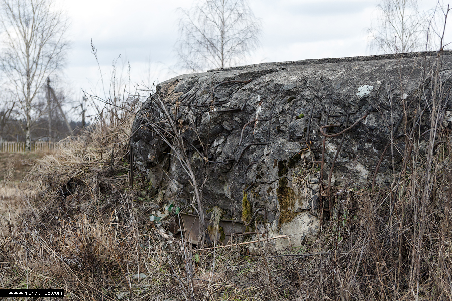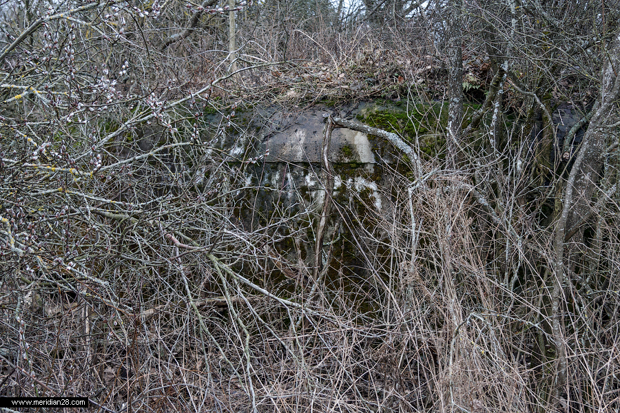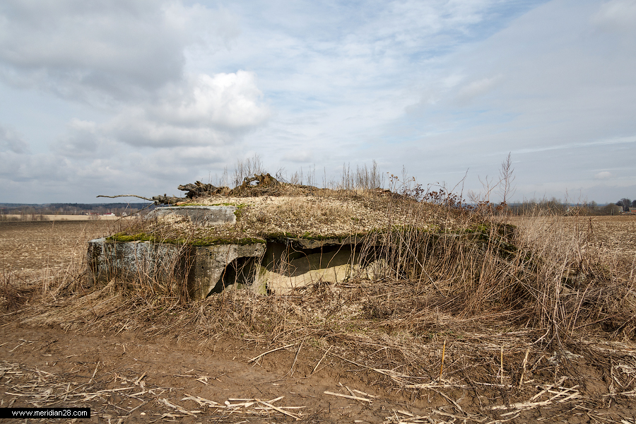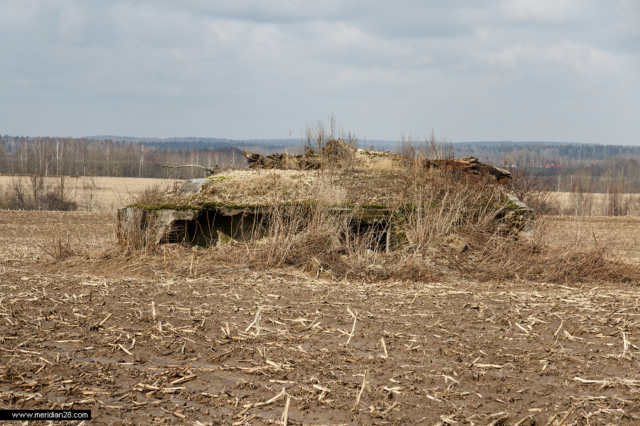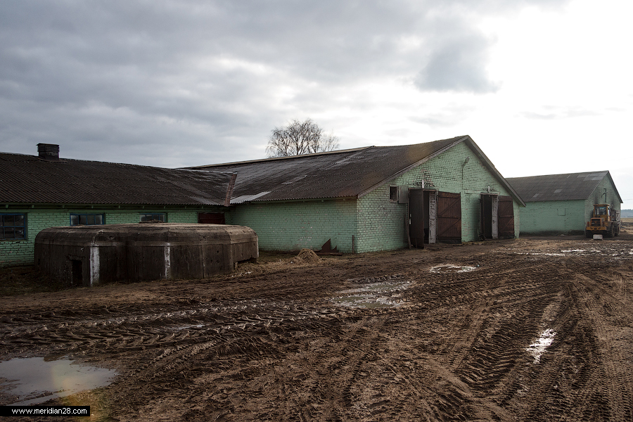 Далее проезжаем деревню Большие Новосёлки в сторону фермы для того, чтобы выбраться на передний край батальонного района обороны. Наша цель — ДОТ № 28 класса защиты М-2. Снова нас ждут непредвиденные обстоятельства — поле в начале весны превратилось как будто в трясину. Передвигаться по такому болоту приходится крайне медленно и сложно. В крытом дворике ДОТа опять лежит надгробие. Учитывая ситуацию с водой на поле, неудивительно, что огневая точка затоплена водой.