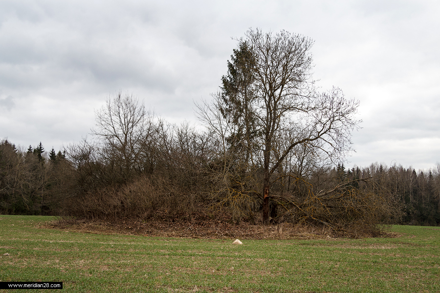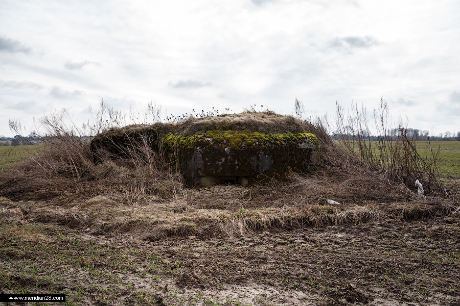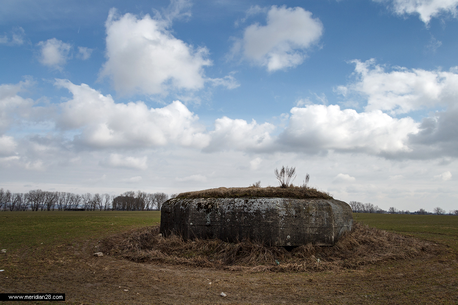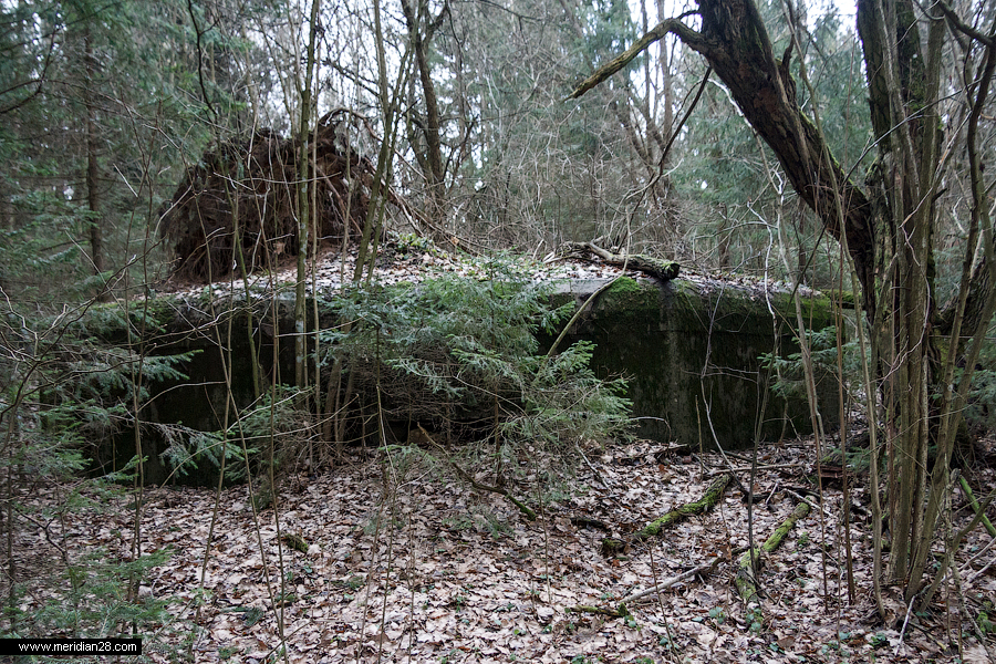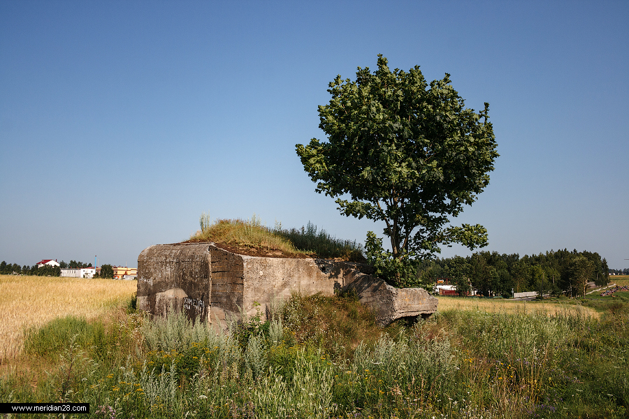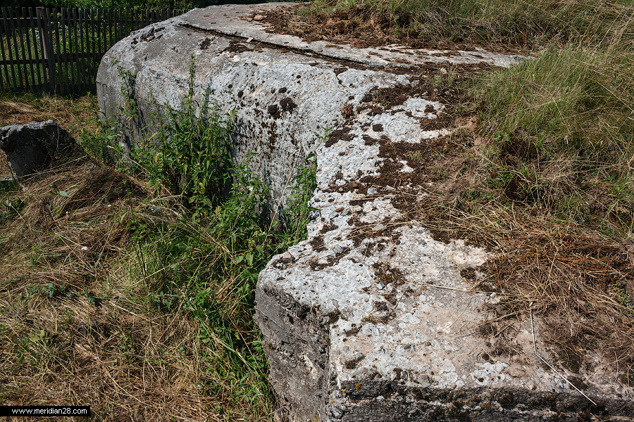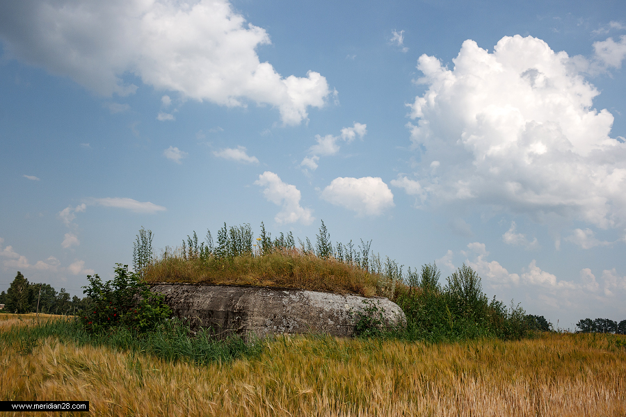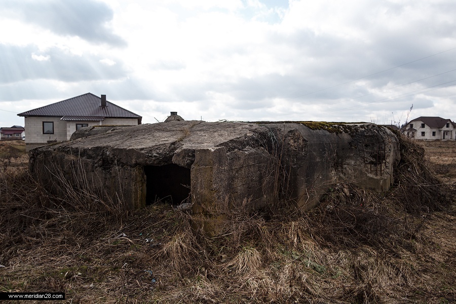 Далее проезжаем деревню Большие Новосёлки в сторону фермы для того, чтобы выбраться на передний край батальонного района обороны. Наша цель — ДОТ № 28 класса защиты М-2. Снова нас ждут непредвиденные обстоятельства — поле в начале весны превратилось как будто в трясину. Передвигаться по такому болоту приходится крайне медленно и сложно. В крытом дворике ДОТа опять лежит надгробие. Учитывая ситуацию с водой на поле, неудивительно, что огневая точка затоплена водой.
