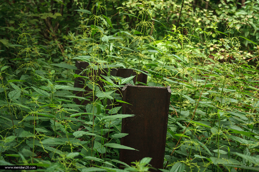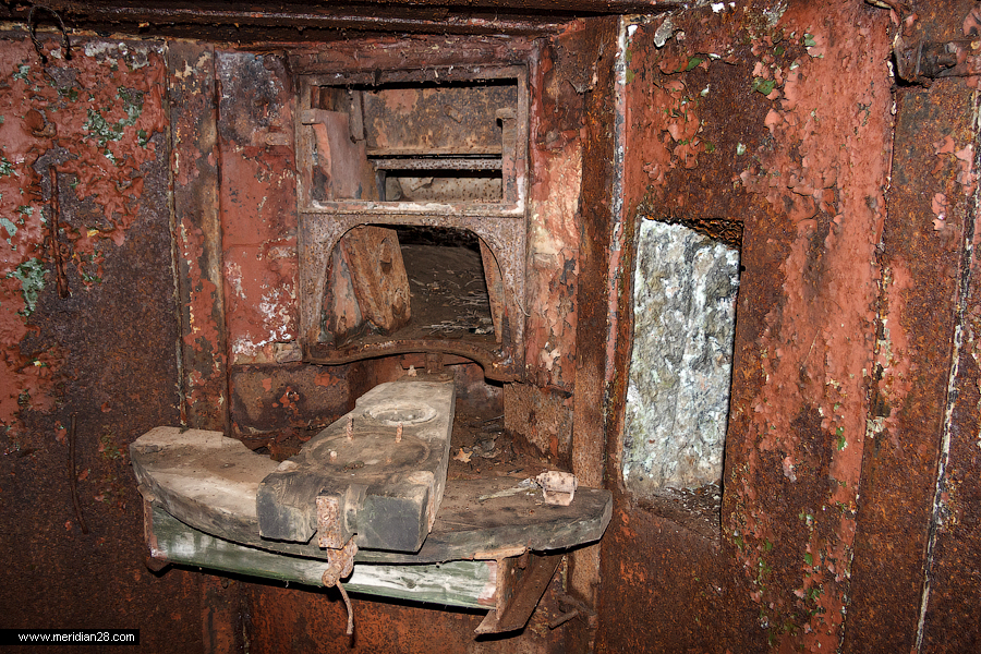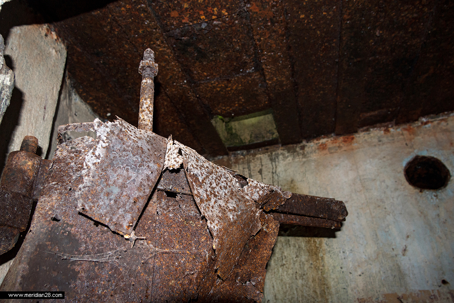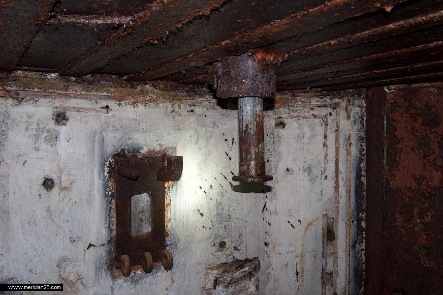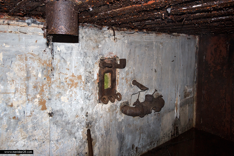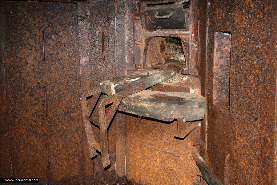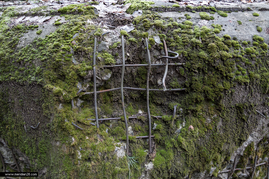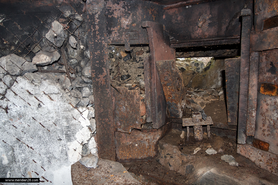 Направляемся к другому краю батальонного района обороны. ДОТ № 21 класса защиты М-1 расположен за деревней Костевичи. Внутри огневой точки находим редкую вещь, а именно сохранившиеся остатки перископа.