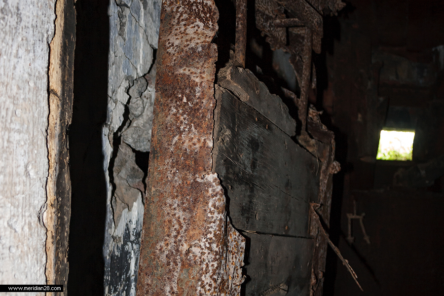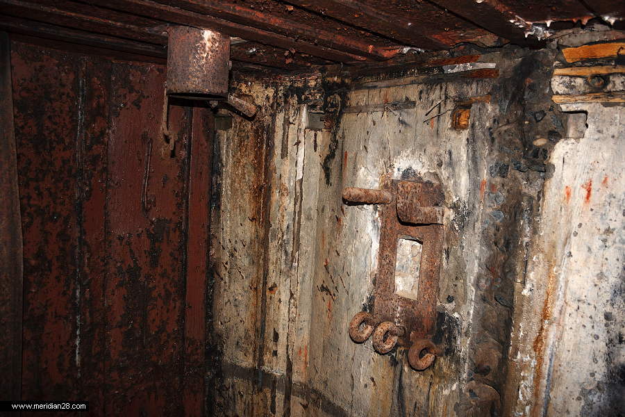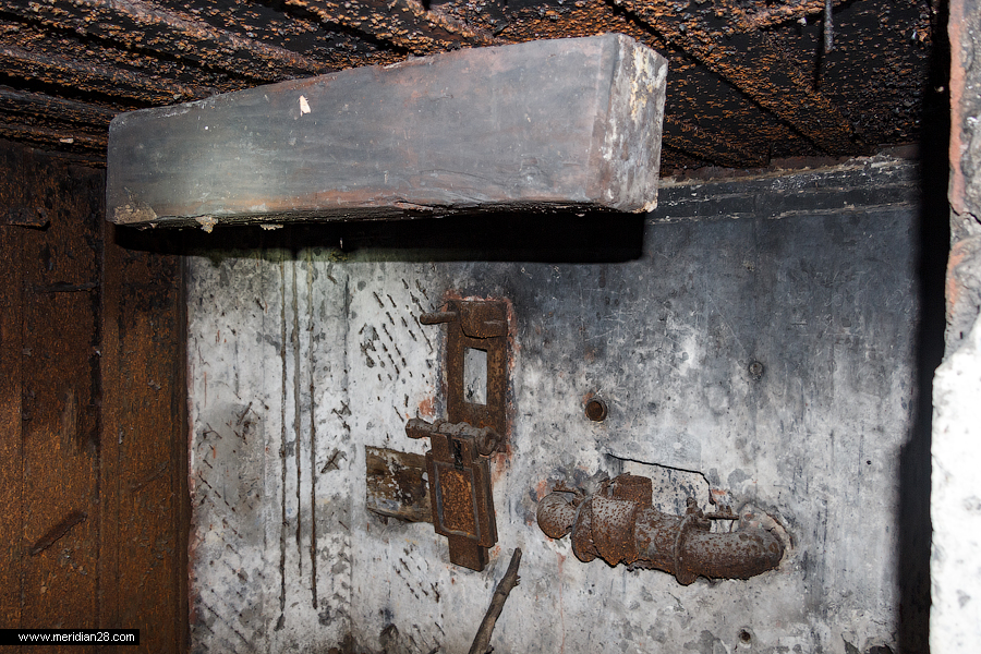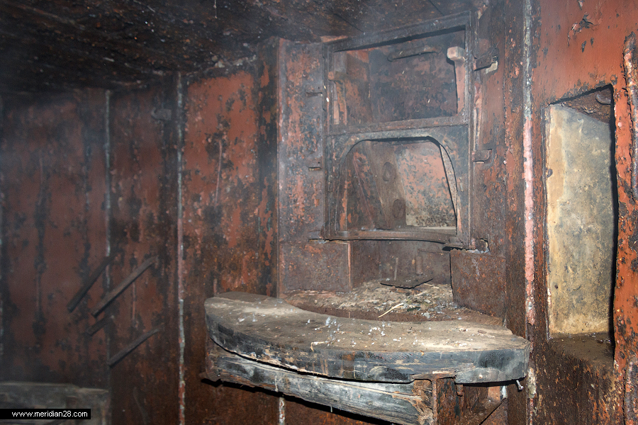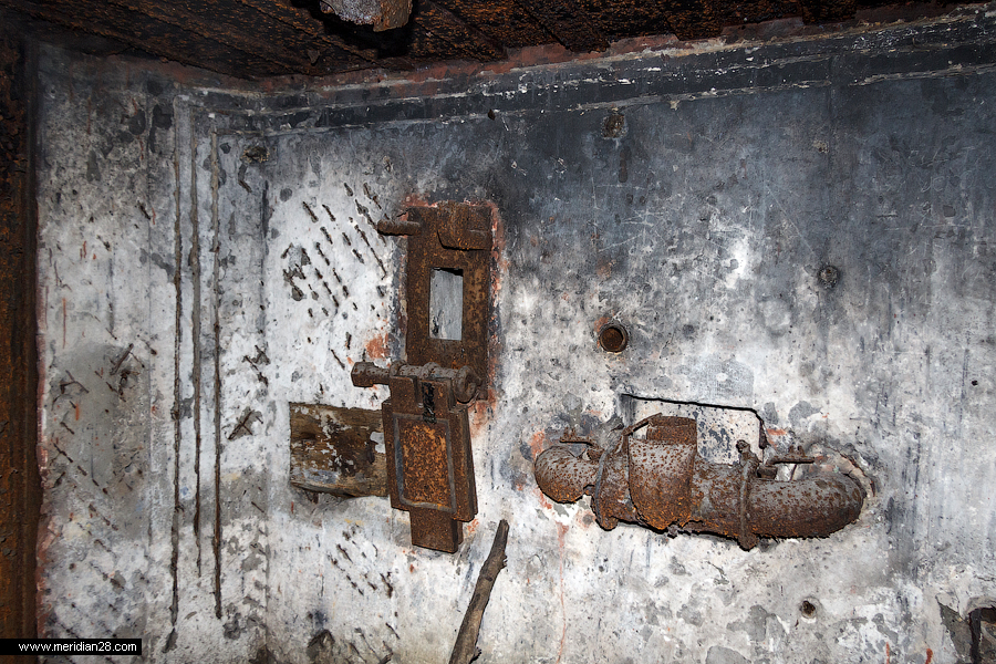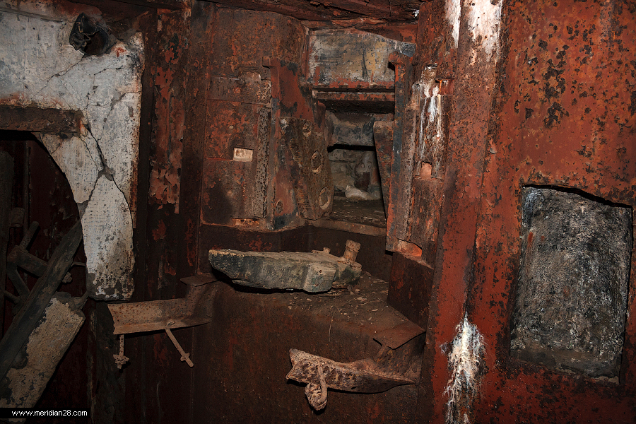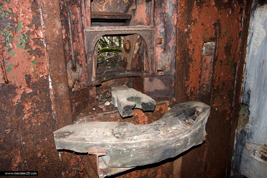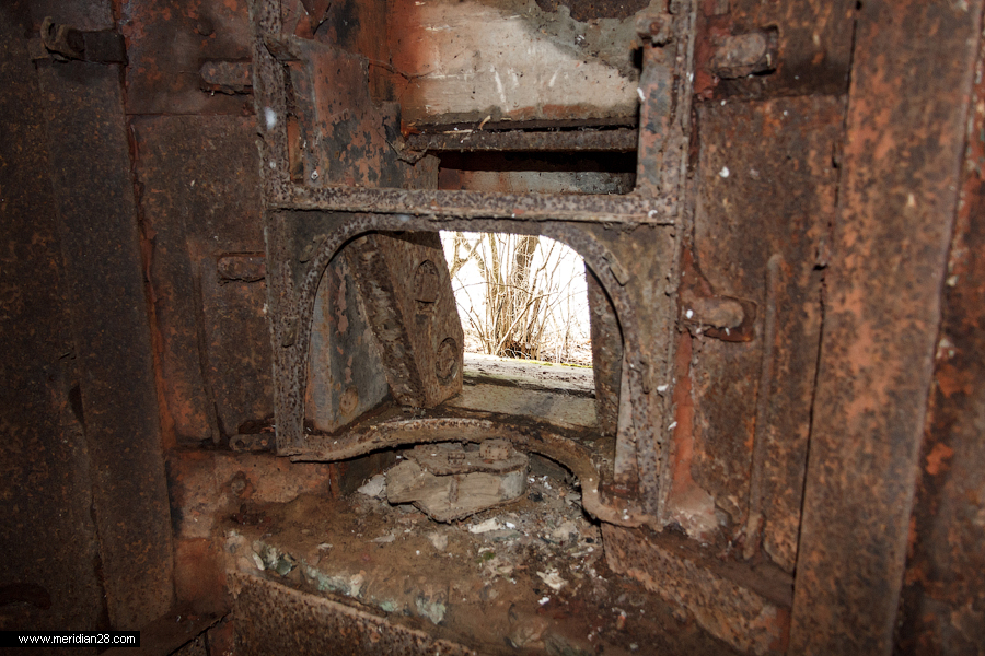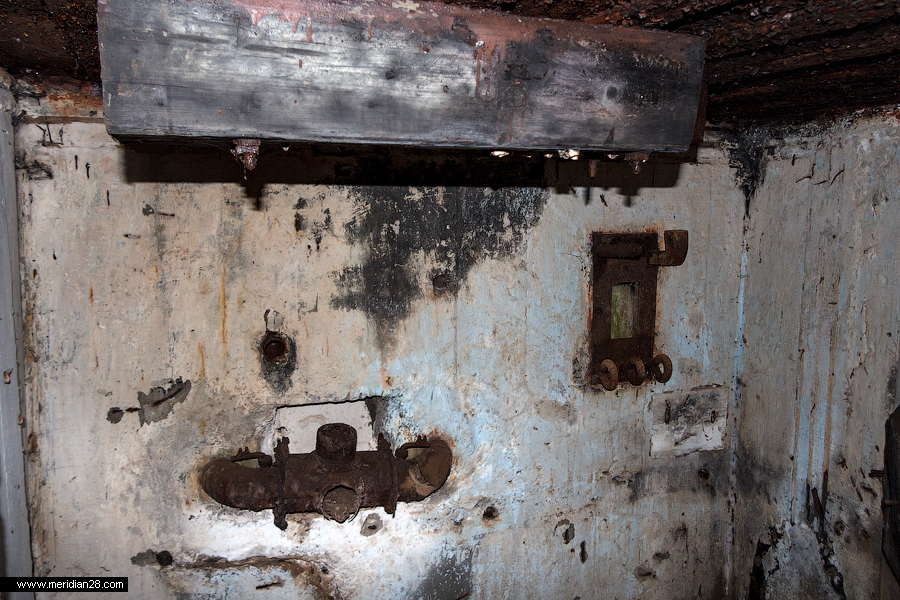 Направляемся к другому краю батальонного района обороны. ДОТ № 21 класса защиты М-1 расположен за деревней Костевичи. Внутри огневой точки находим редкую вещь, а именно сохранившиеся остатки перископа.
