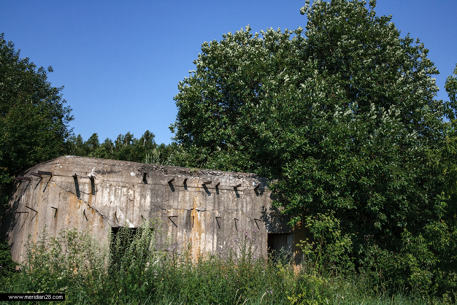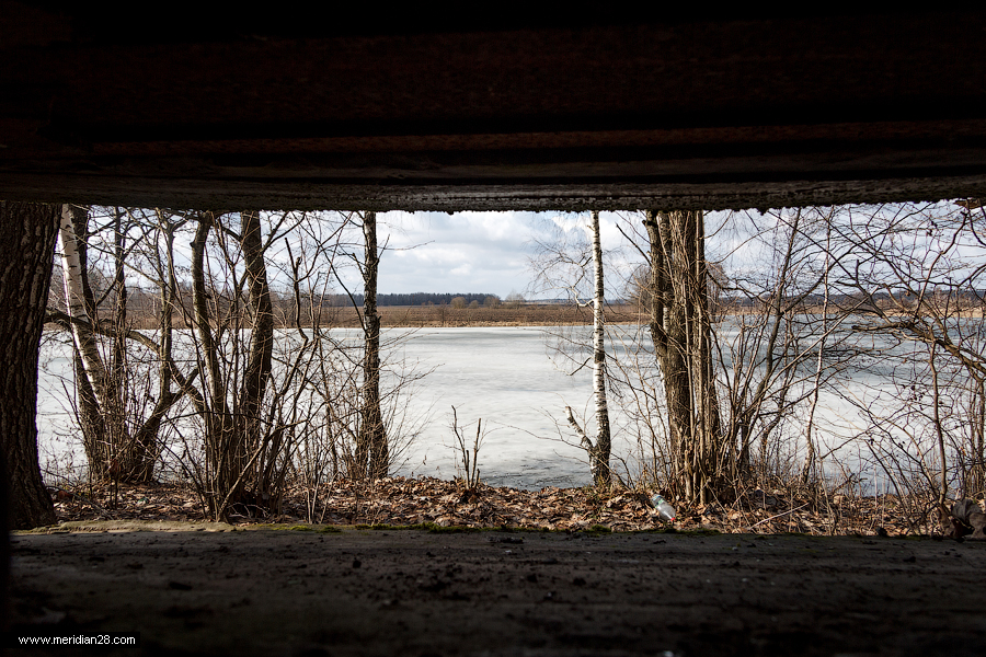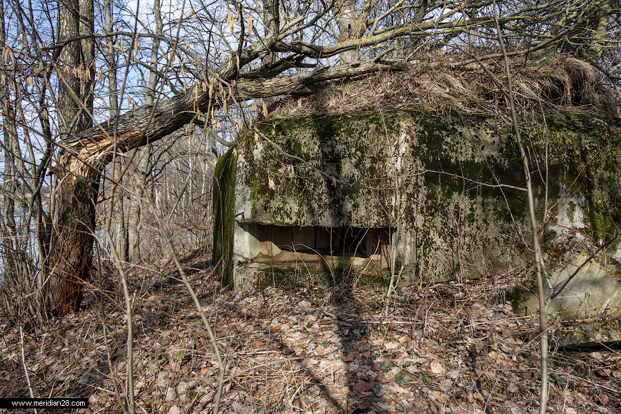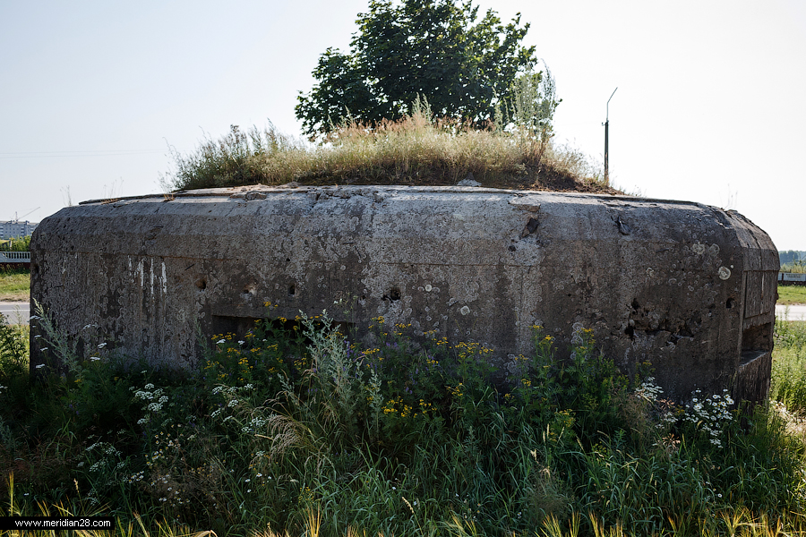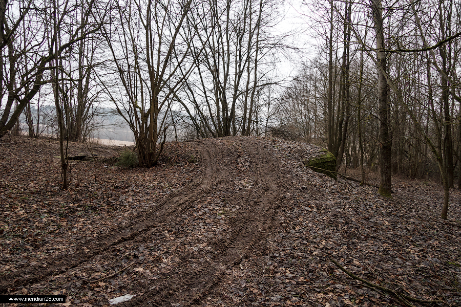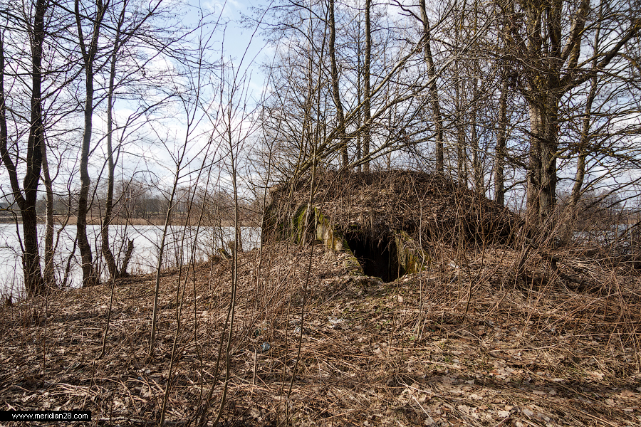 Выезжаем по старой дороге из города в направлении переднего края батальонного района обороны. ДОТ № 25 класса защиты М-2 расположен на берегу нового озера. В отсутствии густой растительности издалека заметны противорикошетные уступы двухамбразурной огневой точки.