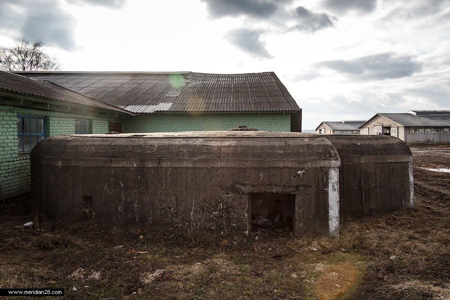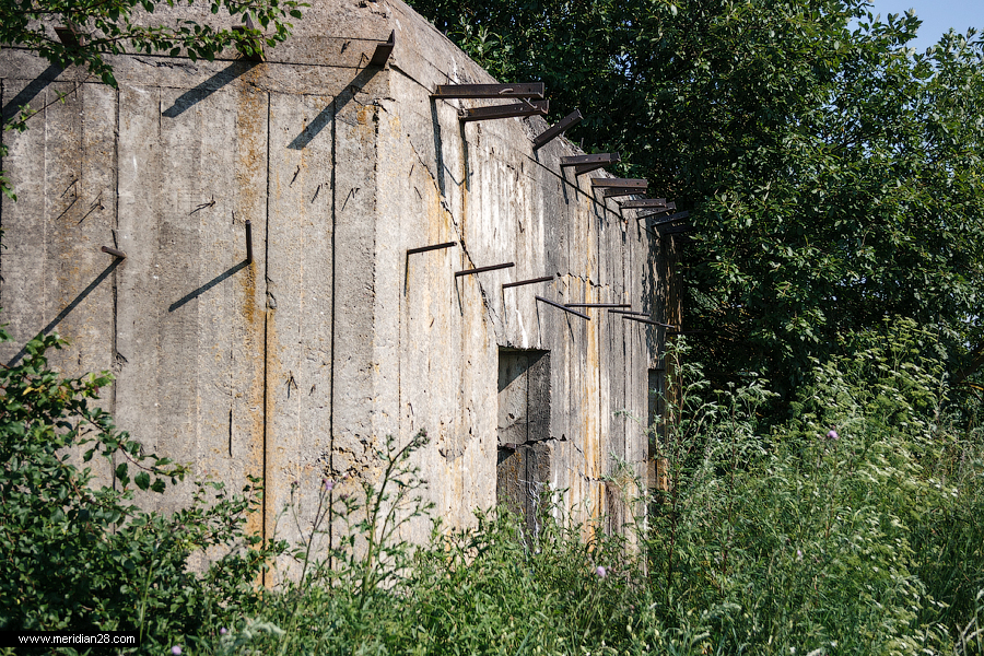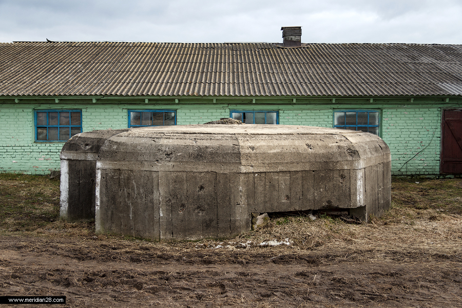Завершаем изучение района поиском ДОТа № 19. Огневая точка класса защиты М-2 расположена прямо на ферме. На стенах ДОТа имеются боевые повреждения. Огневая точка слегка подкрашена, вероятно, работниками фермы. Внутрь ДОТа попасть невозможно — вход засыпан.