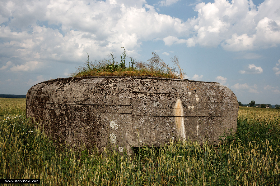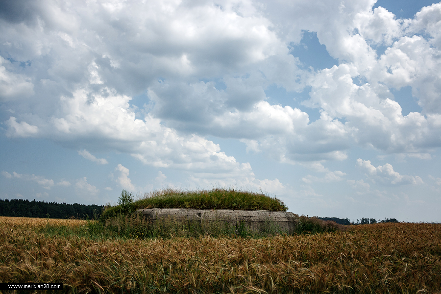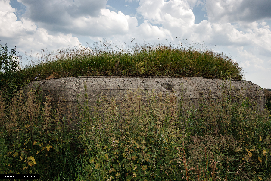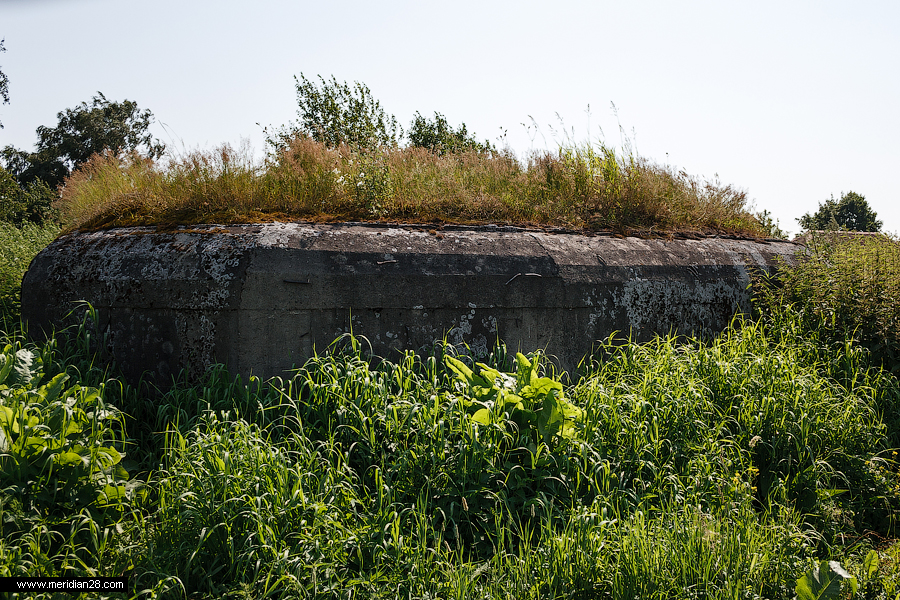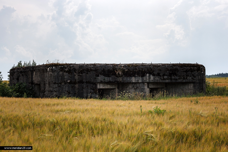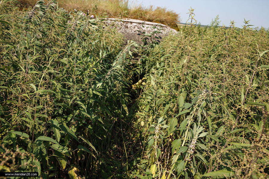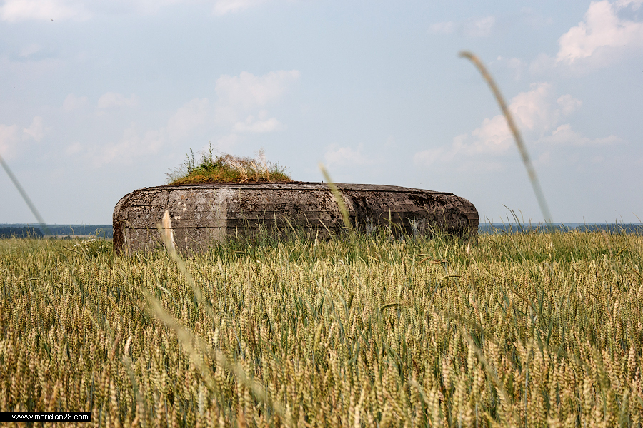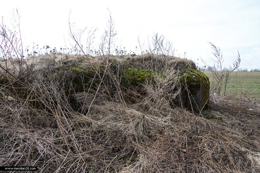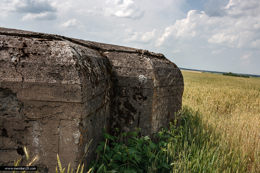 Далее в поле находим следующую огневую точку. На стенах ДОТа переднего края обороны класса защиты М-1 виднеются следы боевых повреждений.