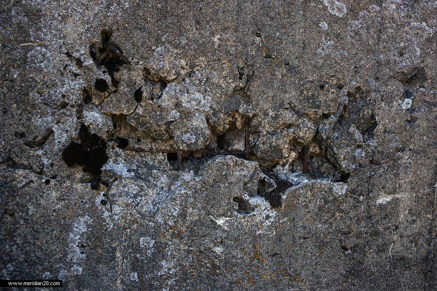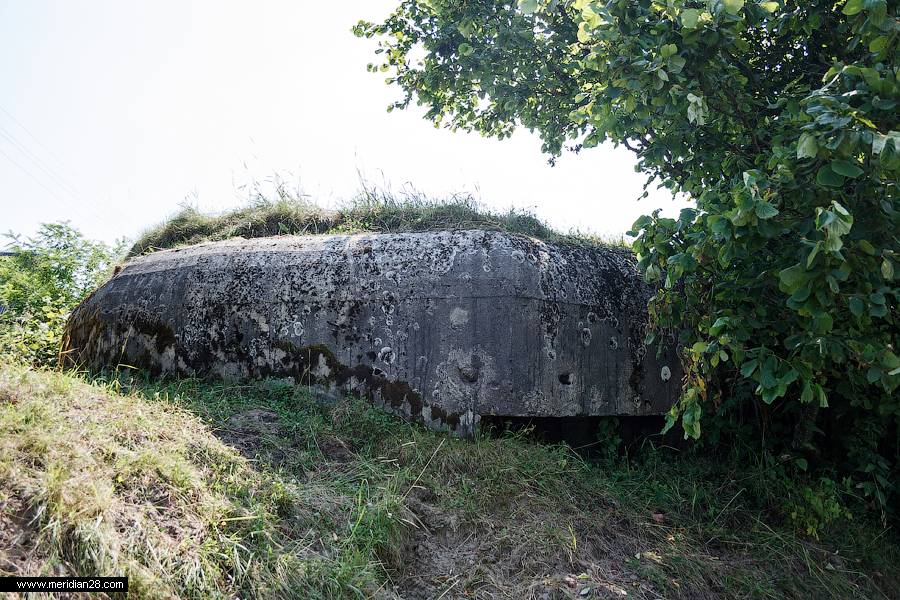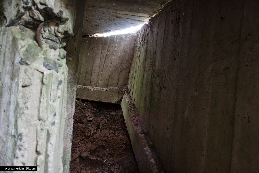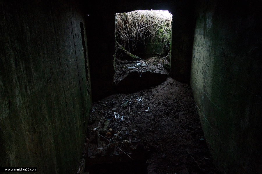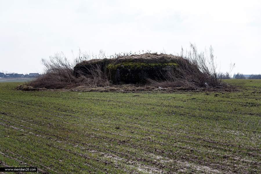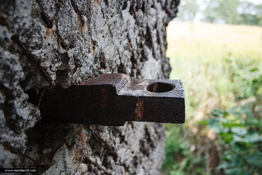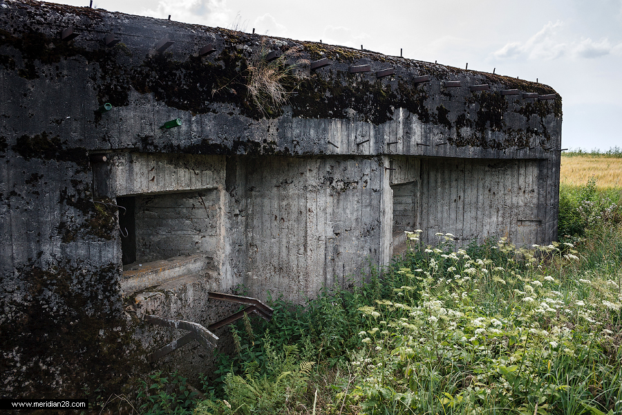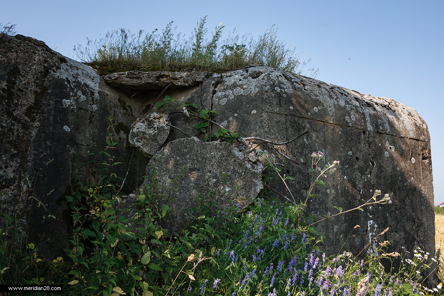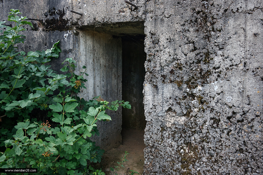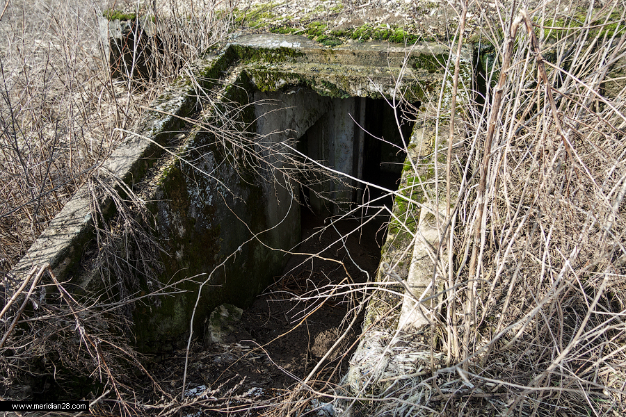 Далее в поле находим следующую огневую точку. На стенах ДОТа переднего края обороны класса защиты М-1 виднеются следы боевых повреждений.