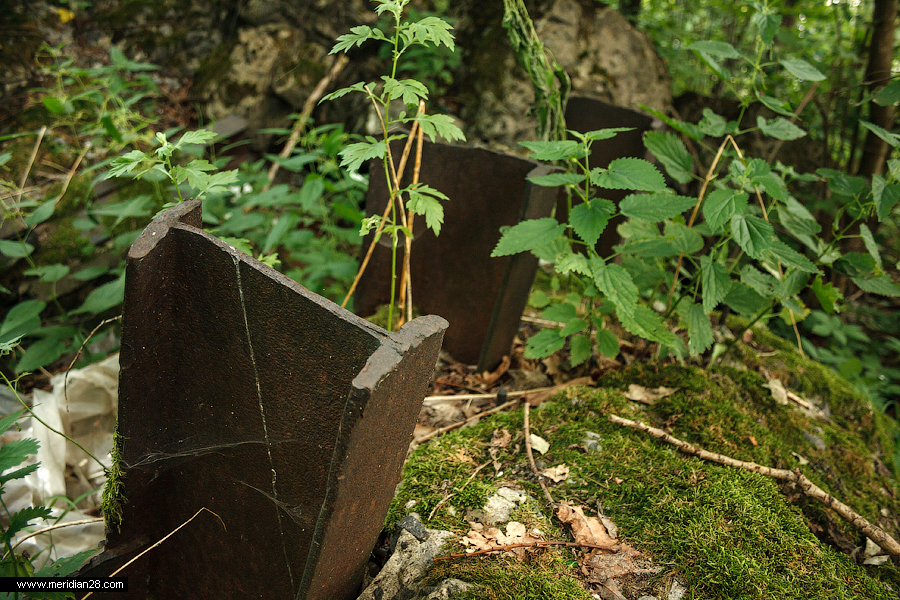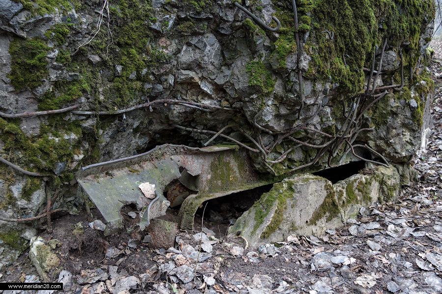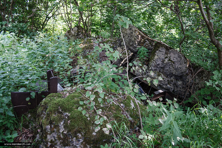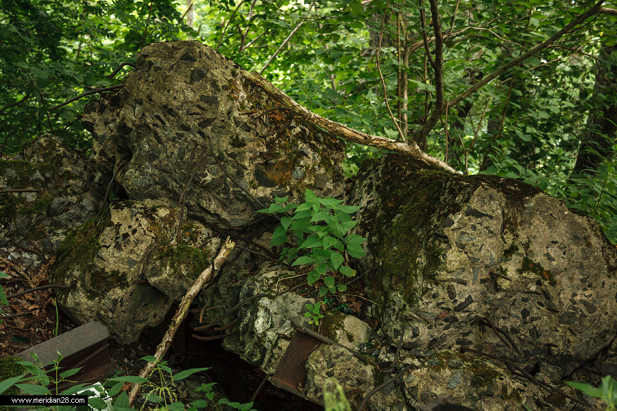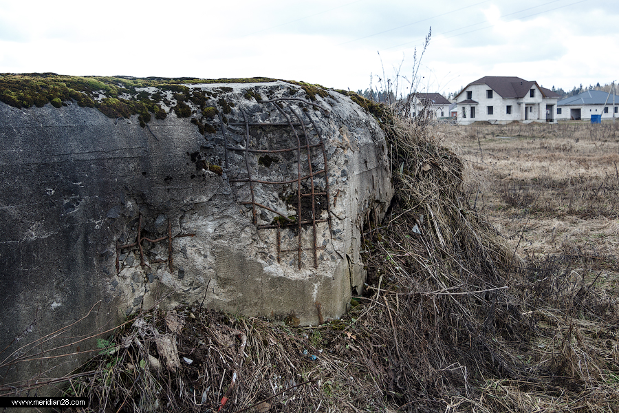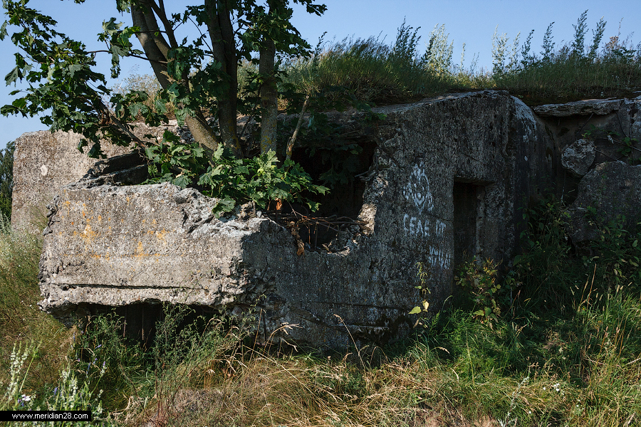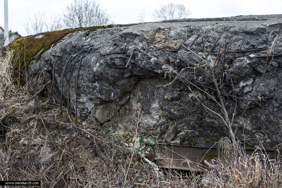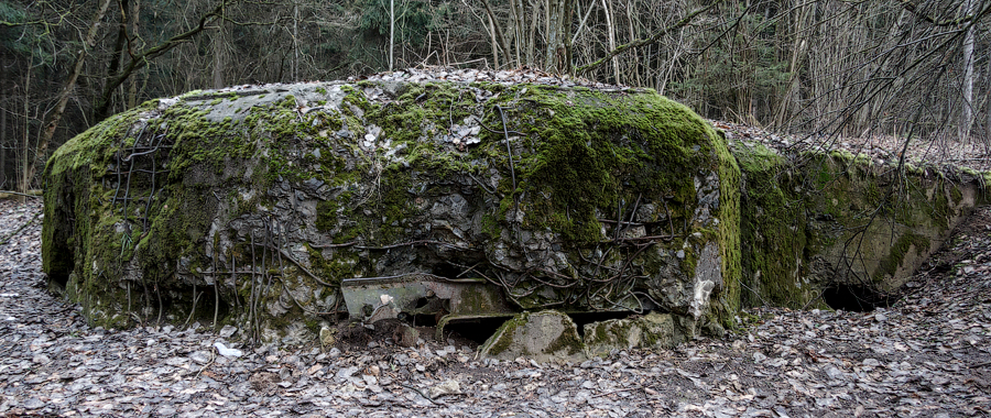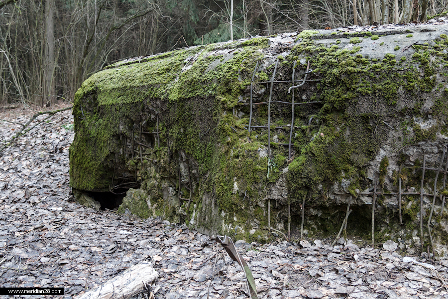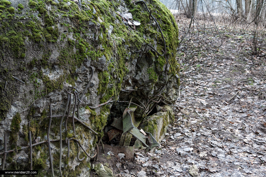 Находим ДОТ № 265. Командно-наблюдательный пункт класса защиты М-3 располагался возле дороги на второй линии обороны укрепрайона. Вероятно, столь выгодное месторасположение послужило причиной его подрыва. Теперь мы вынуждены созерцать лишь осколки ДОТа.