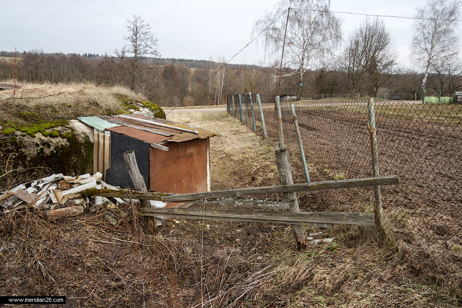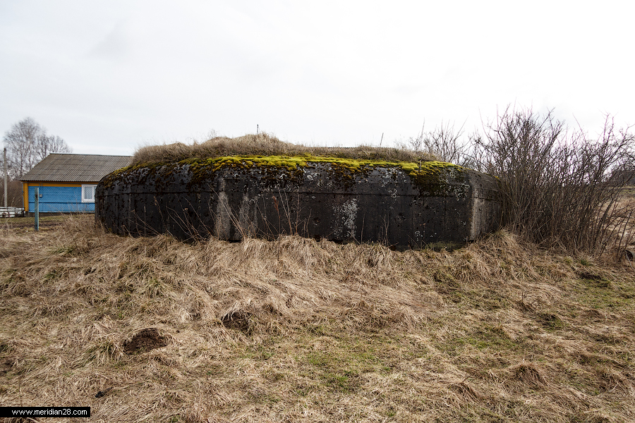 На окраине деревни Большие Новосёлки издалека замечаем огневую точку. ДОТ класса защиты М-2. В настоящий момент сооружение приспособлено под хозяйственную постройку, внутрь попасть проблематично. Огневую точку охраняет звонким лаем пес, который сидит за забором соседнего садового участка.