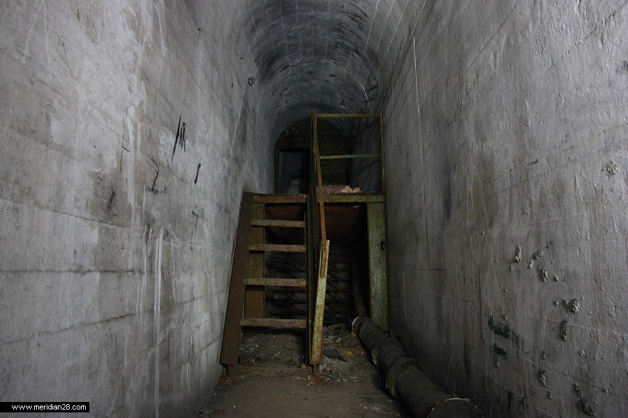 Потерна, ведущая из убежища в кофр, расположенный во внешнем валу. Под лестницей и настилом для уборной, устроенной военными, сохранилась оригинальная кованая лестница начала ХХ века.