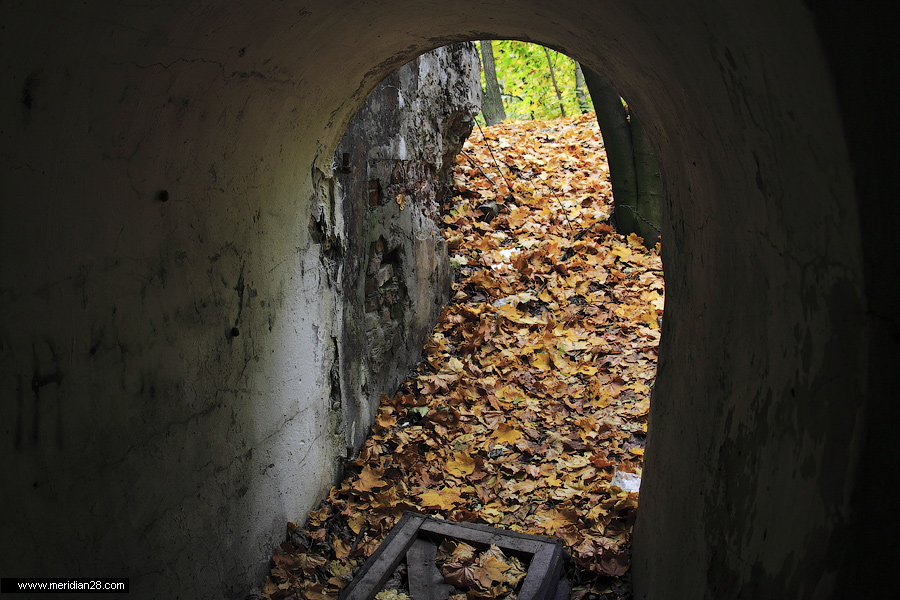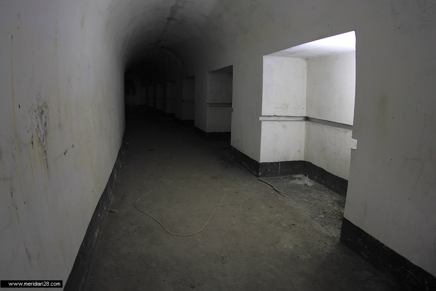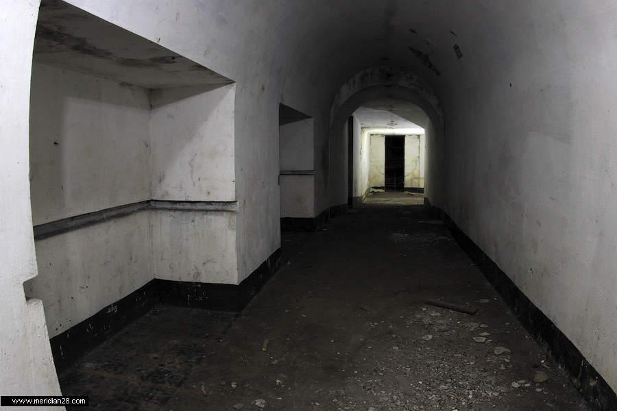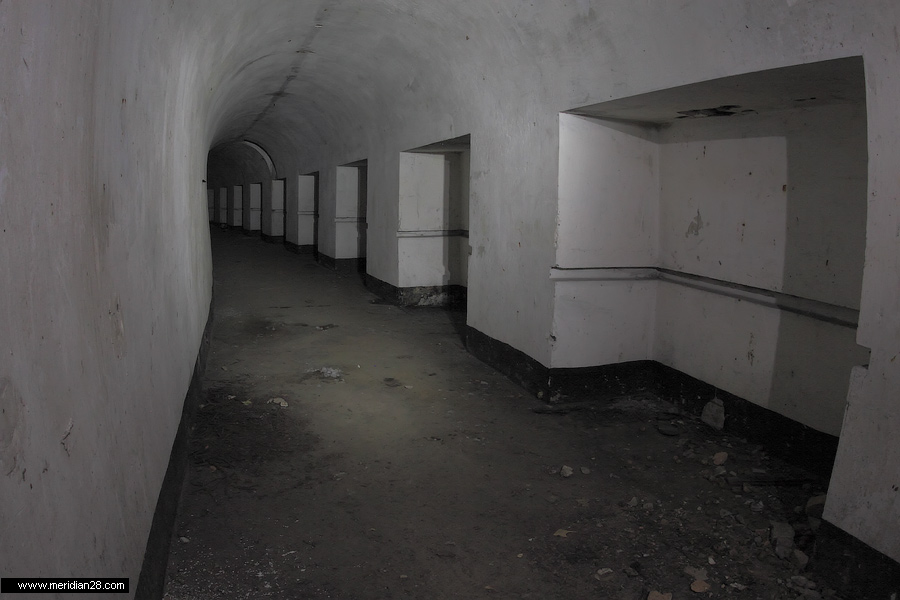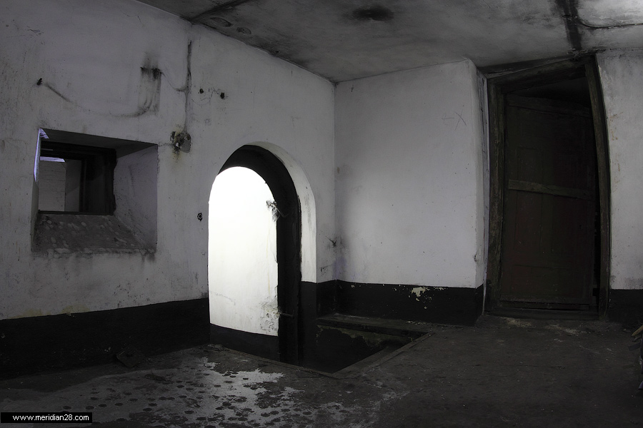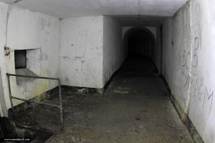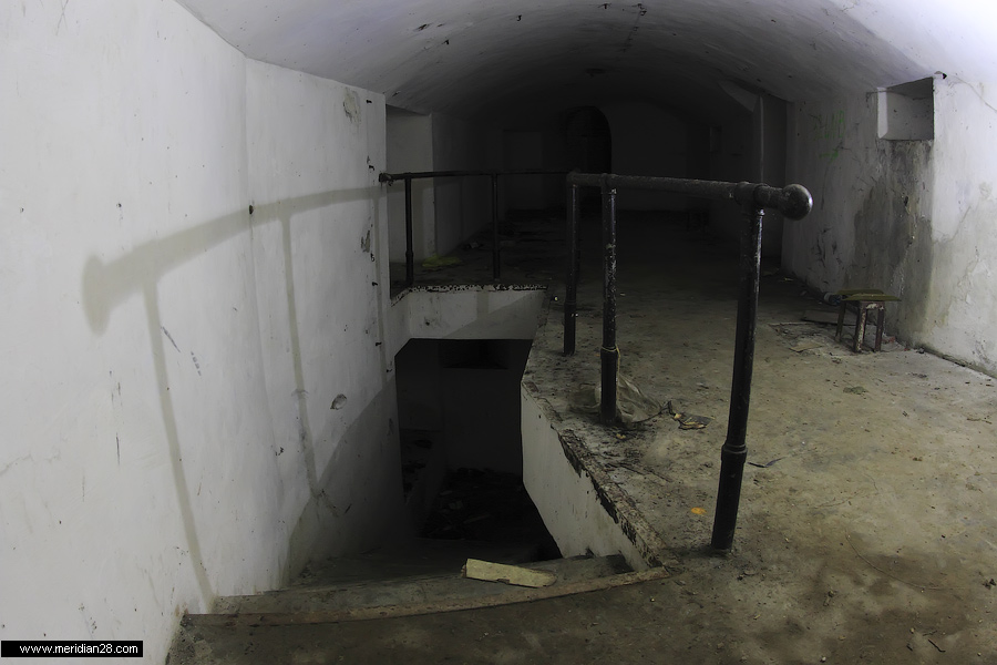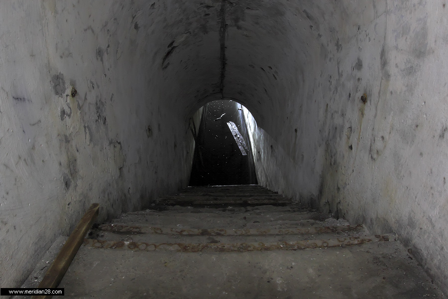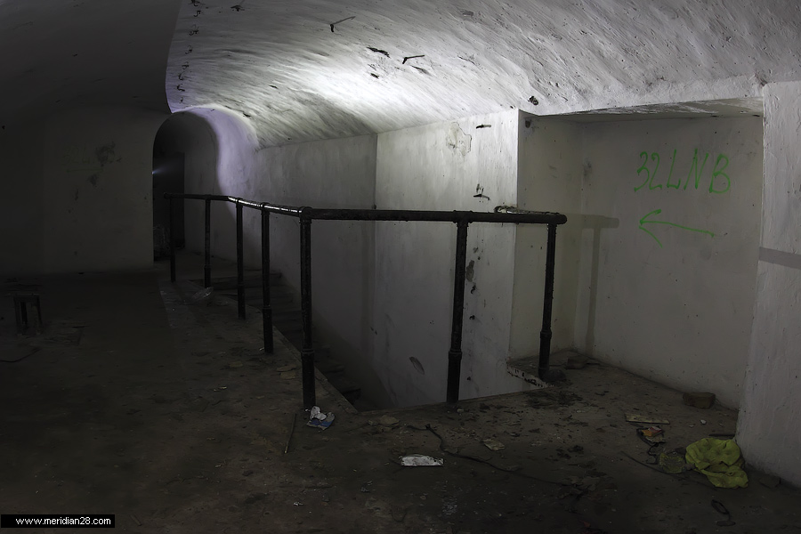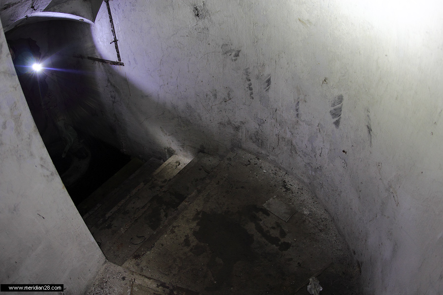 Спуск в центральную потерну. Здесь нужно быть очень внимательным — коридор заполнен водой примерно на 30-40 сантиметров. Возле ступенек вниз расположен достаточно глубокий колодец, куда можно провалиться. Будьте внимательны.