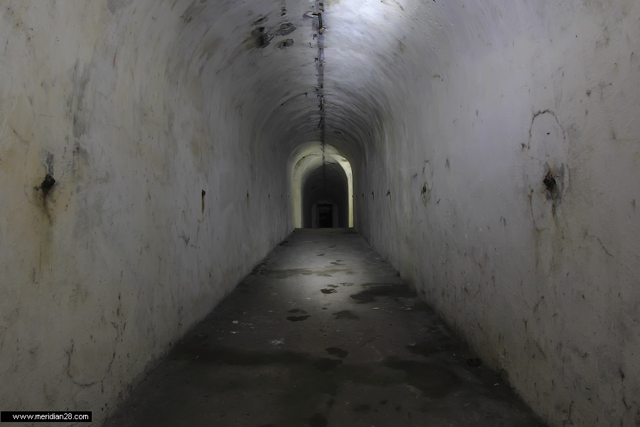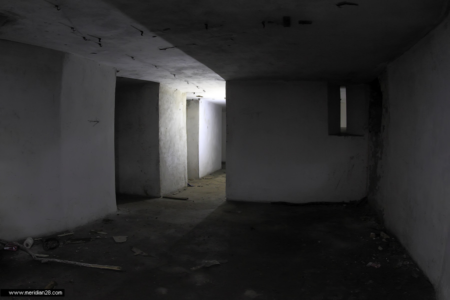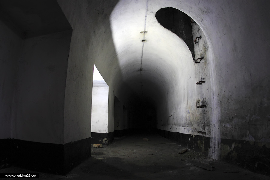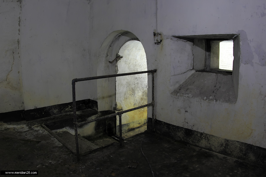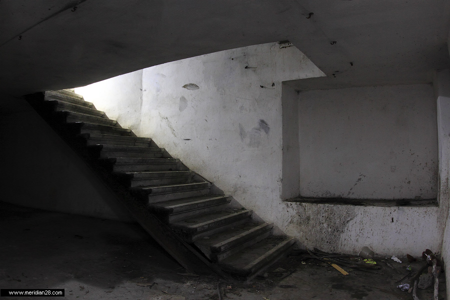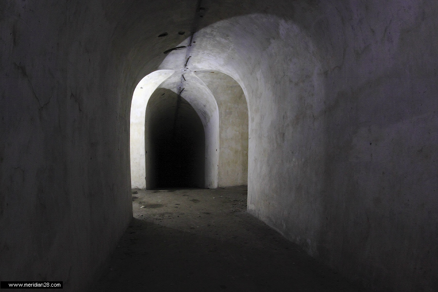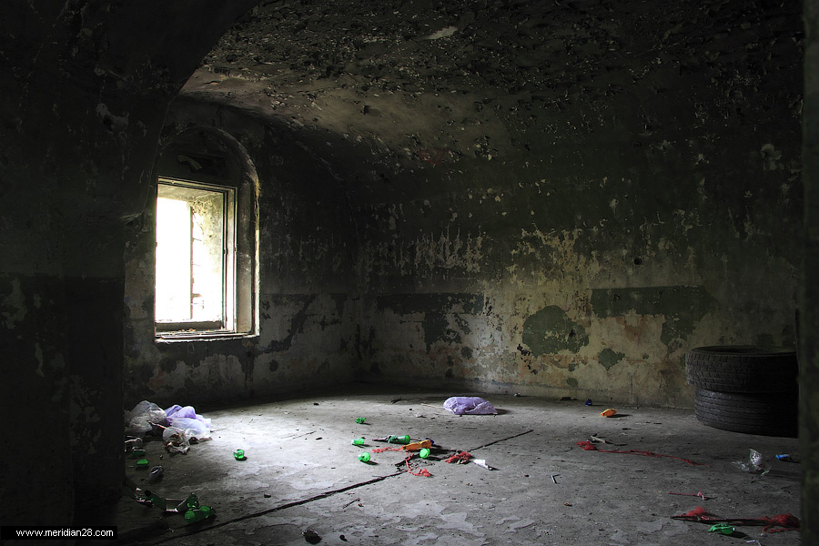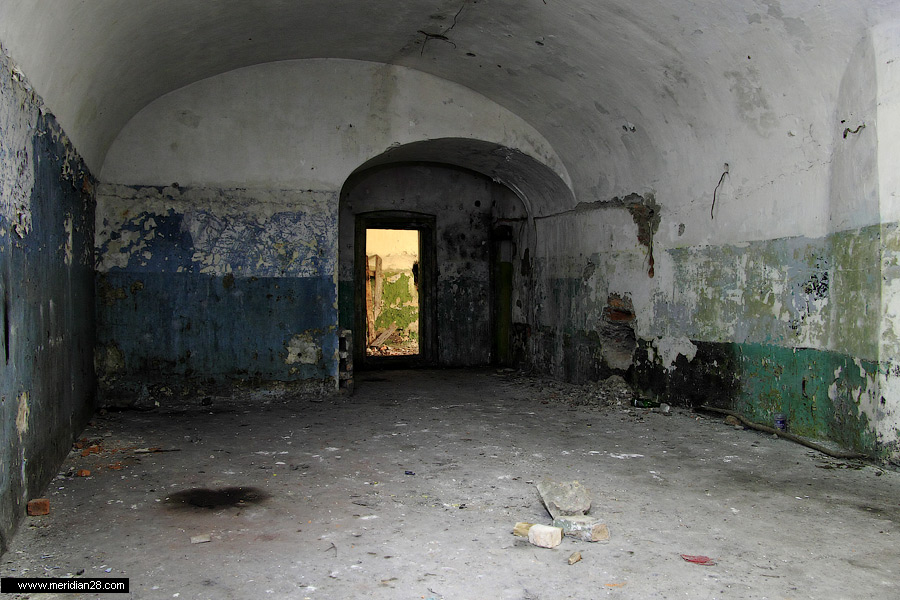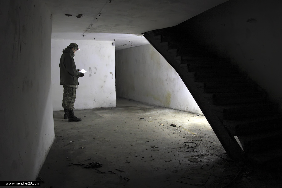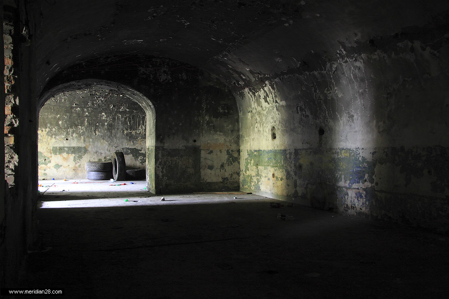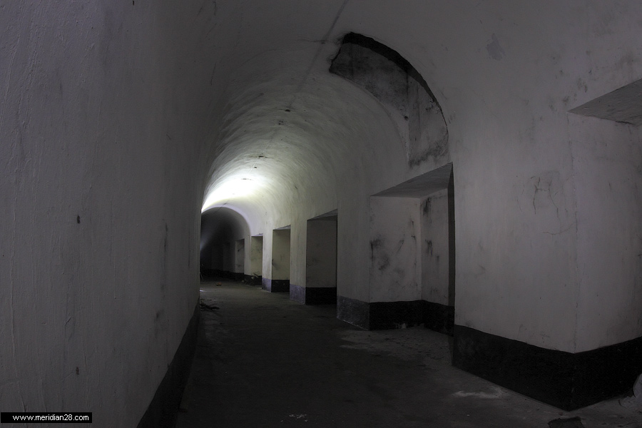 Спуск в центральную потерну. Здесь нужно быть очень внимательным — коридор заполнен водой примерно на 30-40 сантиметров. Возле ступенек вниз расположен достаточно глубокий колодец, куда можно провалиться. Будьте внимательны.