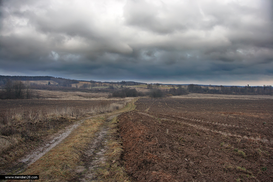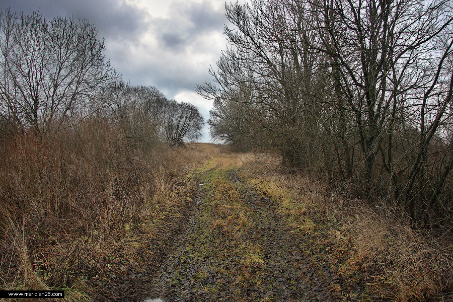 Хмурое пасмурное утро. Разбитая дорога, ведущая от деревни к артиллерийской позиции. Дальше идем пешком.