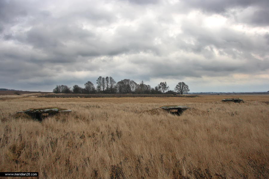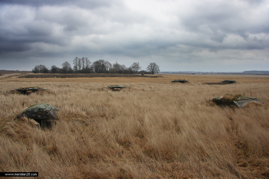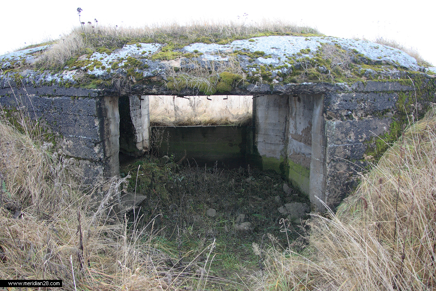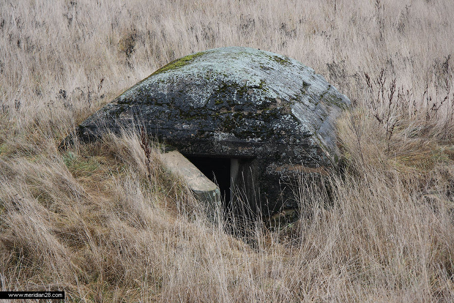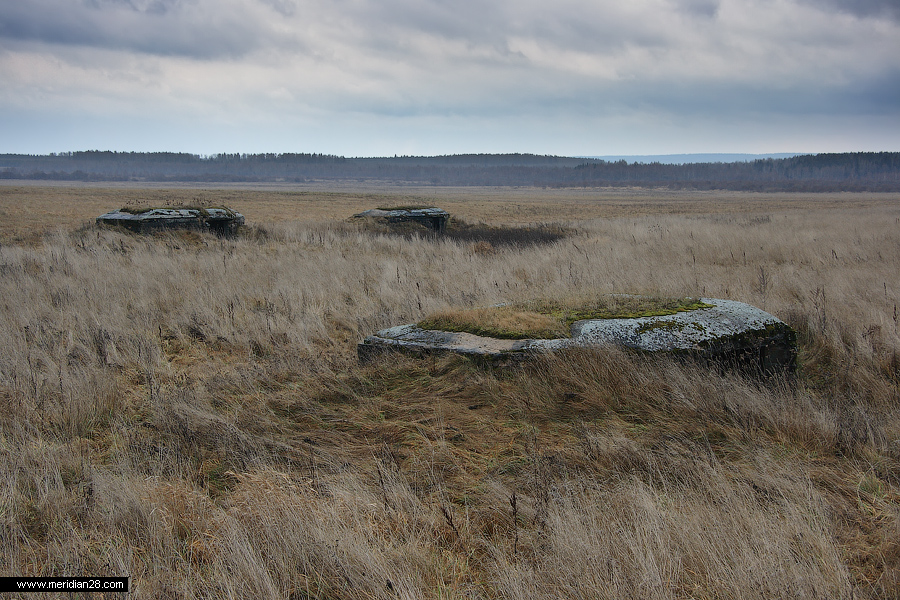 Пришли. На пологой возвышенности расположены 4 орудийных полукапонира для легкой артиллерии, 3 блиндажа для наблюдения и одно большое укрытие для личного состава. Орудийные полукапониры стоят группами по два сооружения, между которыми 30 метров. Расстояние между группами 60 метров. За ними линией расположены небольшие блиндажи, вероятно, для наблюдения. Казарма стоит за блиндажами.