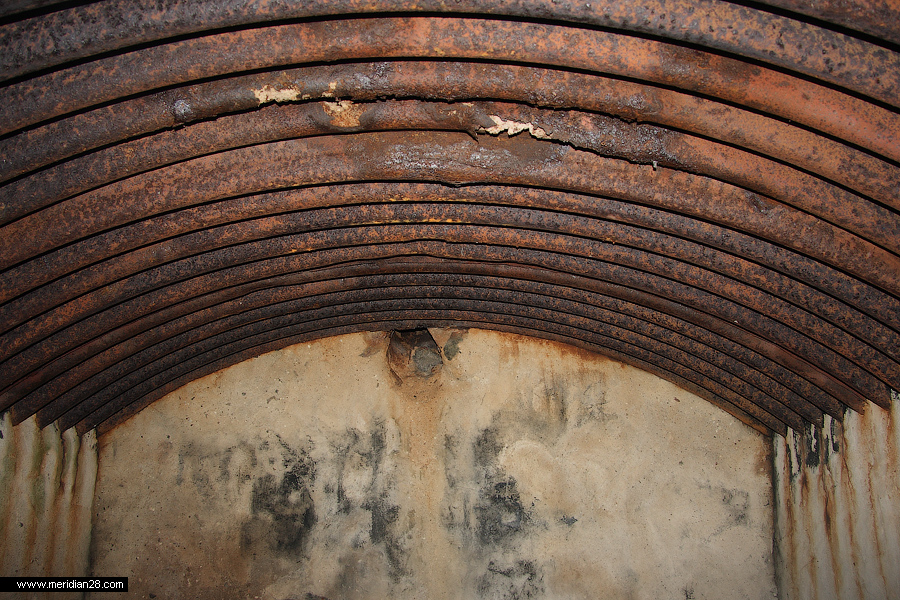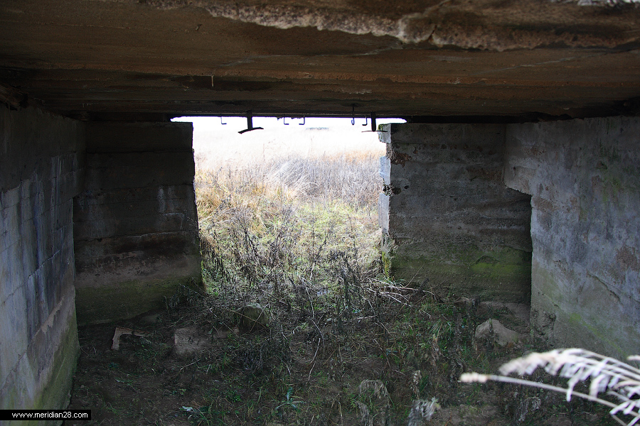 По бокам расположены небольшие помещения, возможно, убежища или места для хранения боеприпасов. На потолке заметны металлические опоры, которые могли применяться при установке орудия.