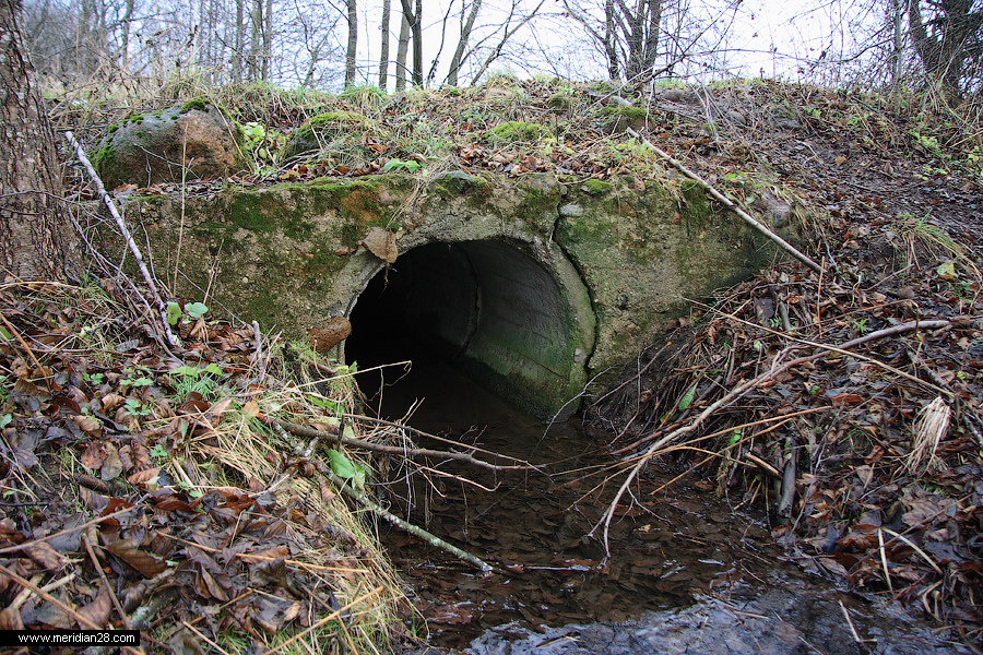 Труба, по которой протекает ручей под дорогой. Вероятно, что это дело рук немецких инженеров.