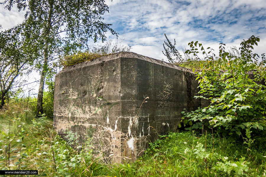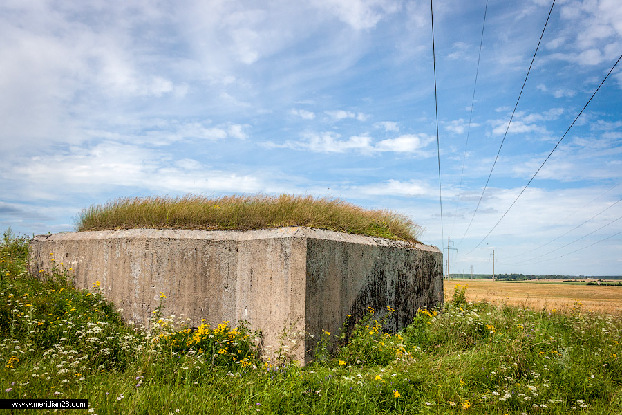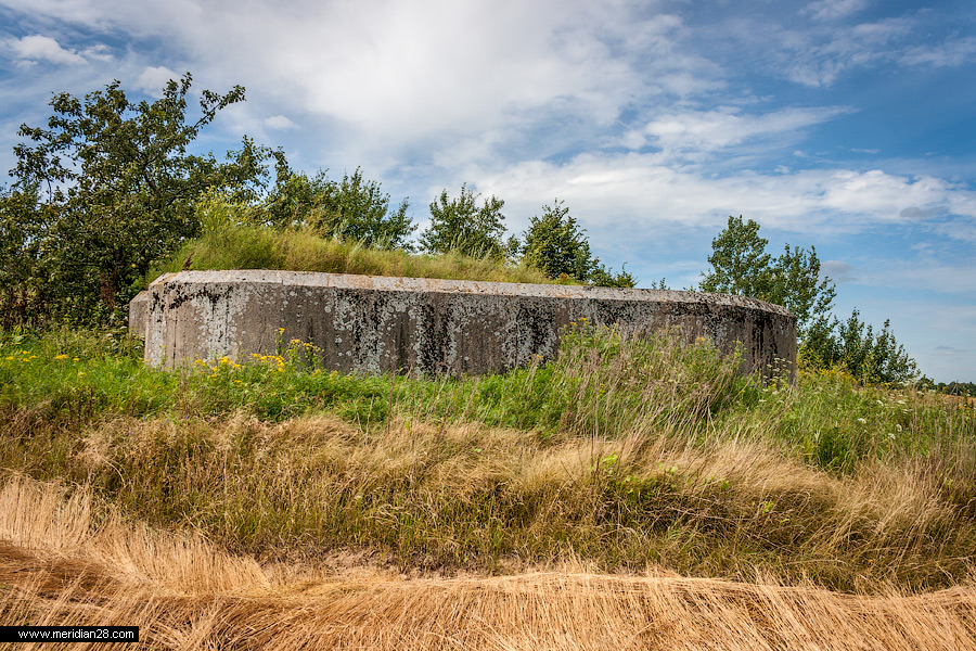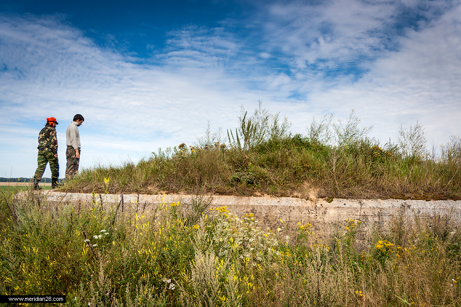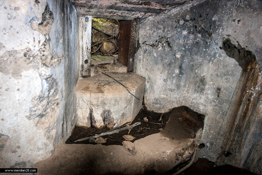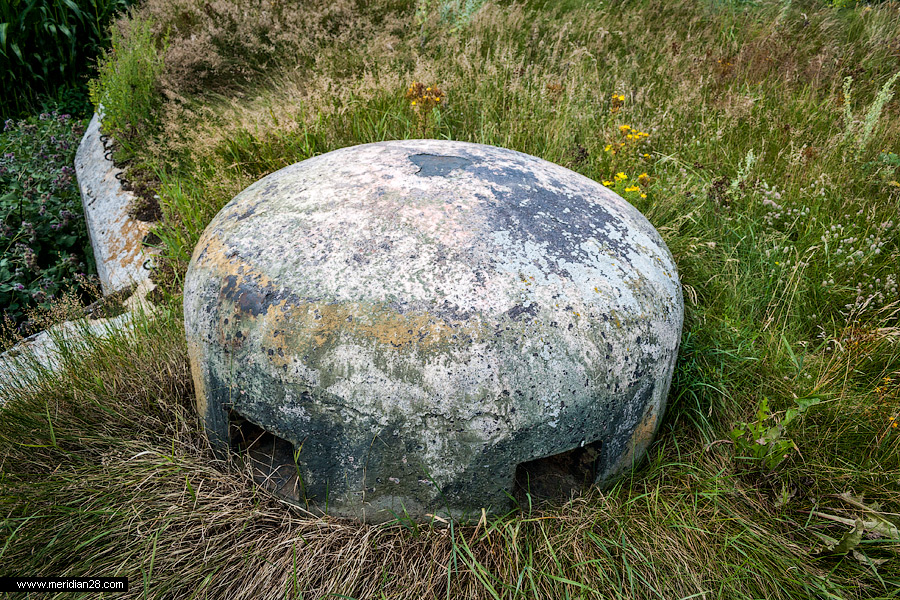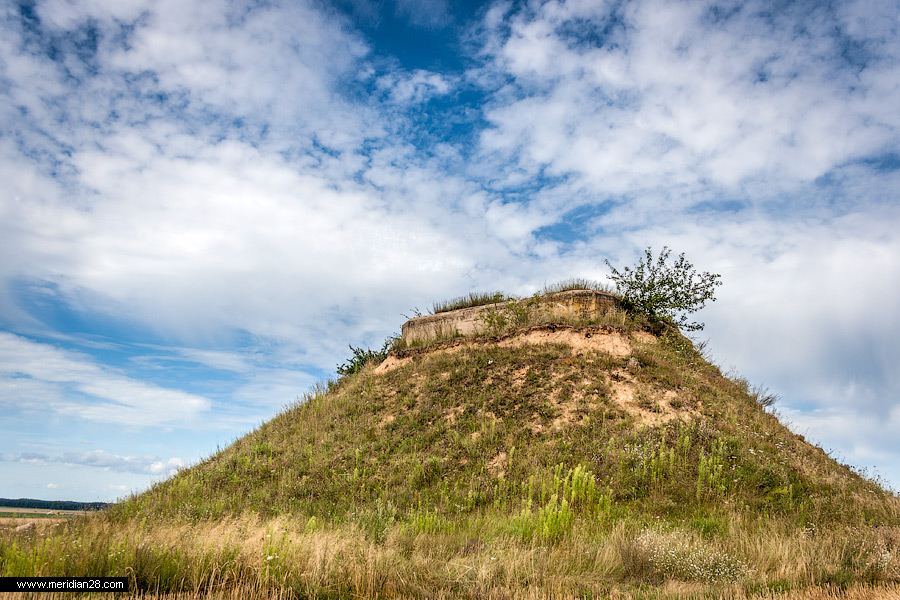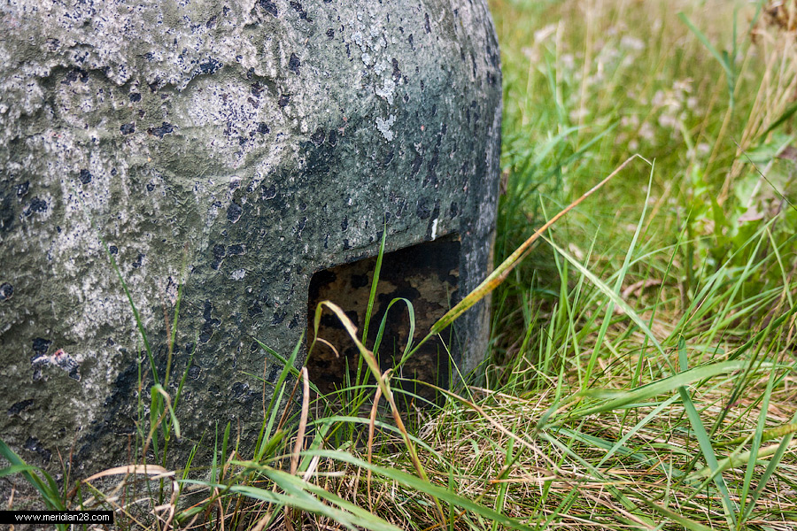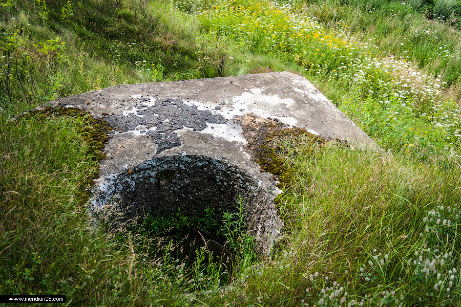 Следующая точка № 10, стоящая прямо у дороги, сейчас полностью засыпана и превращена в помойку, поэтому мы двигаемся дальше к командно-наблюдательному пункту № 24, который находится на высокой искусственной насыпи посреди поля. Подойдя ближе, замечаем, что в ДОТе был серьезный внутренний взрыв, который повредил все стены внутри огневой точки и вырвал основание двенадцатисантиметрового бронеколпака. Рядом с бронеколпаком была обнаружена шахта для перископа. Сам КНП не должен был быть вооружен, он использовался для корректировки огня и был местом дислоцирования командира батальона.