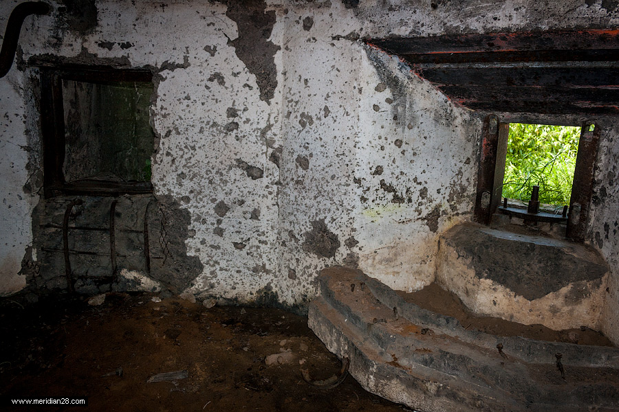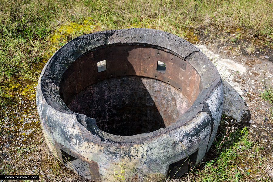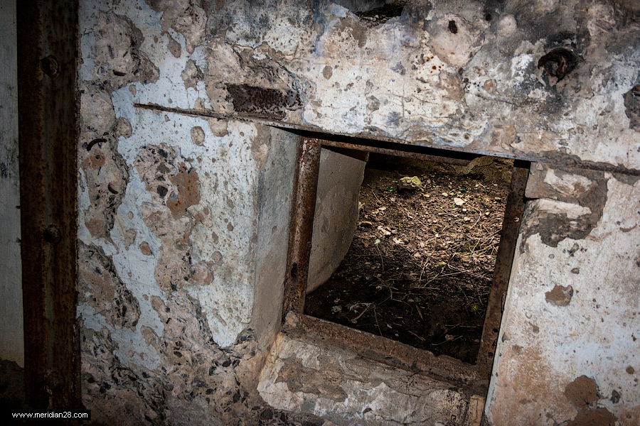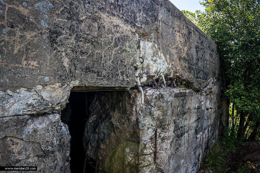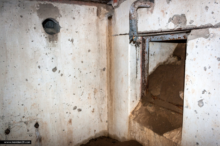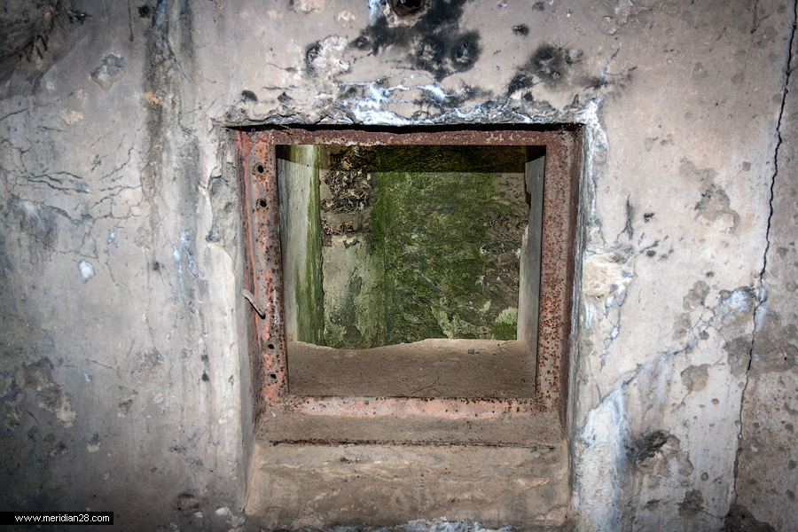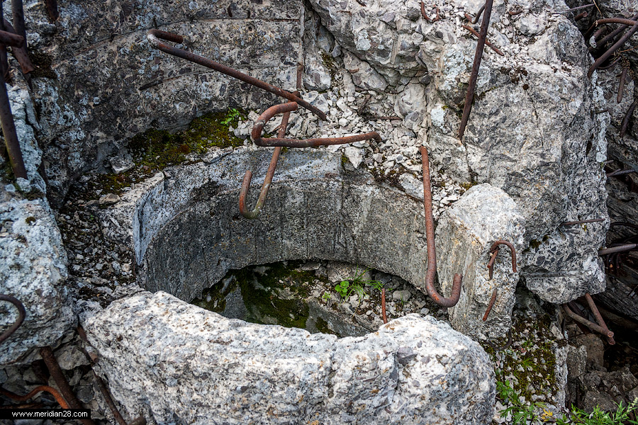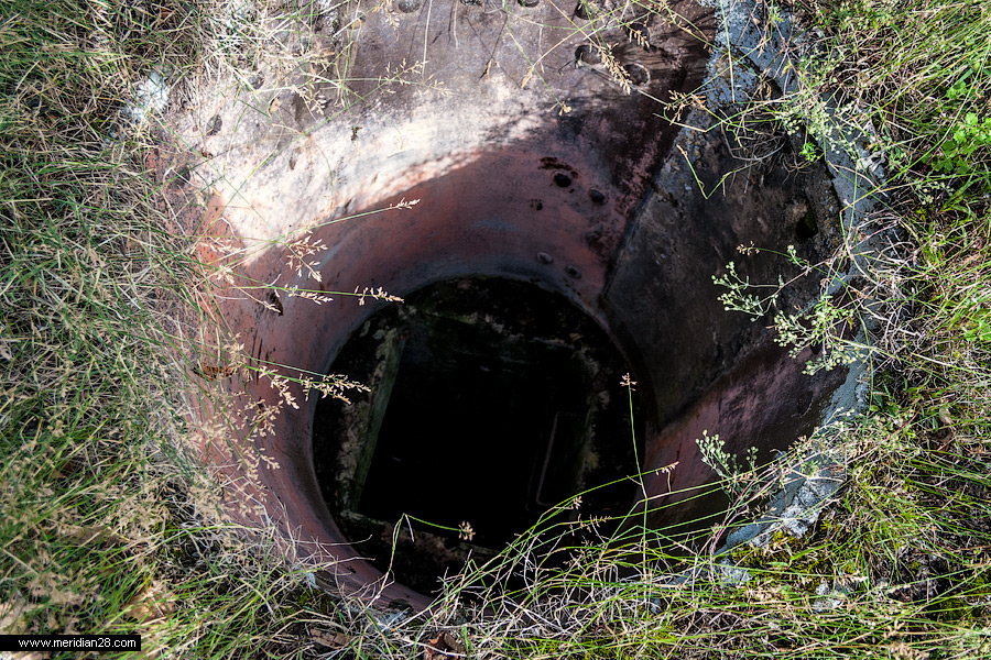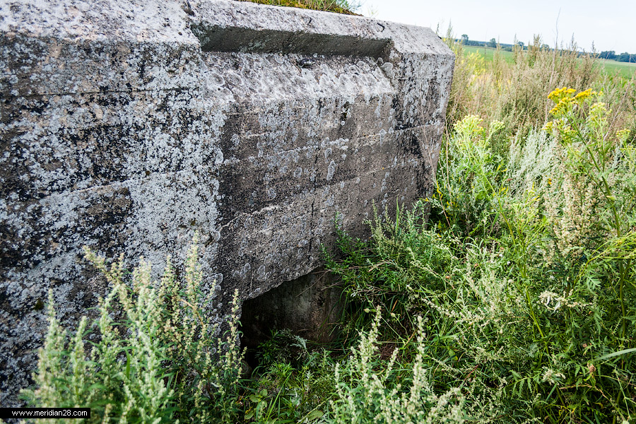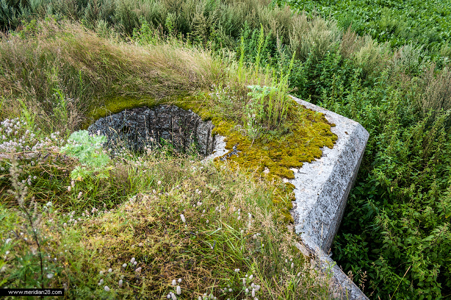 Следующая точка № 10, стоящая прямо у дороги, сейчас полностью засыпана и превращена в помойку, поэтому мы двигаемся дальше к командно-наблюдательному пункту № 24, который находится на высокой искусственной насыпи посреди поля. Подойдя ближе, замечаем, что в ДОТе был серьезный внутренний взрыв, который повредил все стены внутри огневой точки и вырвал основание двенадцатисантиметрового бронеколпака. Рядом с бронеколпаком была обнаружена шахта для перископа. Сам КНП не должен был быть вооружен, он использовался для корректировки огня и был местом дислоцирования командира батальона.