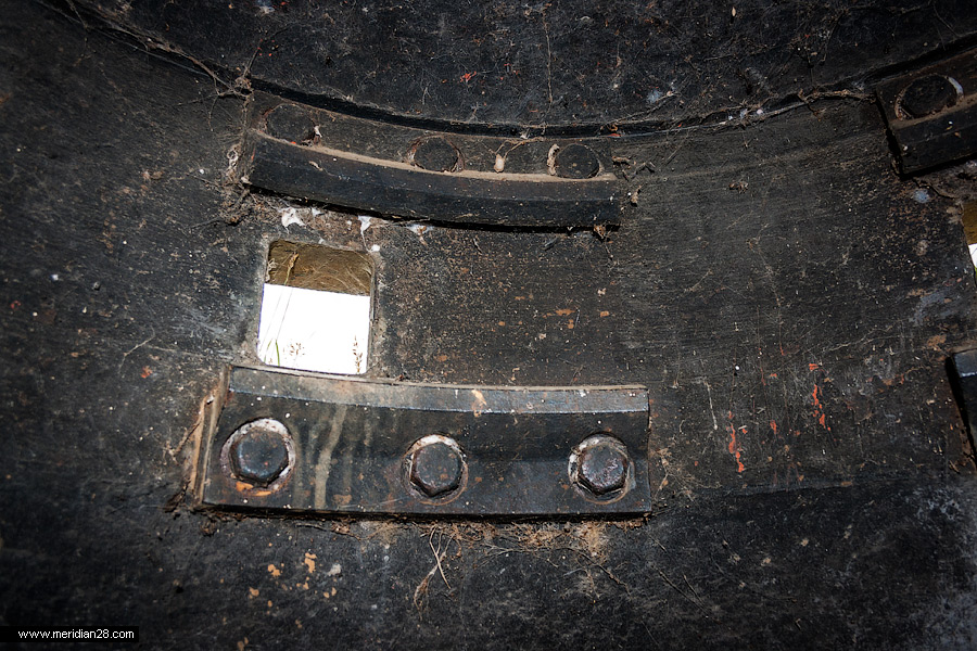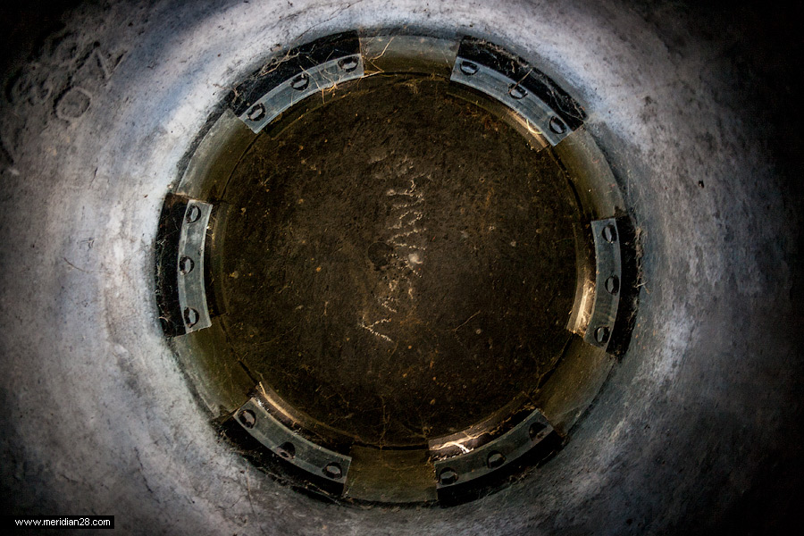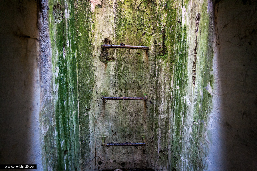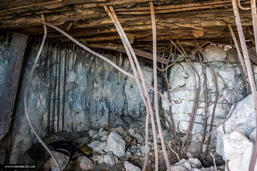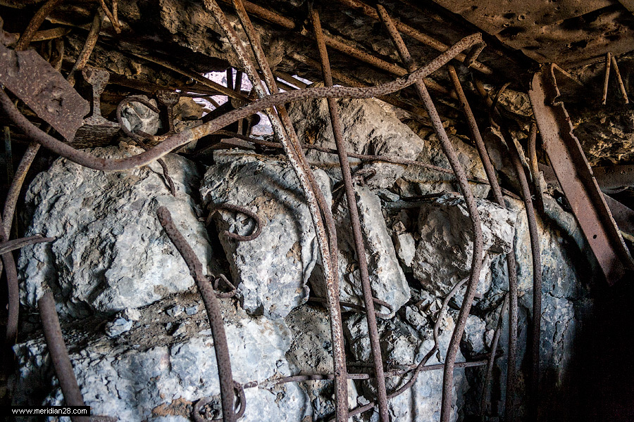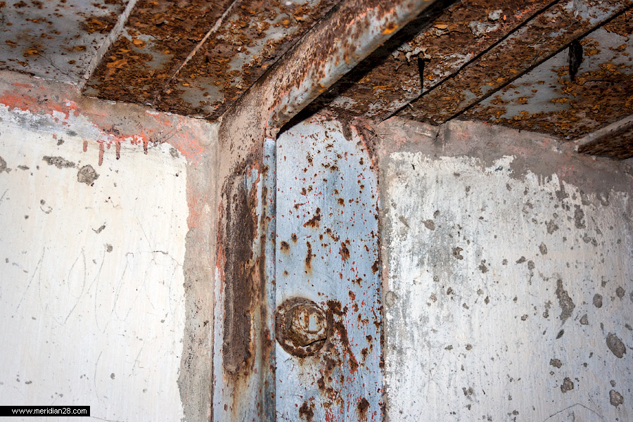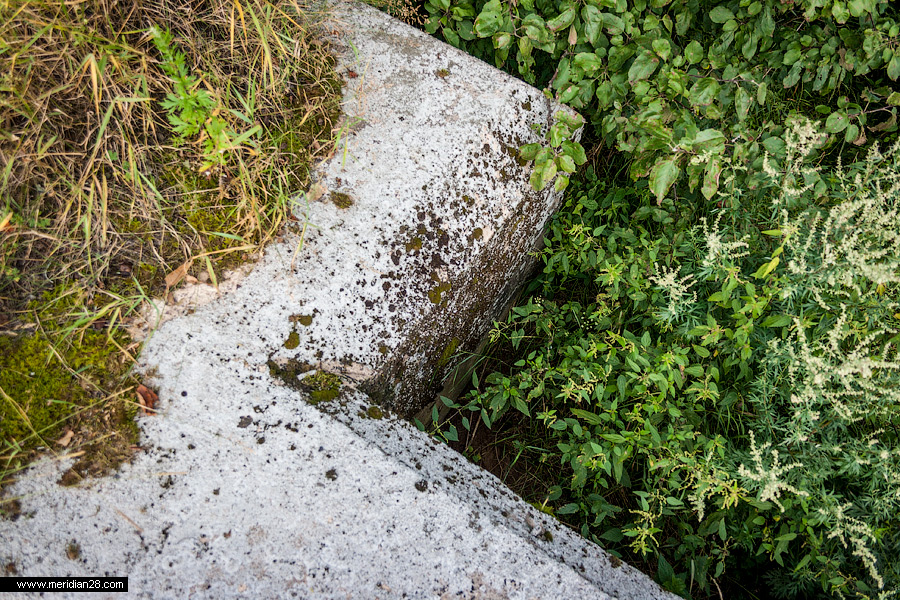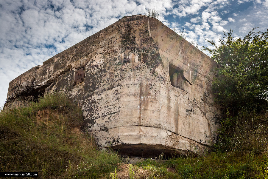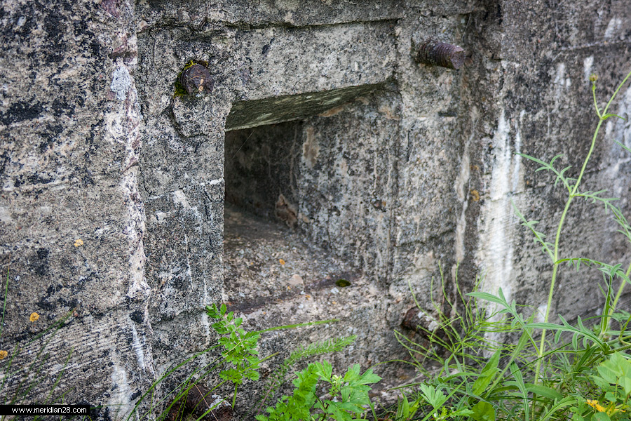 Следующая точка № 10, стоящая прямо у дороги, сейчас полностью засыпана и превращена в помойку, поэтому мы двигаемся дальше к командно-наблюдательному пункту № 24, который находится на высокой искусственной насыпи посреди поля. Подойдя ближе, замечаем, что в ДОТе был серьезный внутренний взрыв, который повредил все стены внутри огневой точки и вырвал основание двенадцатисантиметрового бронеколпака. Рядом с бронеколпаком была обнаружена шахта для перископа. Сам КНП не должен был быть вооружен, он использовался для корректировки огня и был местом дислоцирования командира батальона.