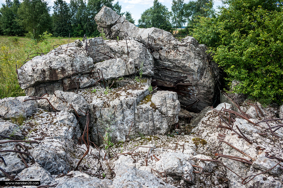 Далее переходим дорогу и обнаруживаем руины следующей точки № 15. Мощный взрыв превратил многотонный ДОТ в кучу камней. Целым там не сохранилось ничего. После непродолжительного обеда выдвигаемся по цепочке из ДОТов в направлении деревни Малое Подлесье. Первой на нашем пути в этом направлении стала точка № 7. Внутри заметны следы мощного взрыва и, судя по гари и запаху, недавнего пожара — видимо, местные жители решили что-то поджечь внутри ДОТа. Двигаемся дальше.