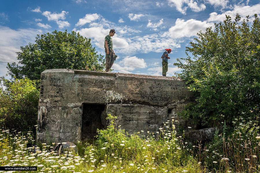 В 8 часов утра мы прибыли на место назначения — район станции Федюки. До первой точки нужно было идти порядка километра. Выйдя в огромное поле, которое было засажено всем сразу, двигаемся к самому первому на сегодня ДОТу № 13. Точки не было видно даже с 20 метров, однако GPS не соврал. Подойдя ближе, мы стали различать очертания укрепления. Взобравшись на крышу, заметили отверстия для установки двух бронеколпаков — по разные фланги ДОТа, рядом с амбразурами. Примечательно, что в некоторые бронеколпаки были свои отдельные входы. Боевые казематы связывались с бронеколпаком небольшим ходом, который закрывался бронированным люком.