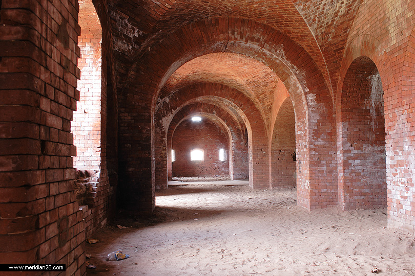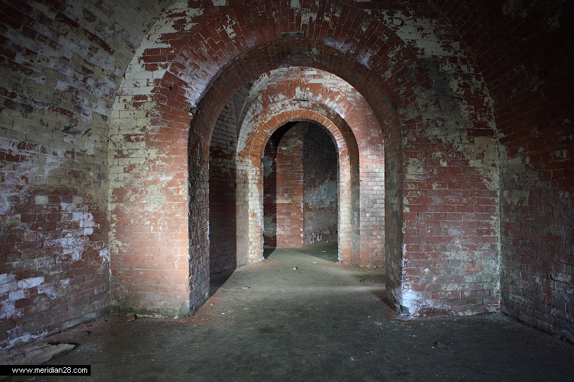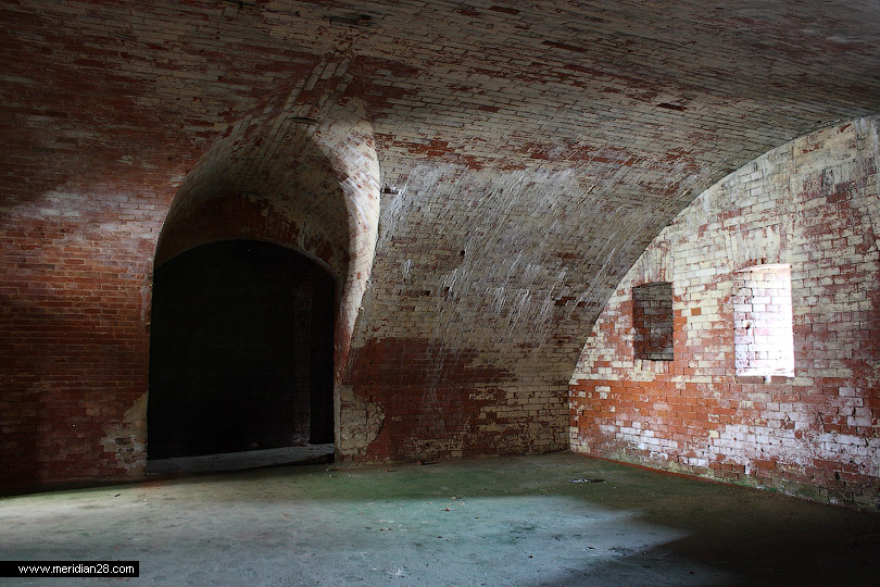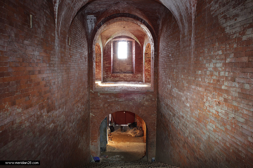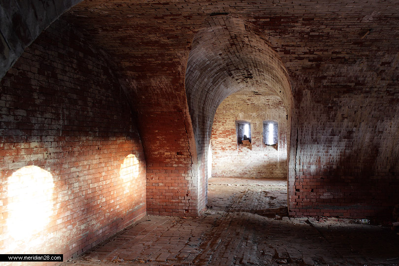 Следующее сооружение — редюит с пристроенным капониром в горже равелина. Оно также закрыто, однако нам удалось попасть внутрь через одну из бойниц. Эта часть крепости вовсю реставрируется — замечена новая кирпичная кладка.
