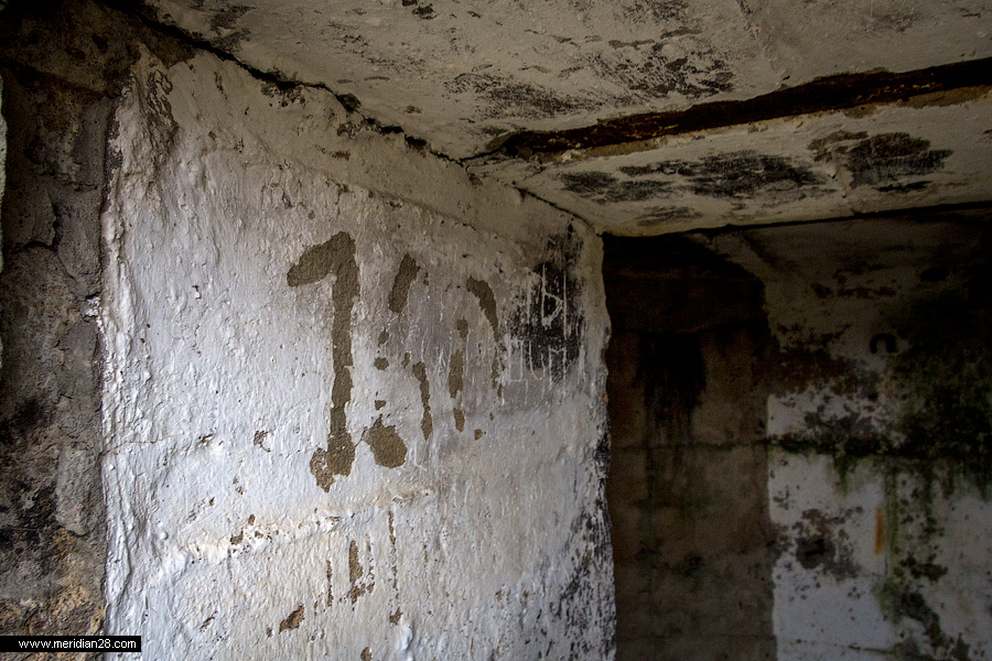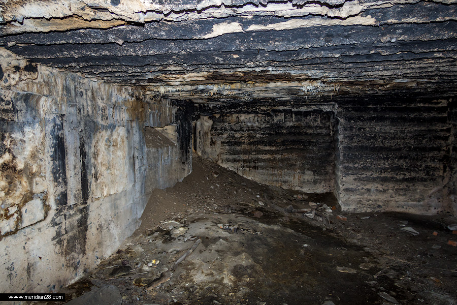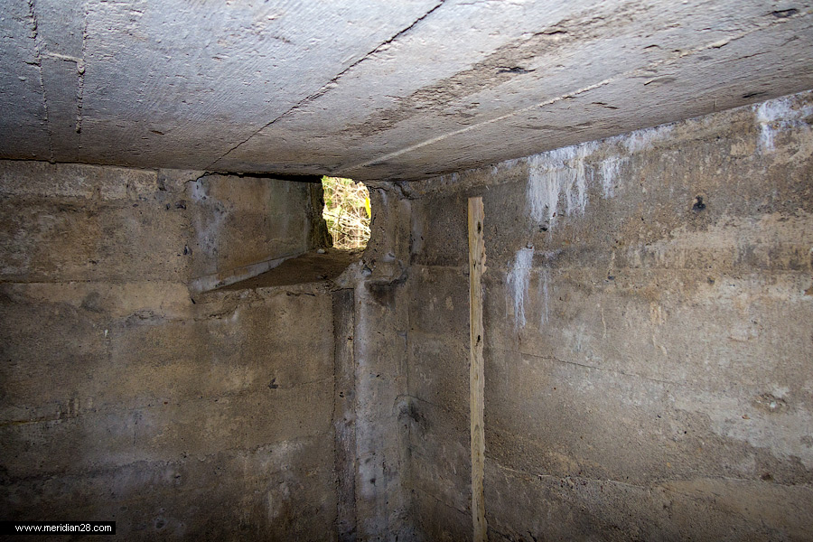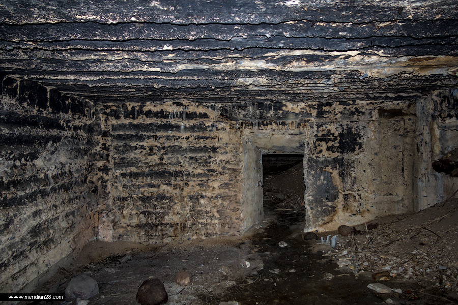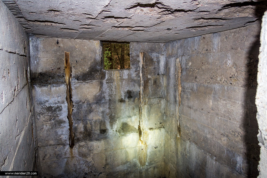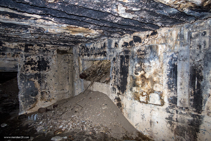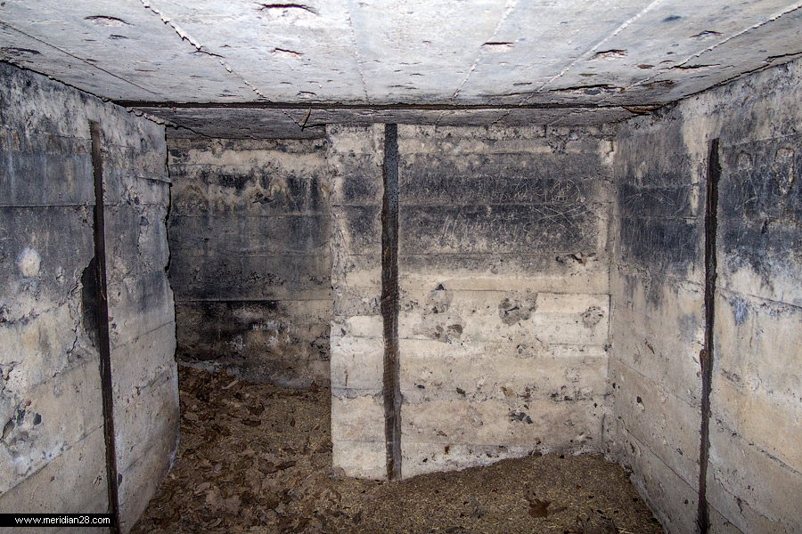 Внутри уничтожены все перегородки. В полноценном виде здесь должны присутствовать два вспомогательных помещения — для хранения боеприпасов и для укрытия личного состава расчета. Вероятно, что внутри был произведен взрыв, возможно, после войны.