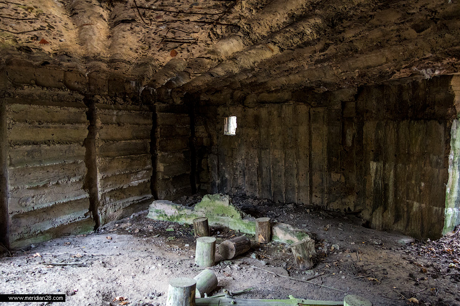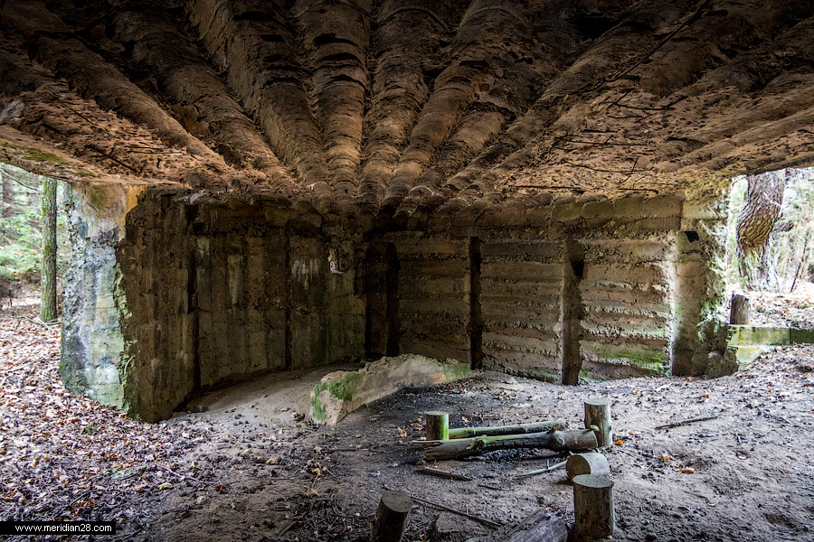 Внутри видны ниши и направляющие от бревенчатой опалубки. По качеству строительства заметно, что убежище возводилось спешно в условиях активных боевых действий.