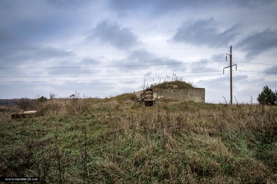 Через пару сотен метров мы натыкаемся на крупное бетонное сооружение. С большой долей вероятности можно утверждать, что здесь располагался гаубичный расчет. Мы уже встречали подобные сооружения к северу отсюда — в Залужье.