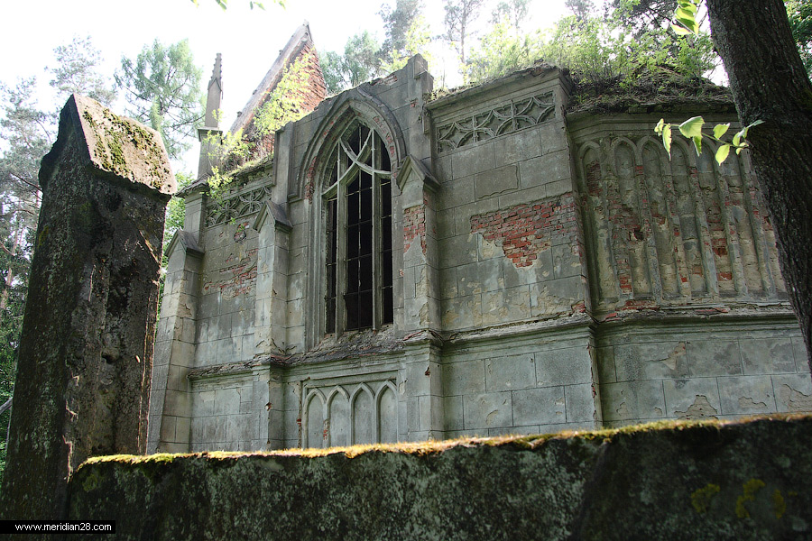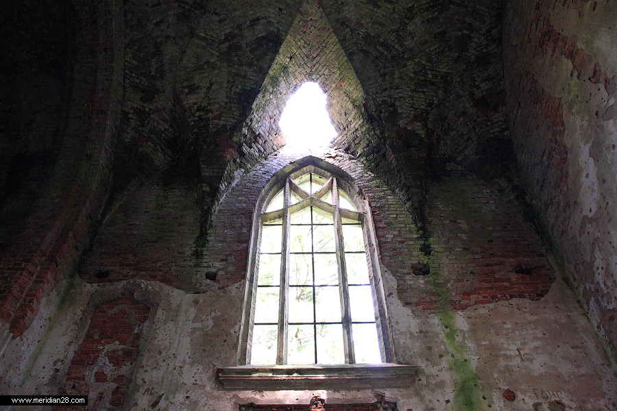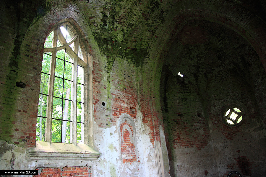 Боковые фасады завершены лепным ромбовидным фризом, окна большие стрельчатые с готическими переплетами. Интерьер свода украшен сплетениями нервюр.