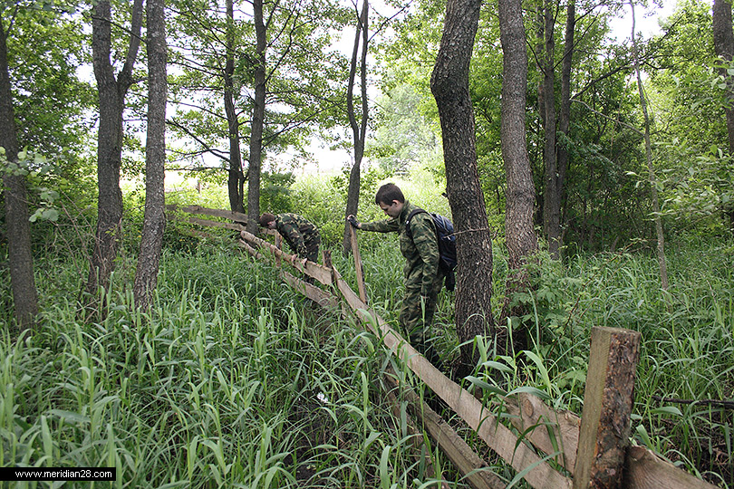 Двигаемся дальше. Путь перерезает небольшая речушка, которую можно перейти только по стоящей рядом изгороди. Ноги не намочили.