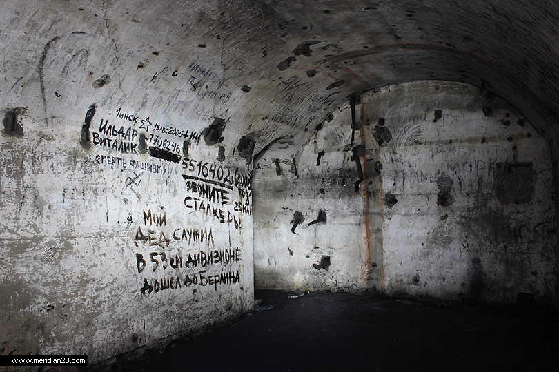 Все сооружение «вмонтировано» в холм. После войны жители приспособили этот холм для кладбища. Мы сейчас находимся под кладбищем. Потерна тянется примерно на 50 метров.